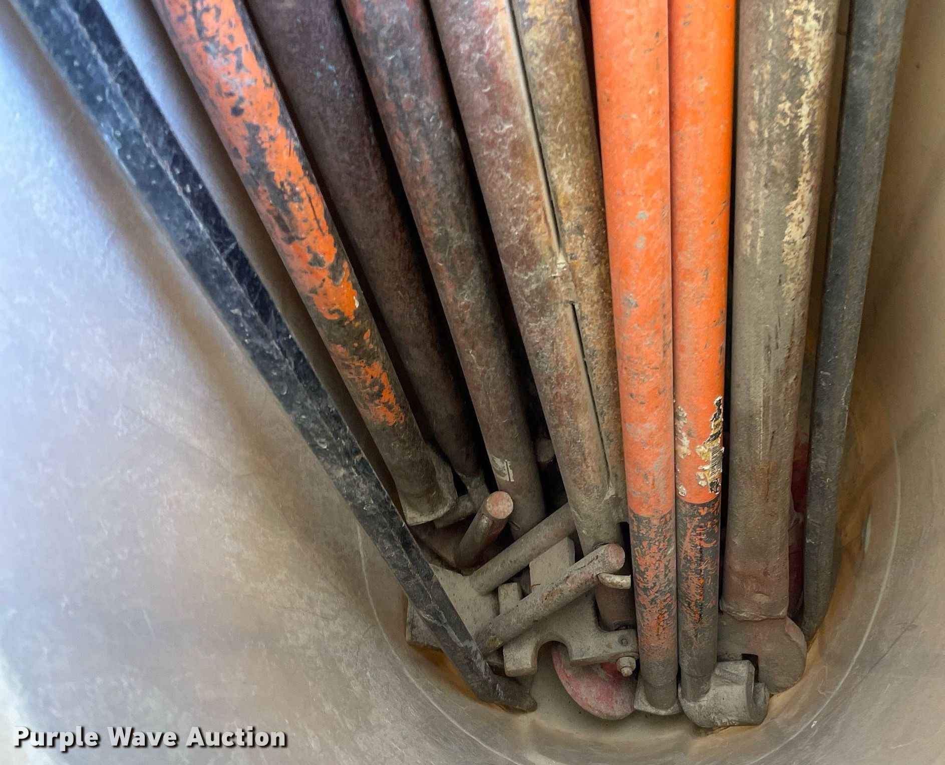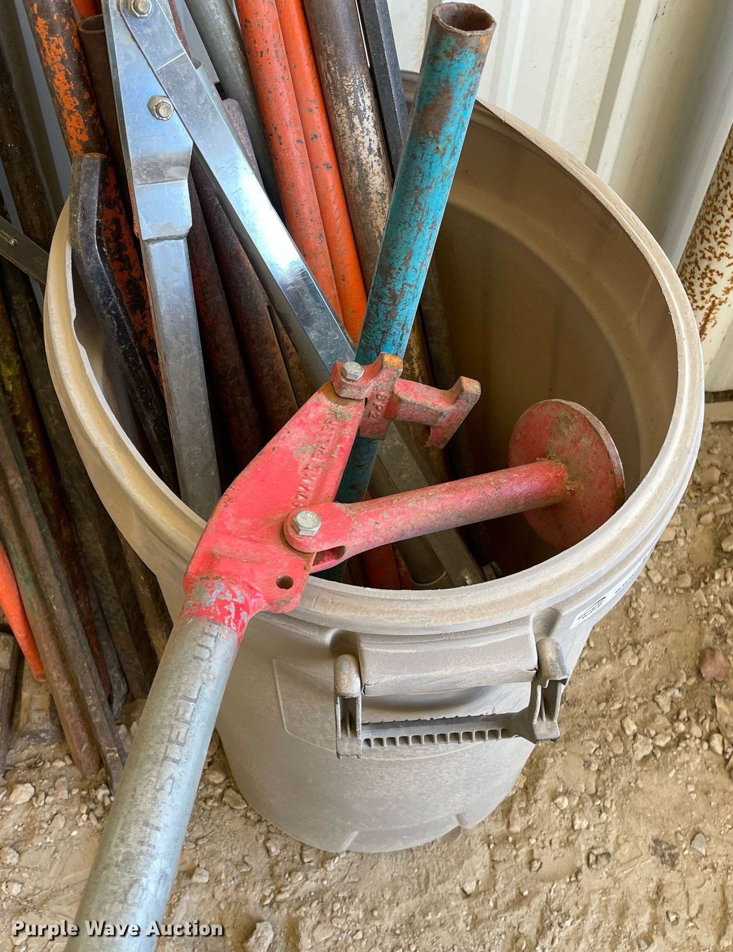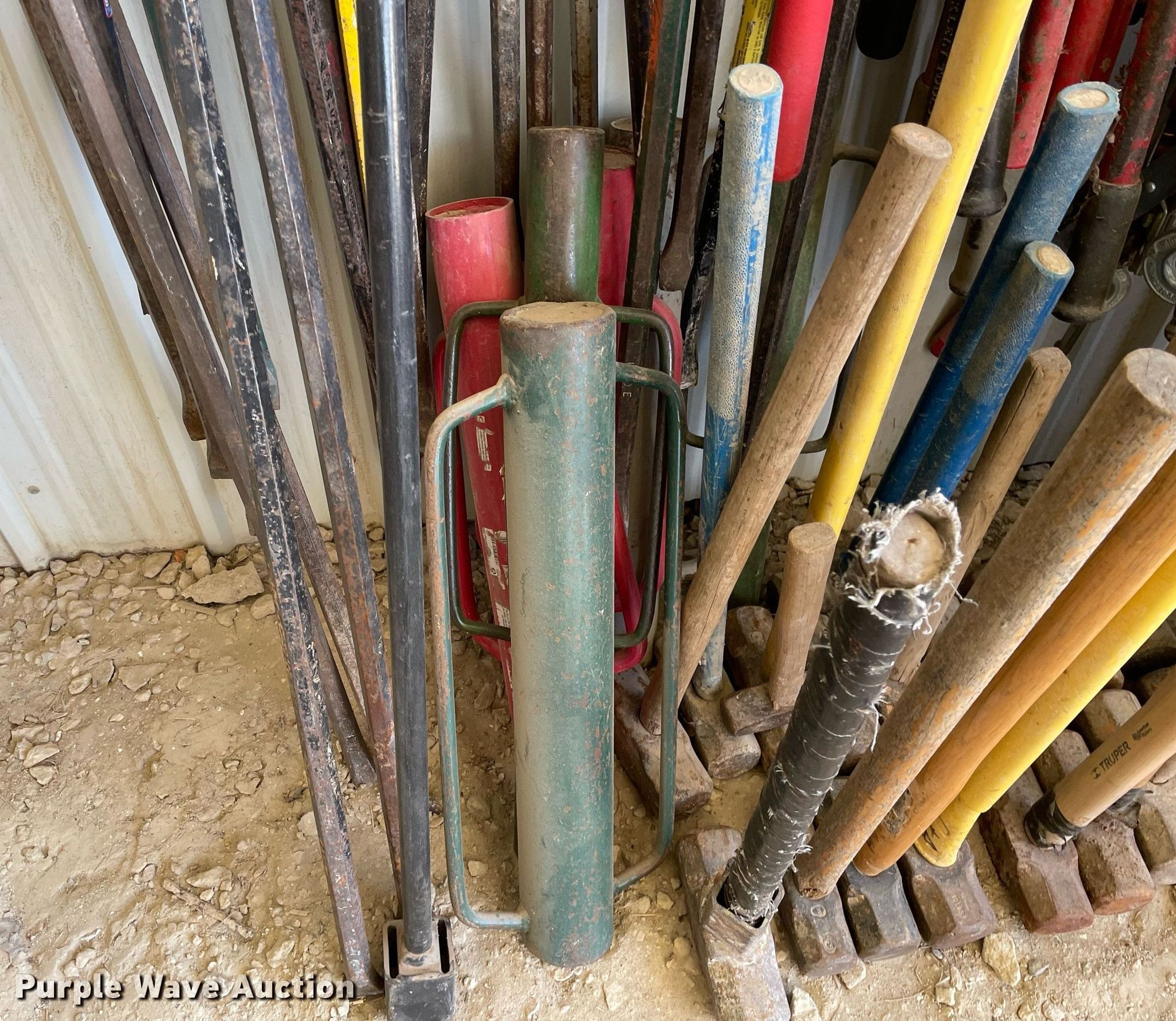Purple Wave is selling a used Tools in Kansas. This item is a Tools with the following: Approx. 25 crowbars, Approx.18 sledge hammers, (8) bolt cutters, (6) t-post drivers, (2) hedge clippers, Stake pullers, Barrel, Ratchets and more