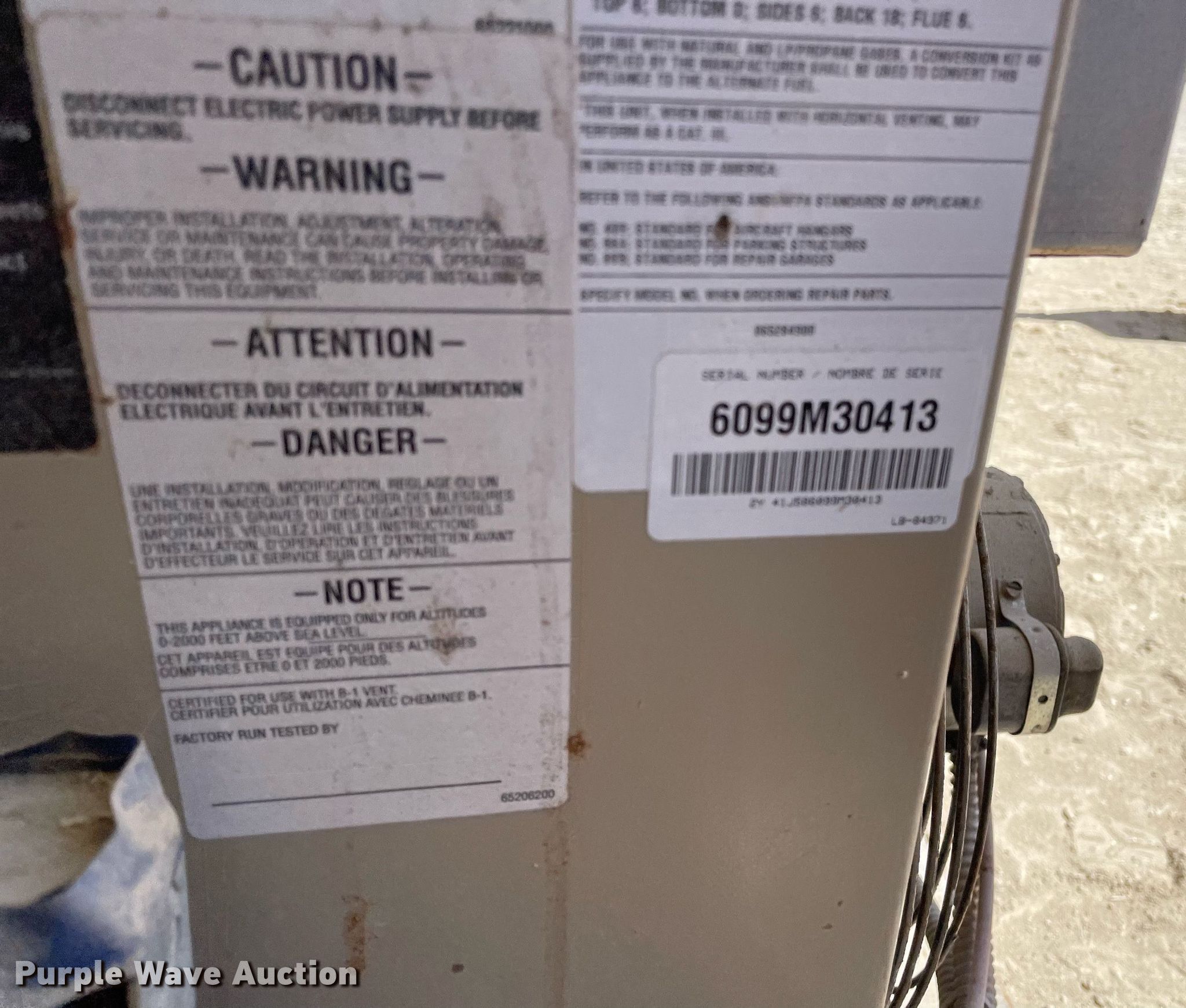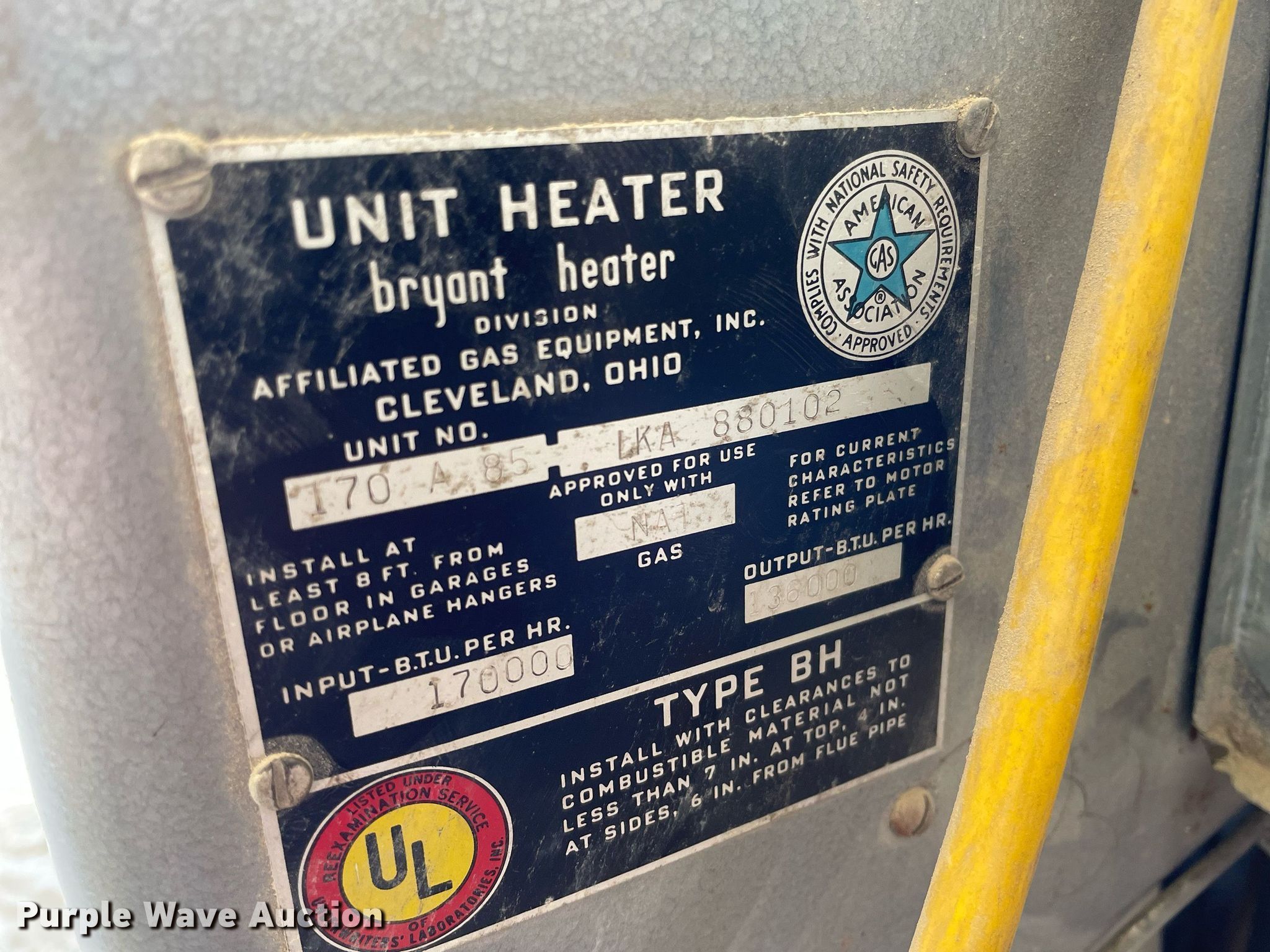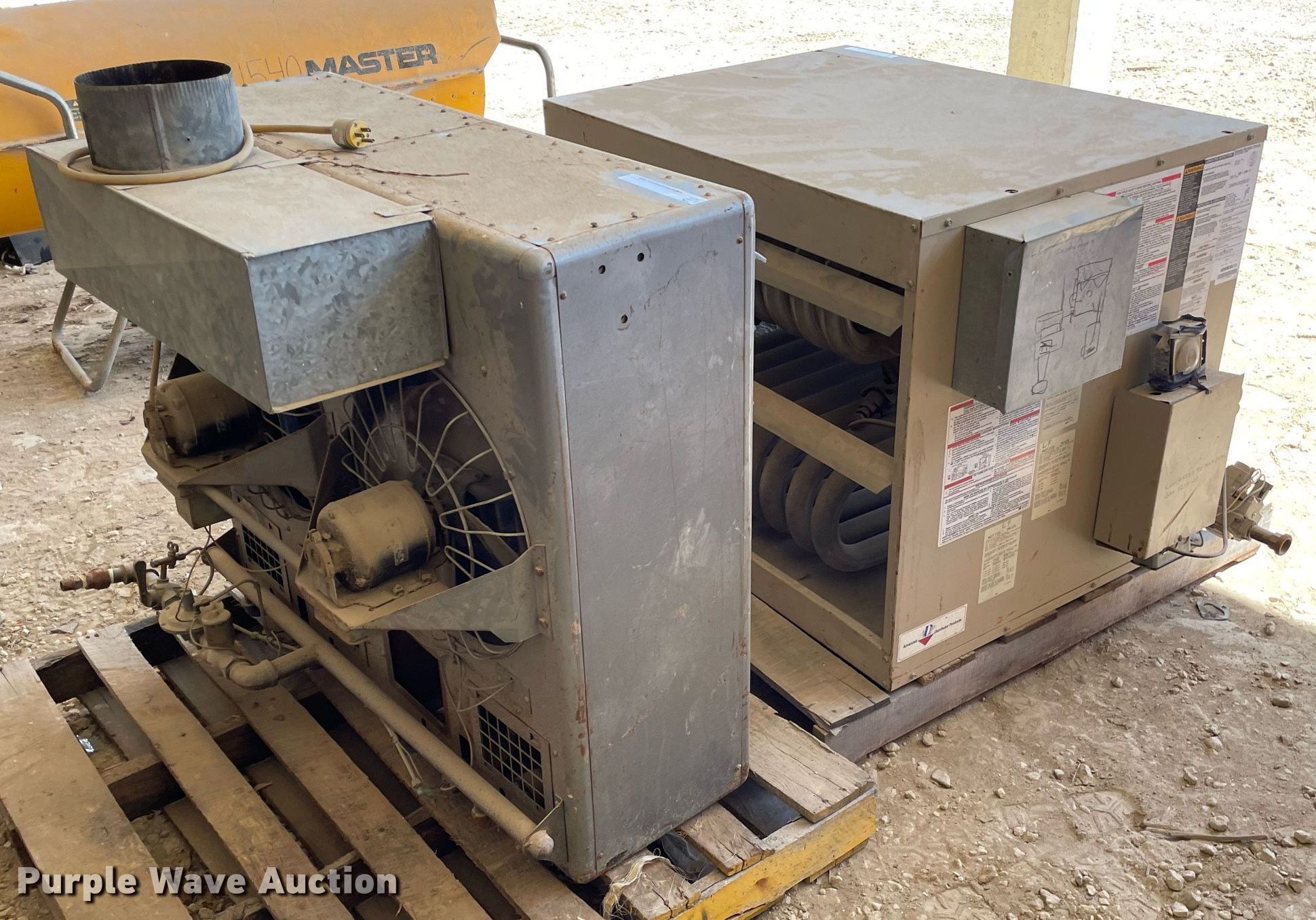 Purple Wave is selling a used Appliances in Kansas. This item is a (2) propane heaters with the following: Bryant, Input: 170,000 BTU, Output: 136,000 BTU, Advanced Distributor Products SEP-230A-5