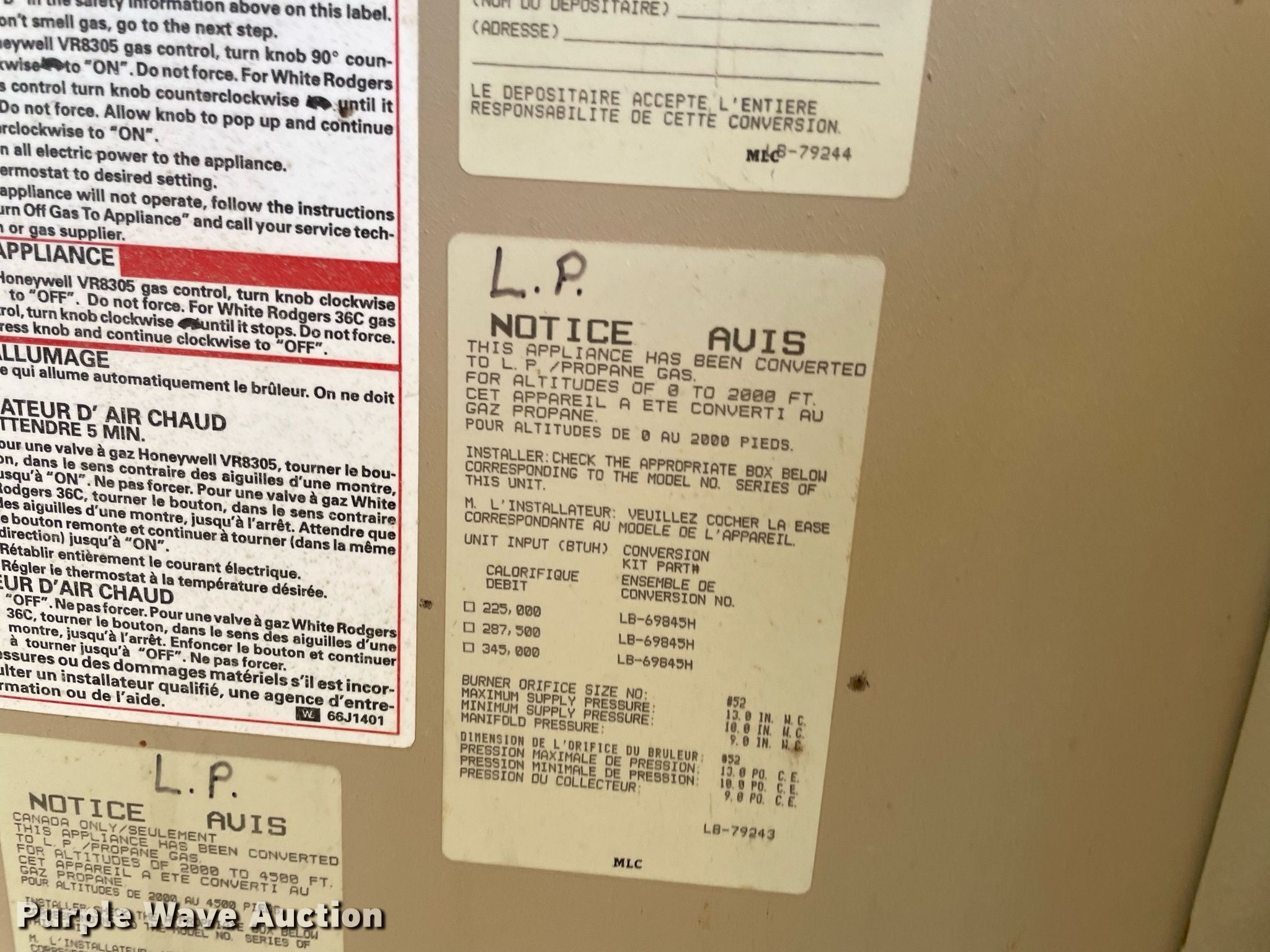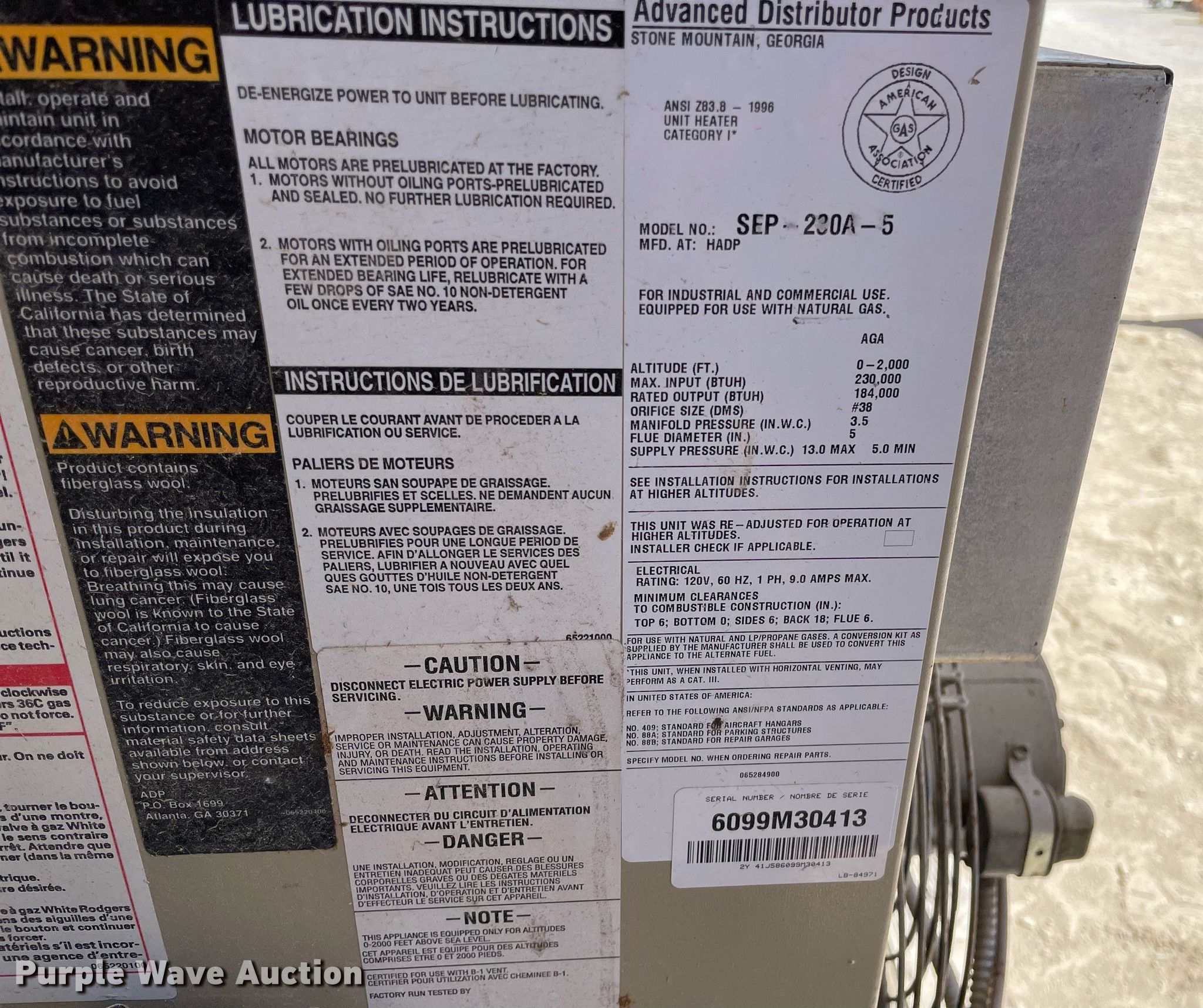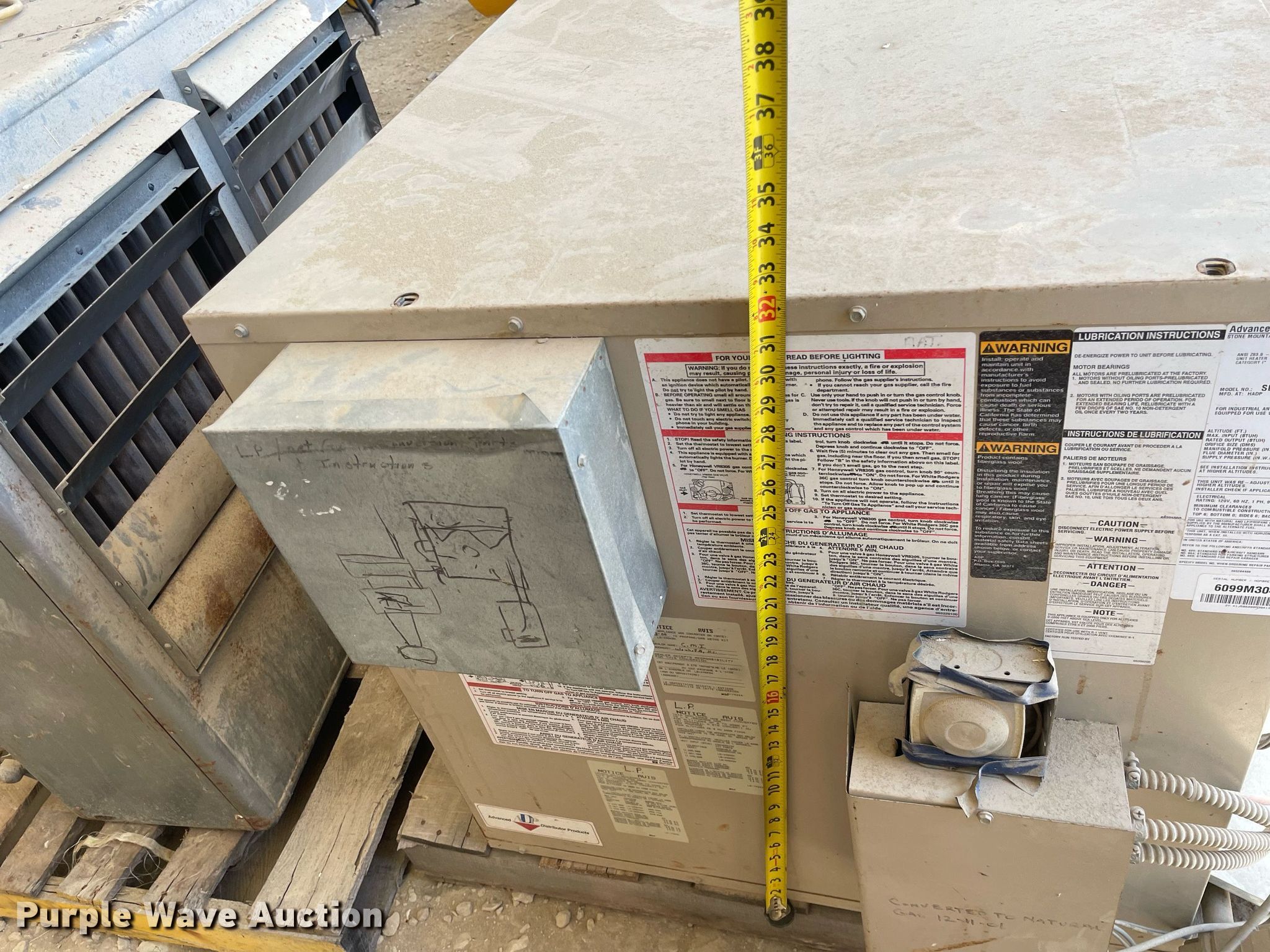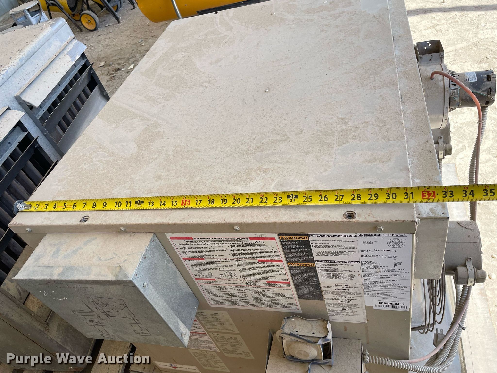 Purple Wave is selling a used Appliances in Kansas. This item is a (2) propane heaters with the following: Bryant, Input: 170,000 BTU, Output: 136,000 BTU, Advanced Distributor Products SEP-230A-5