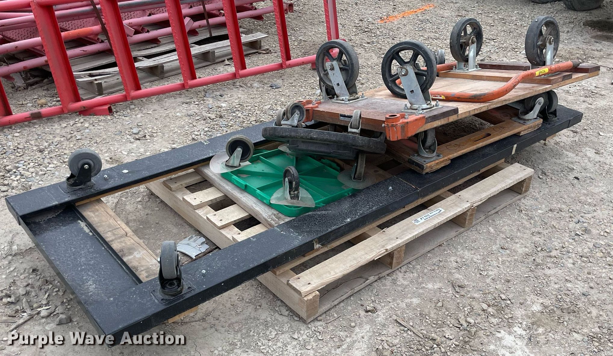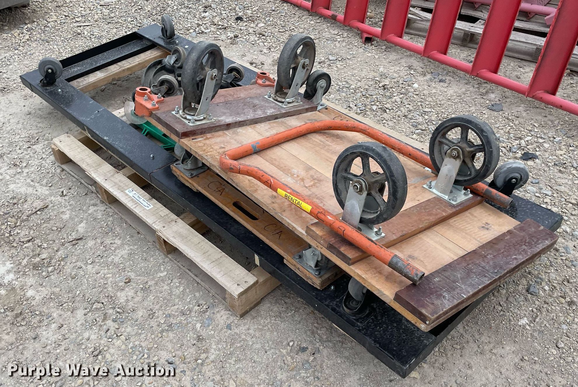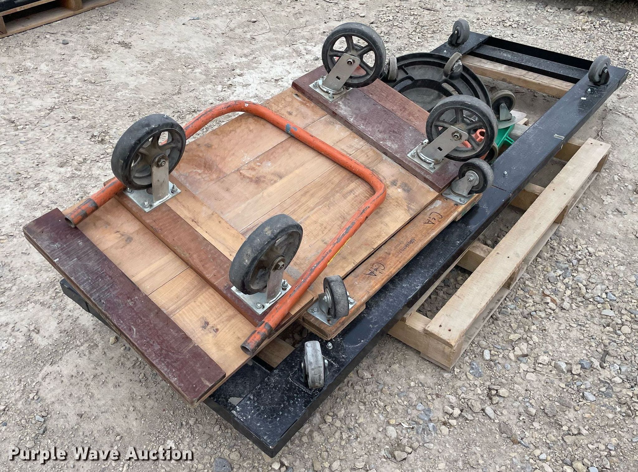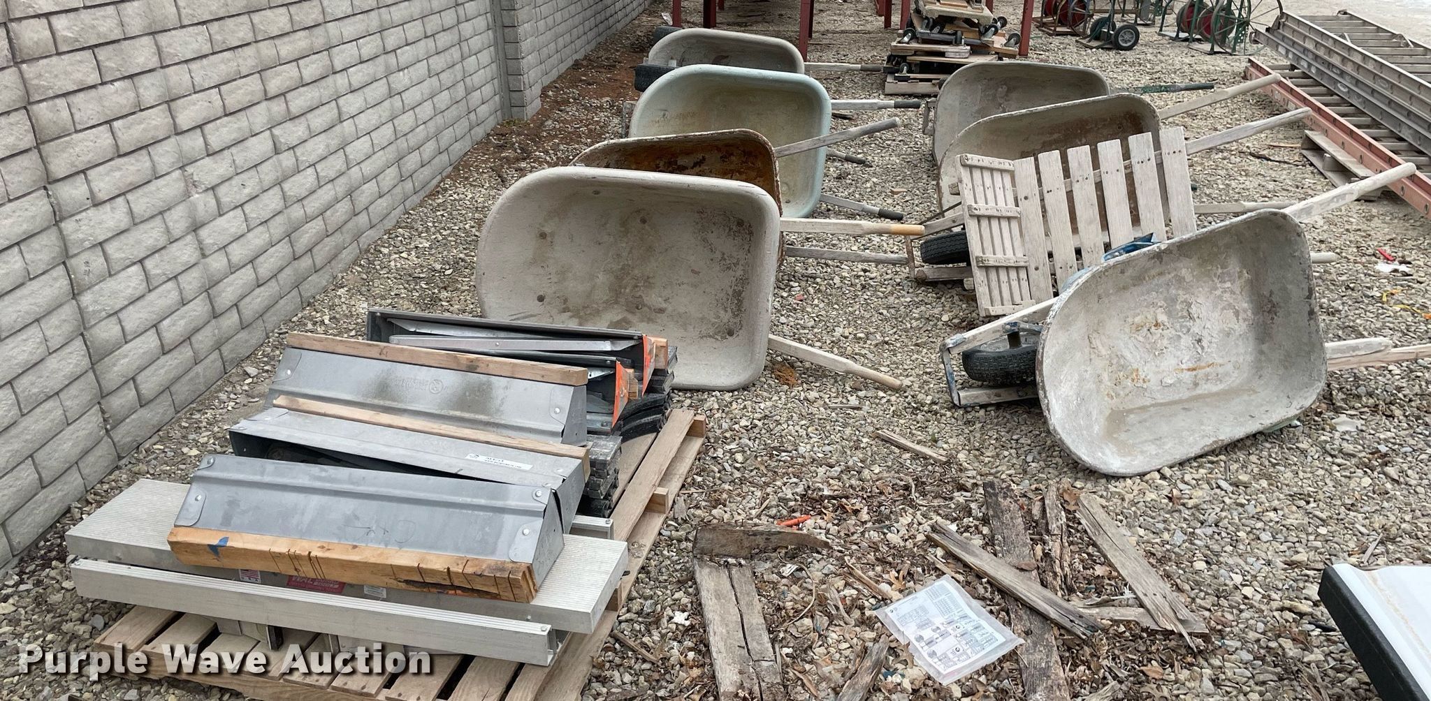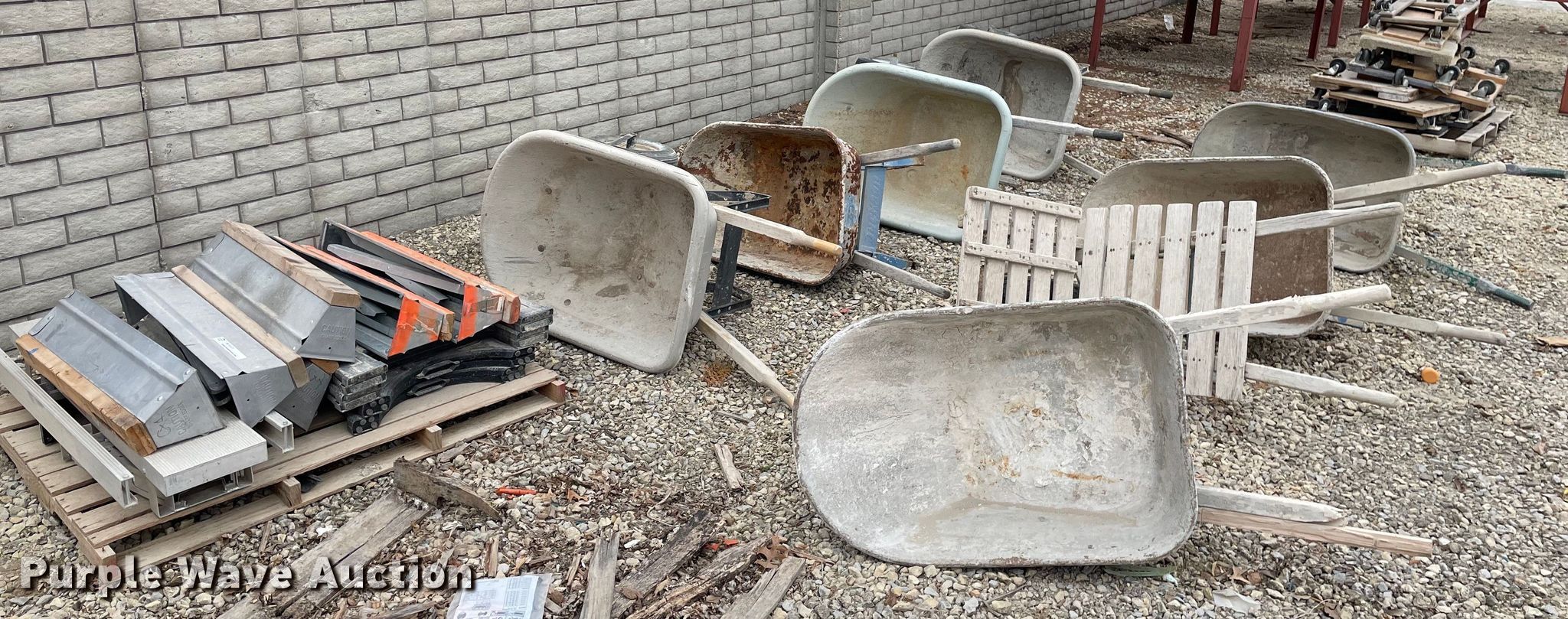 Purple Wave is selling a used Tools in Kansas. This item is a Tools with the following: Approx. 13 rollers, (8) wheel barrows, (9) saw horses, Jesco 290200 cart, Approx. 7 dollies