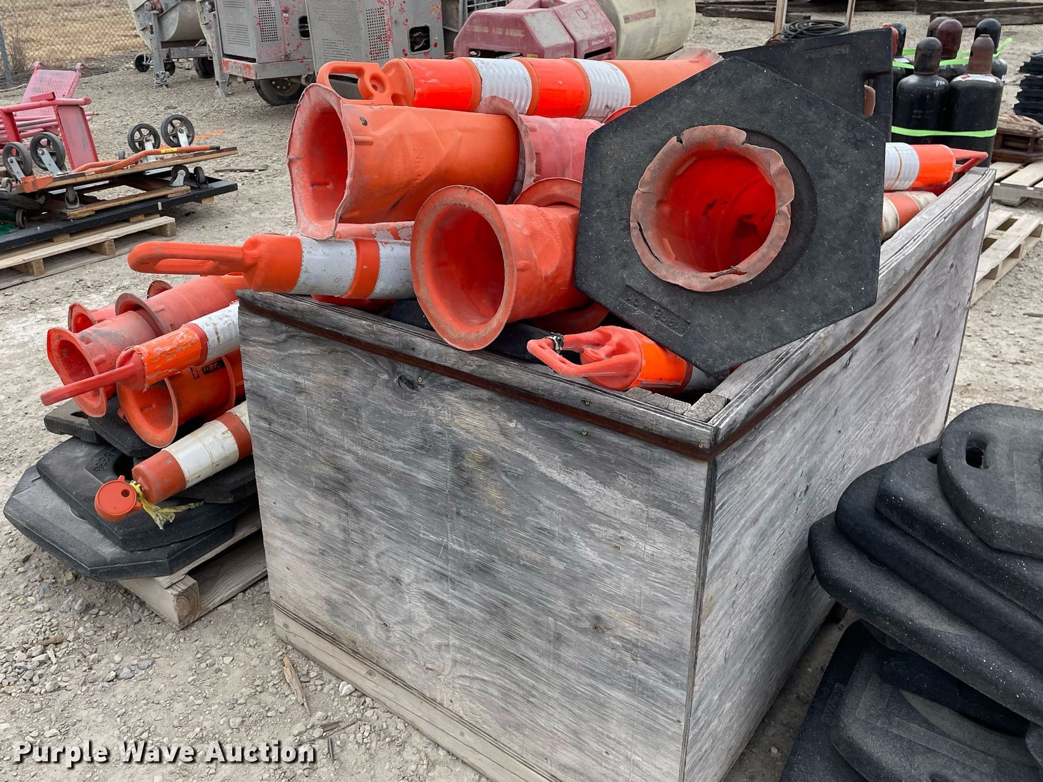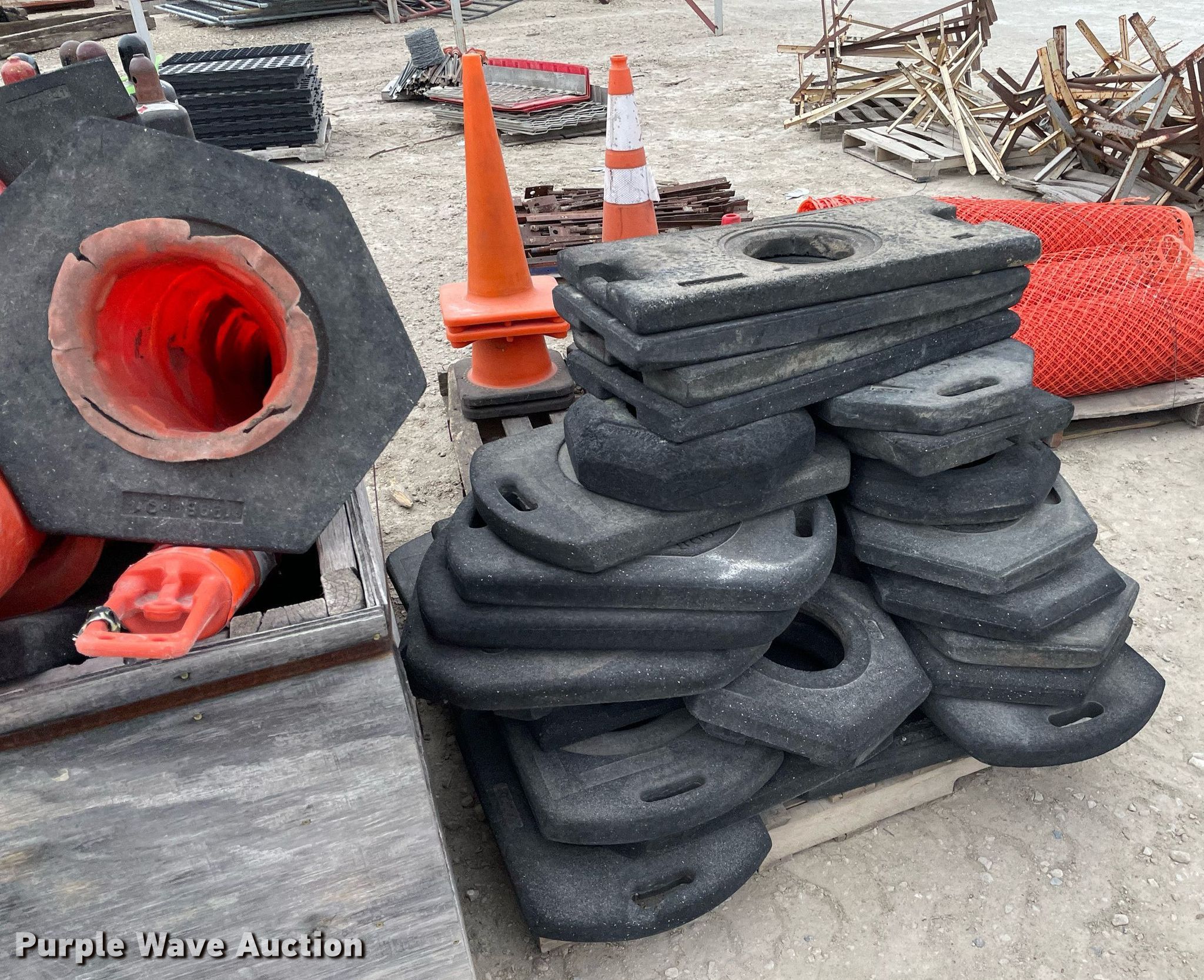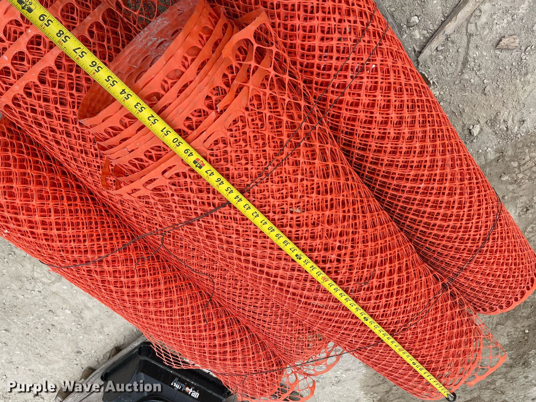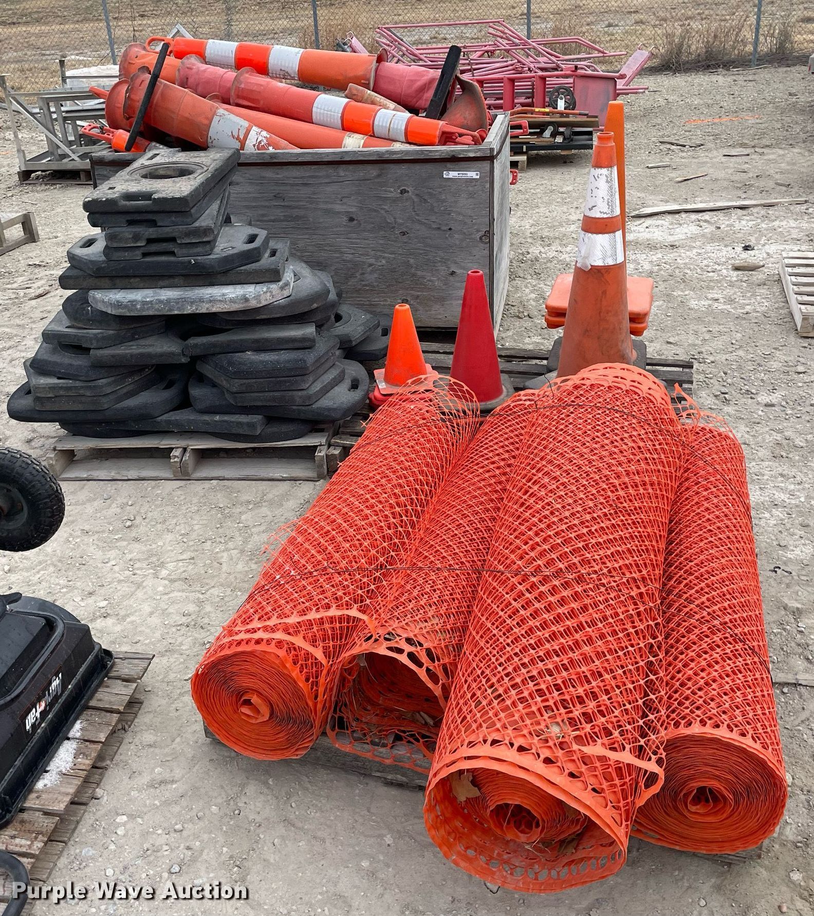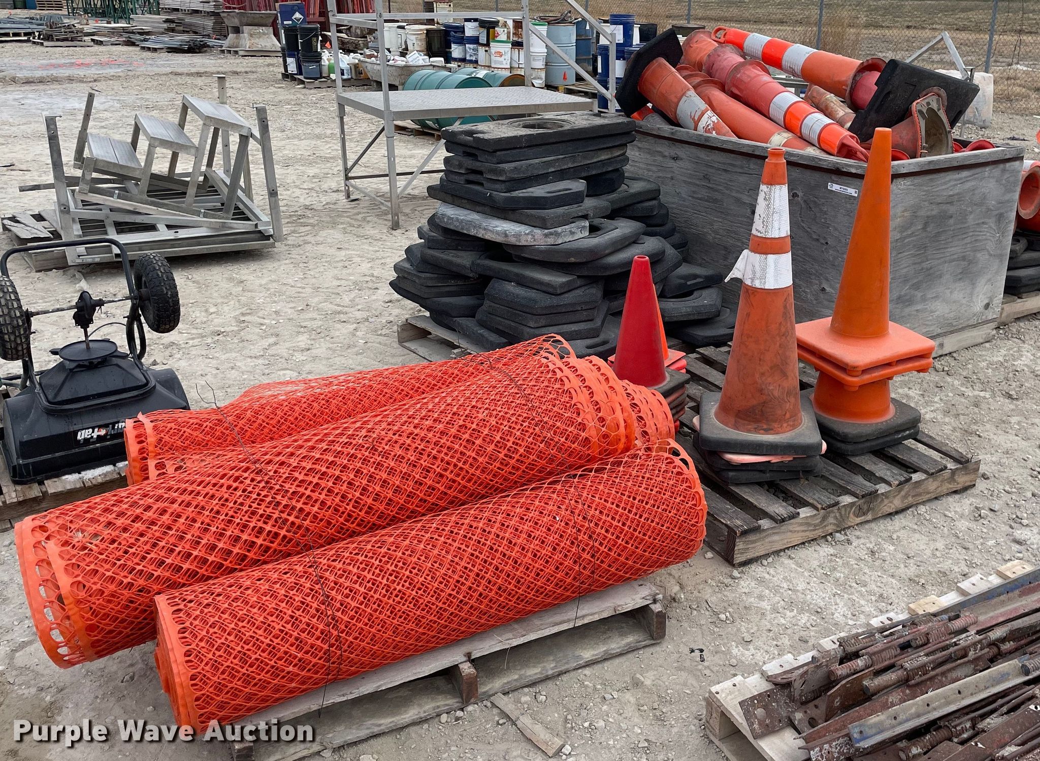 Purple Wave is selling a used Road Safety Equip. in Kansas. This item is a Road safety equipment with the following: (4) rolls of safety fence, 4', Cones, Cone bases