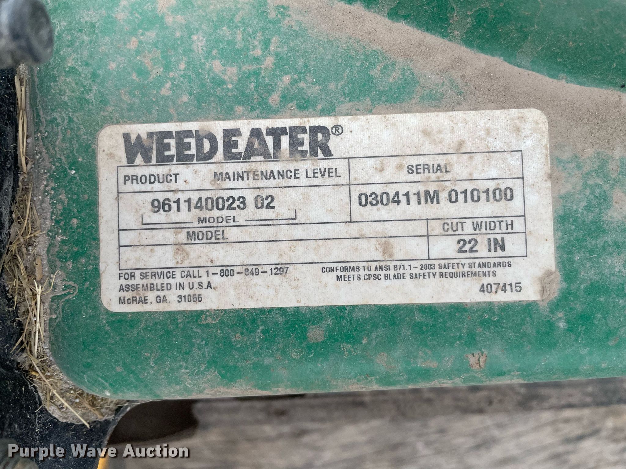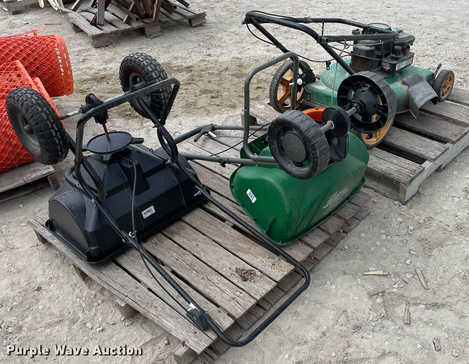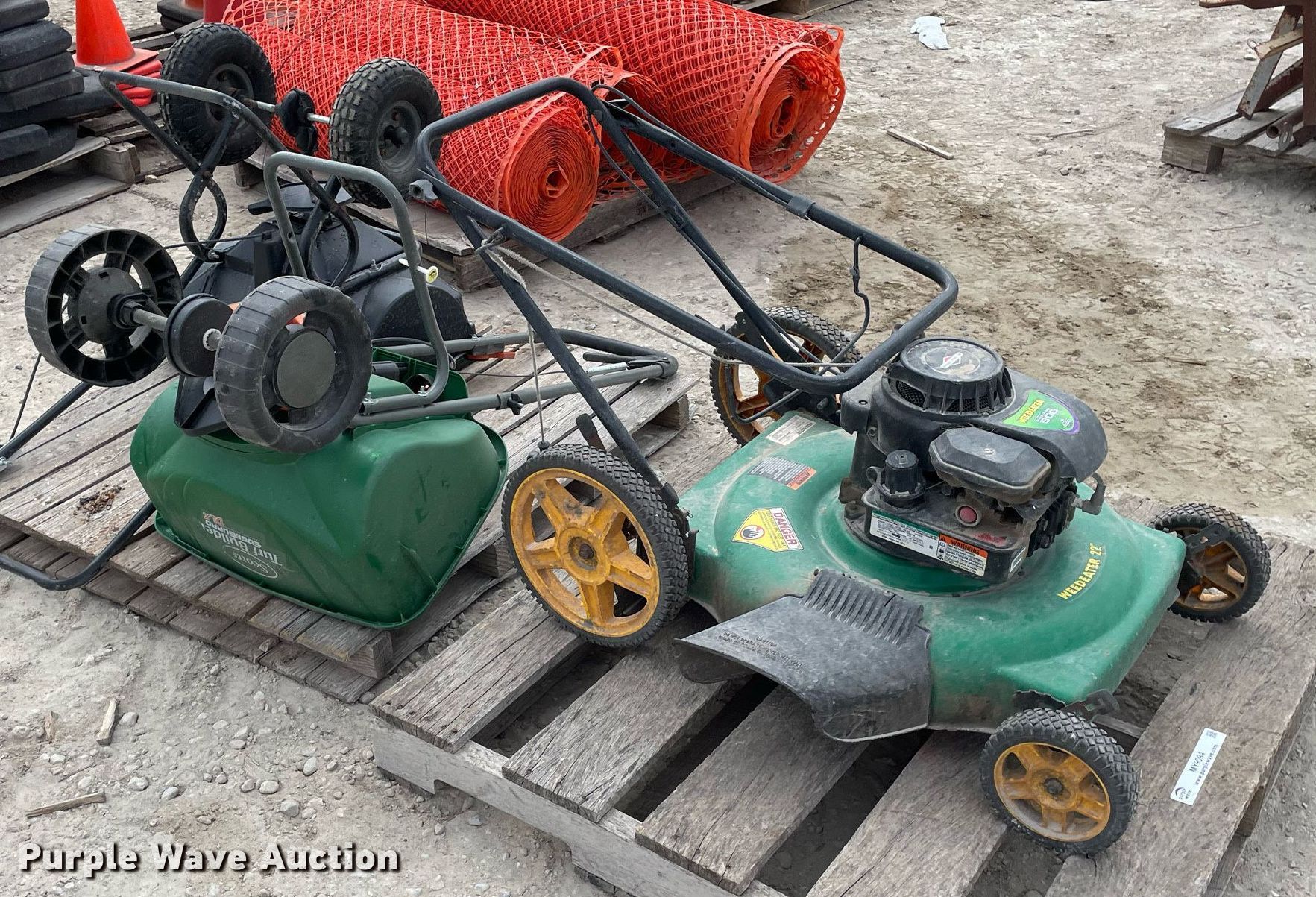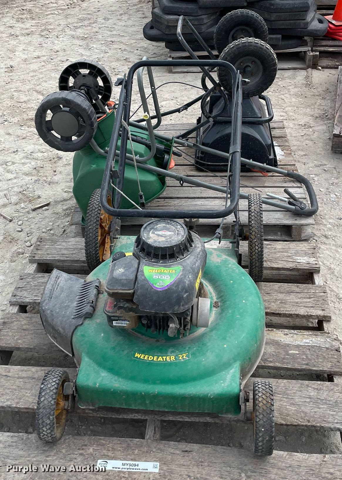 Lawn equipment. WeedEater lawn mower. Cutting width: 22". Engine Briggs & Stratton, Cylinders: 1. (2) spreaders. Coonrod & Associates Construction Co. Retirement. 3550 South Hoover Road. Wichita, KS 67215