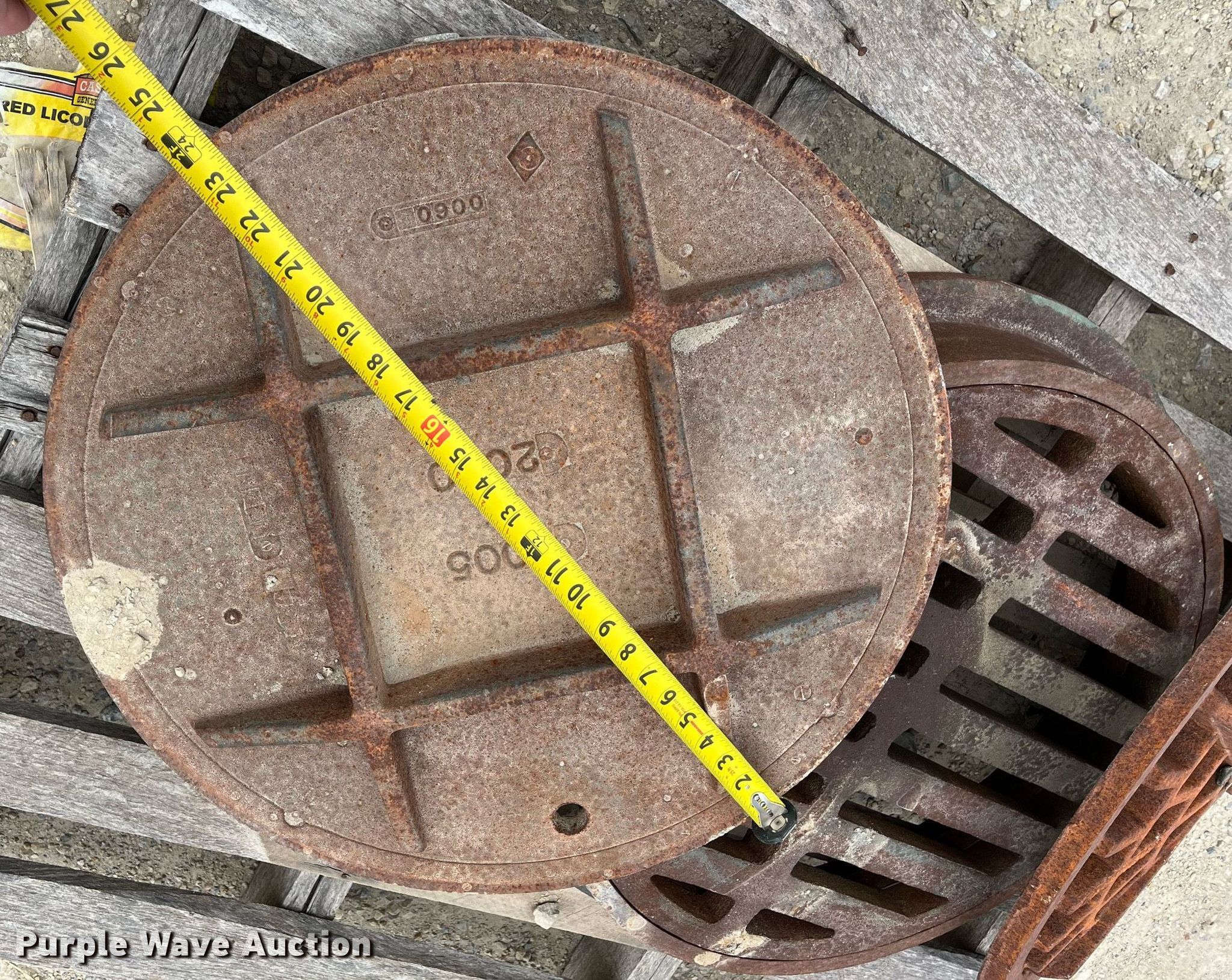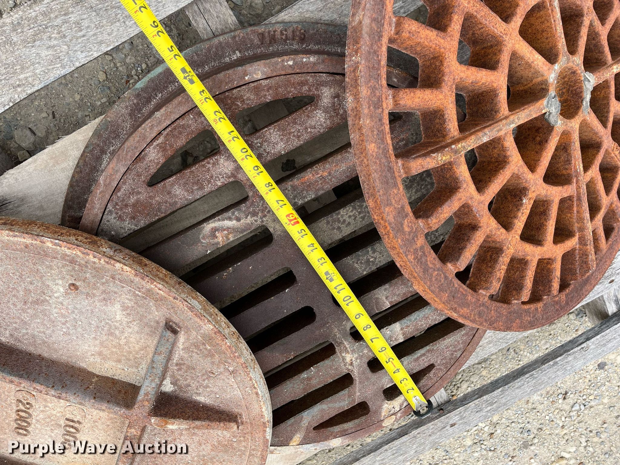 Purple Wave is selling a used Building Materials in Kansas. This item is a (3) manhole covers with the following: 25" diameter, 23" diameter, 22" diameter