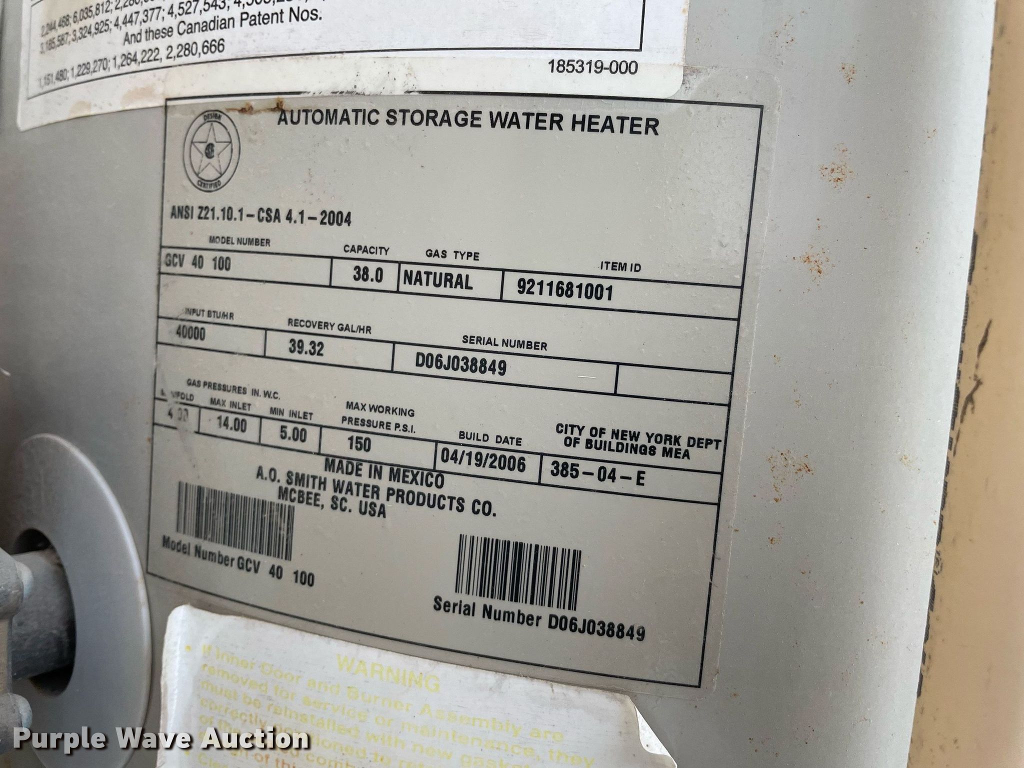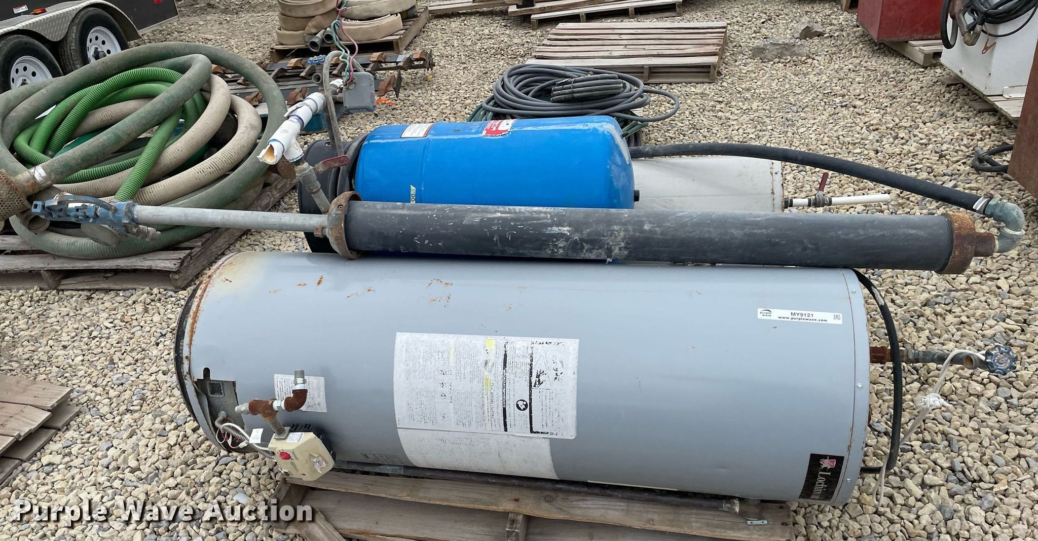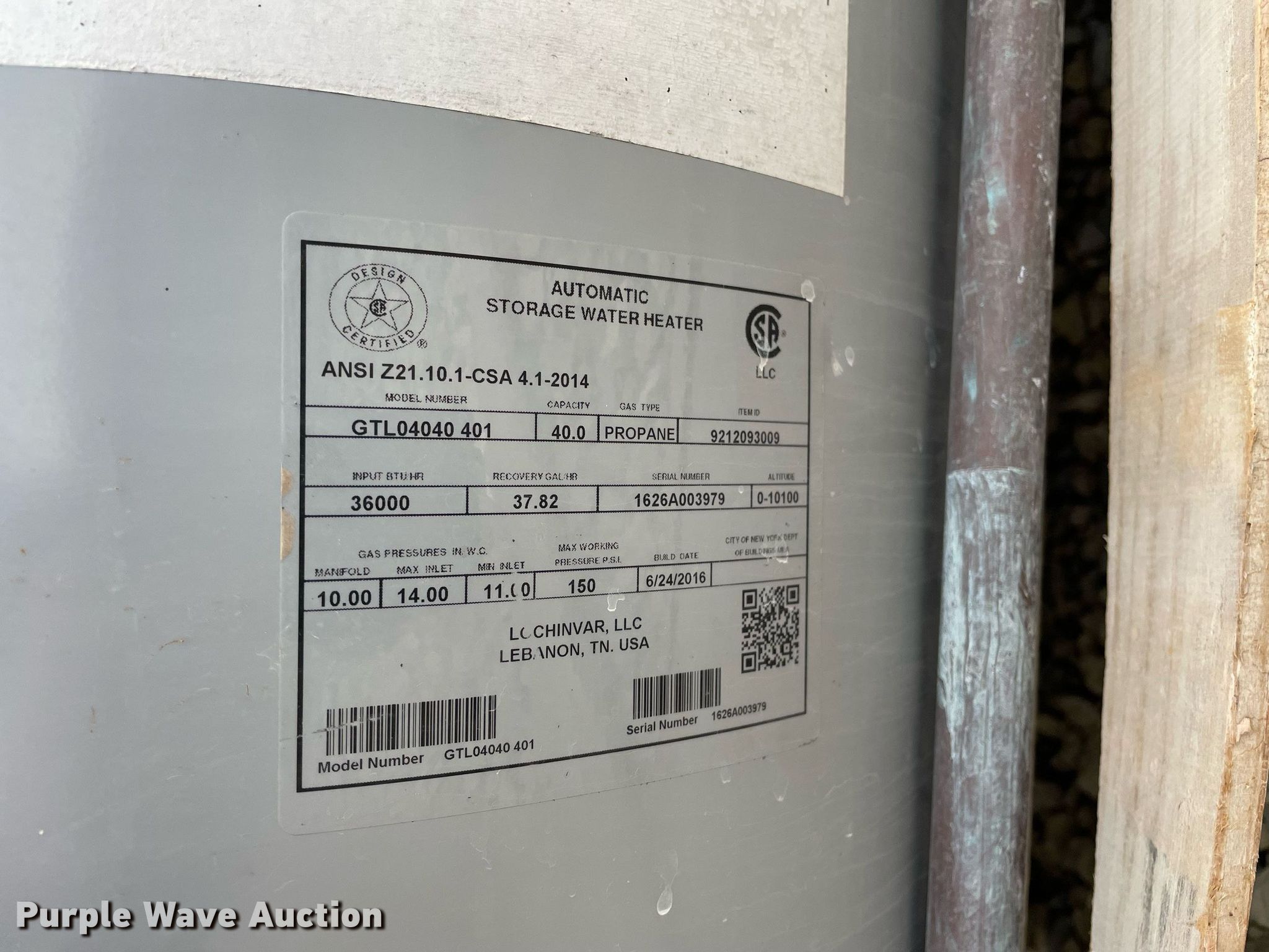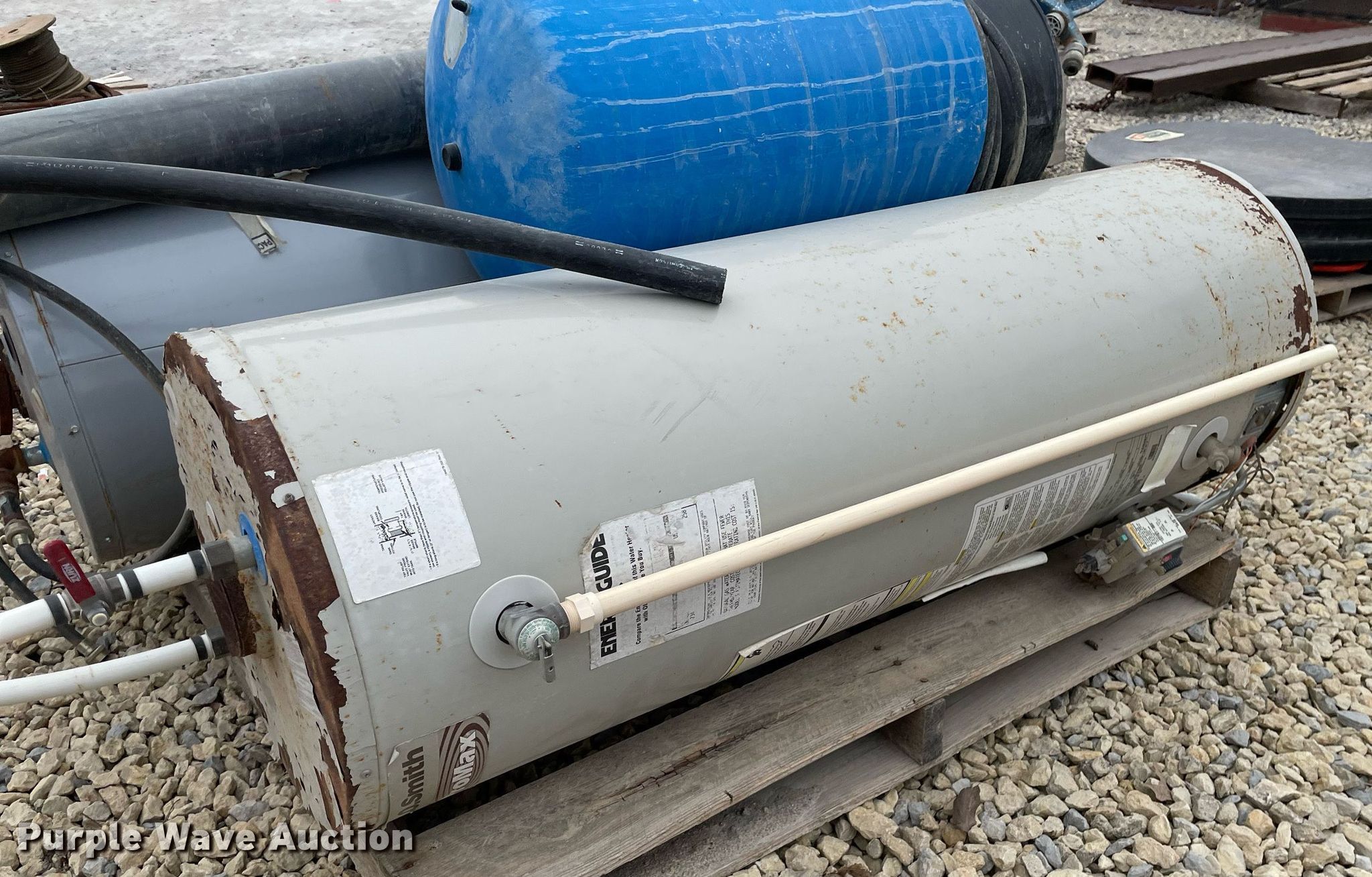 Purple Wave is selling a used Appliances in Kansas. This item is a Appliances with the following: (2) gas water heaters, Lochinvar 40 gallon, A.O. Smith 38 gallon, Woodford spigot, Utilitech diaphragm tank