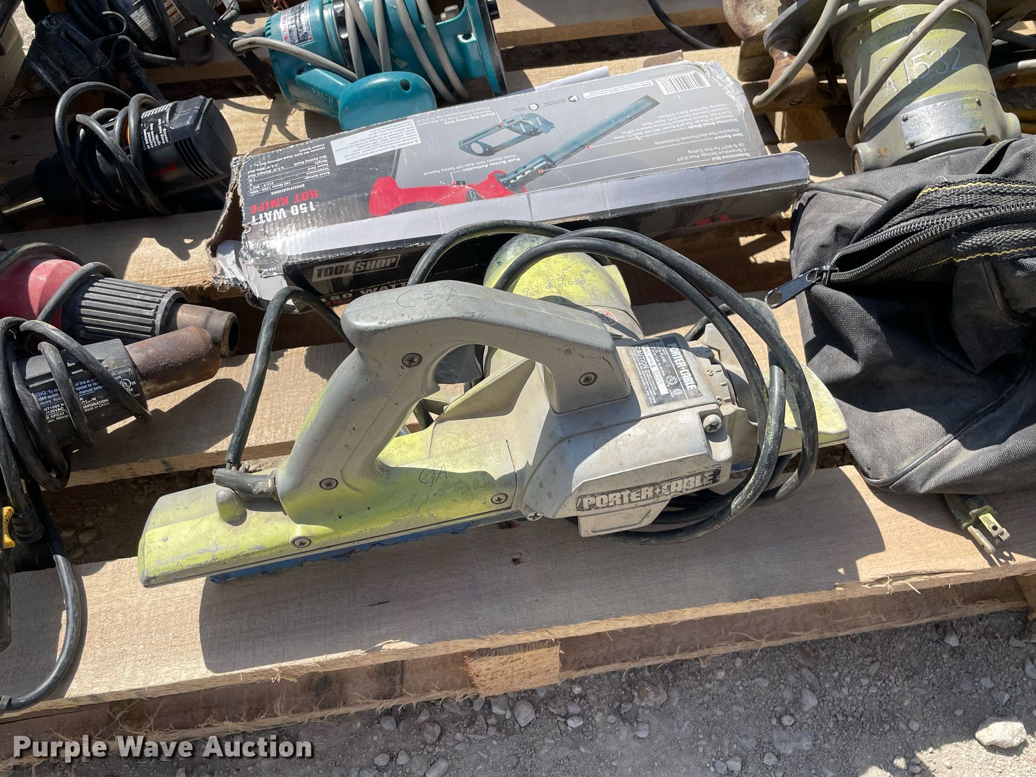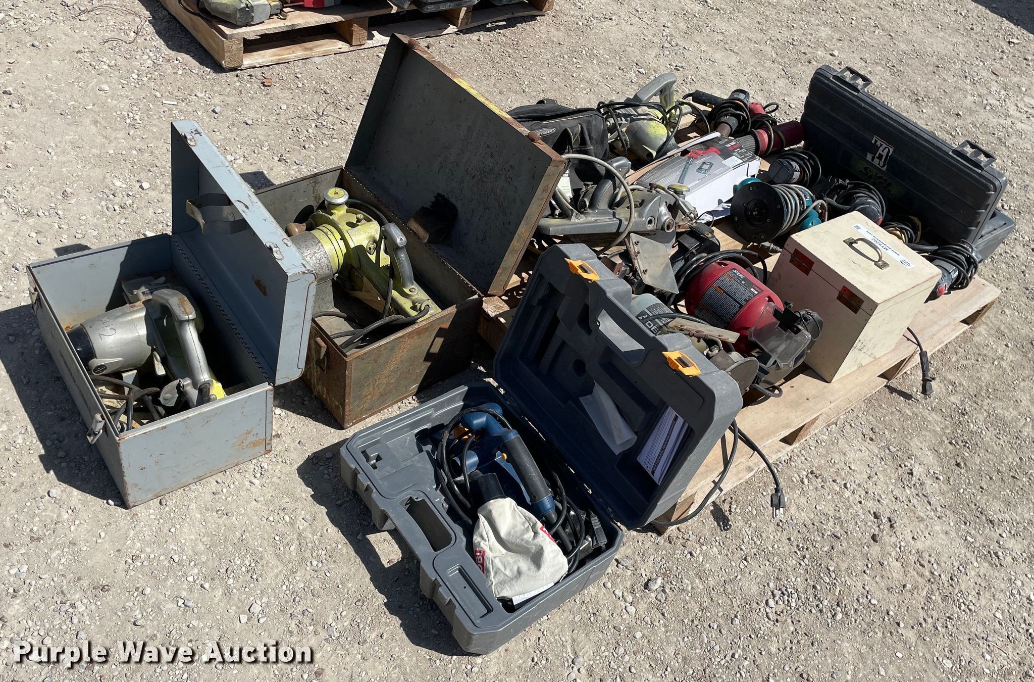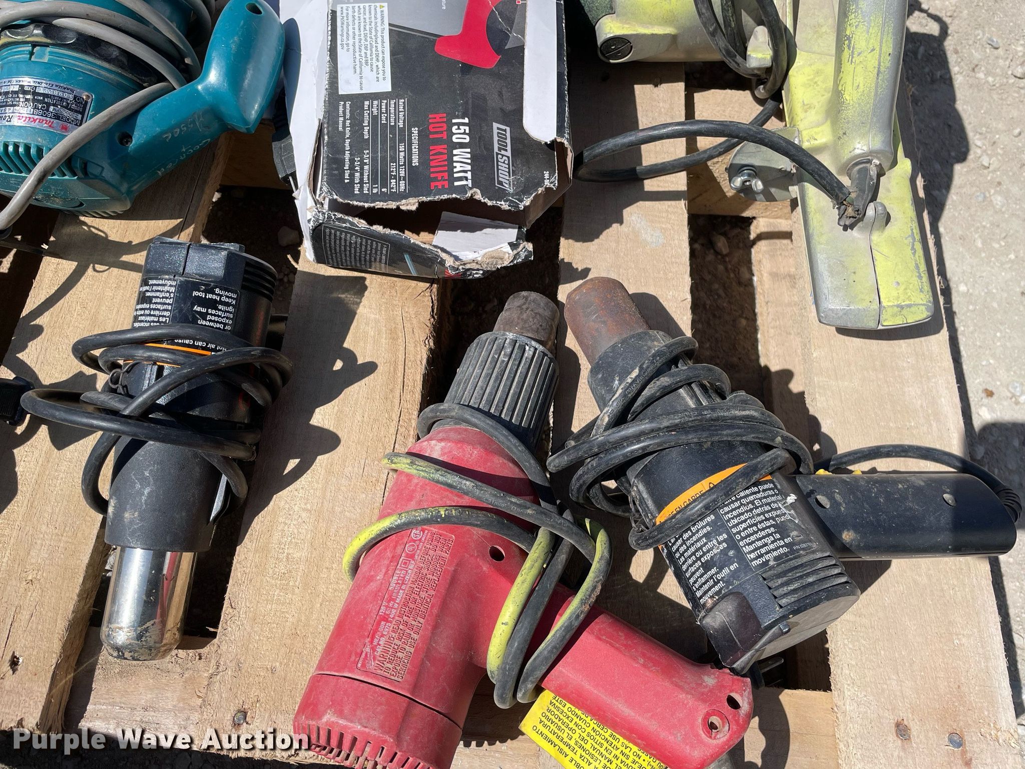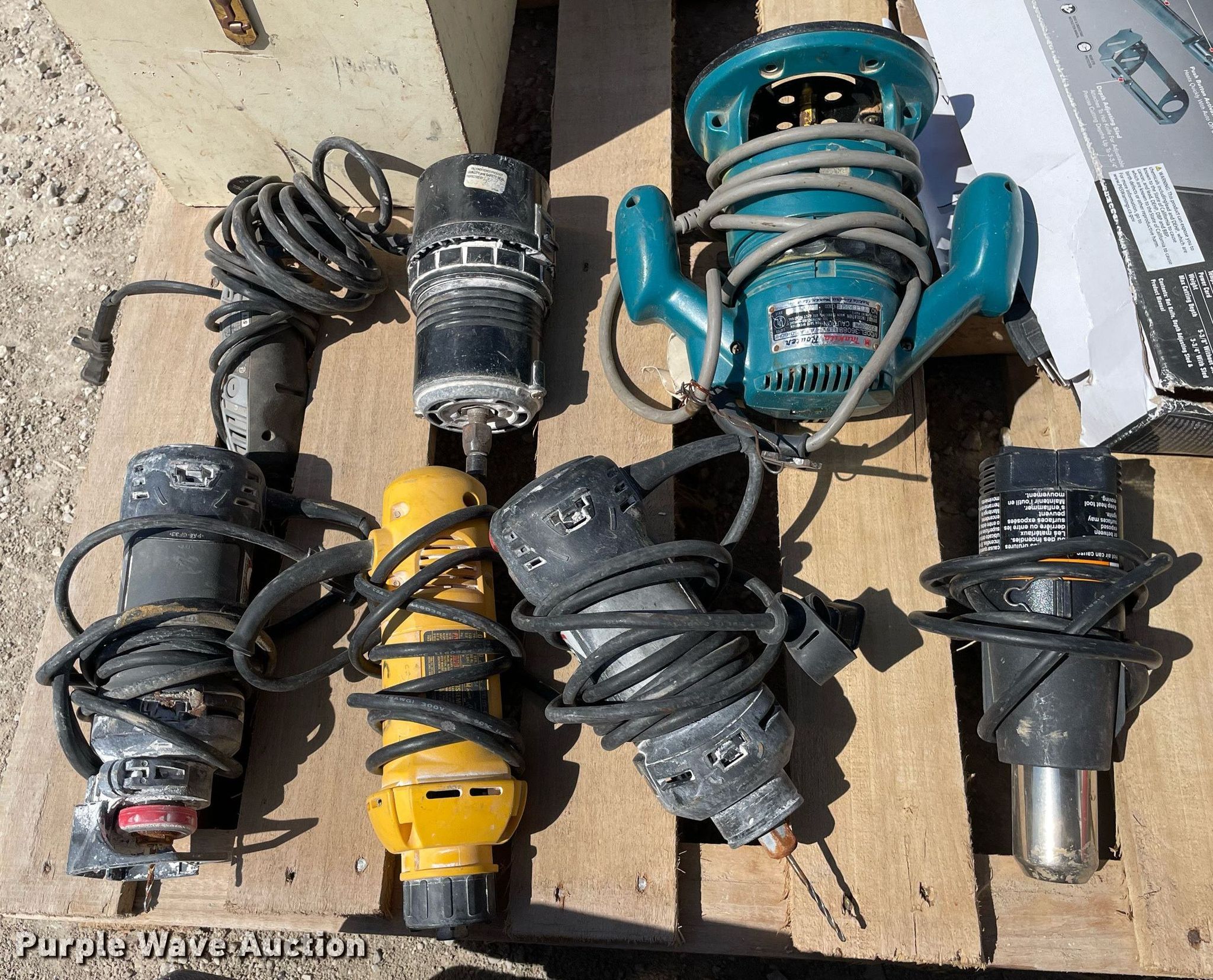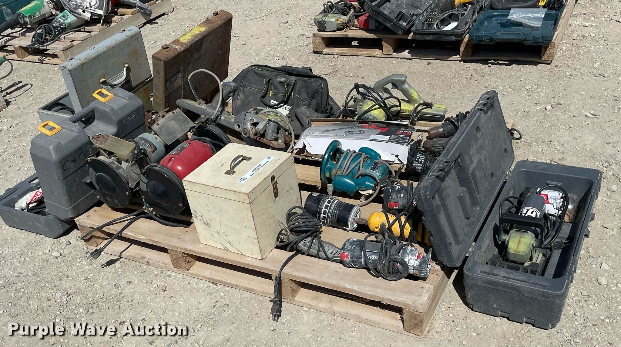 Purple Wave is selling a used Tools in Kansas. This item is a Tools with the following: Plate joiner, (3) heat guns, Hot knife, Hercules 1/4" die grinder, (4) planers, (2) bench grinders, (7) routers