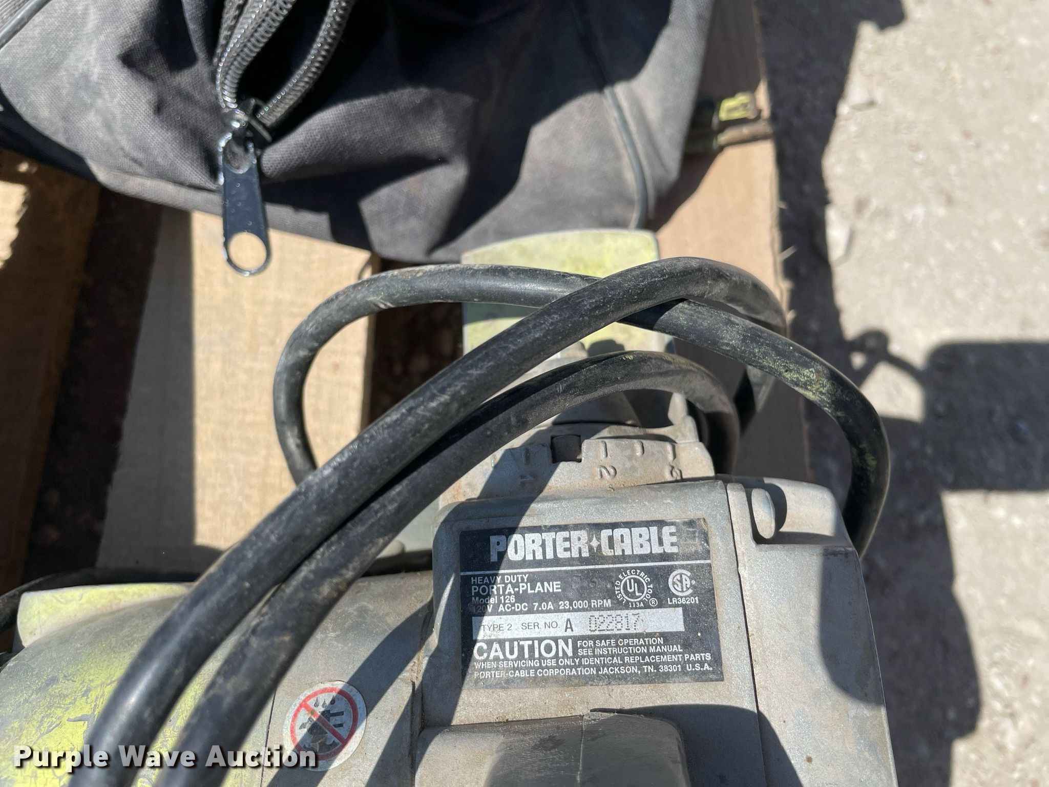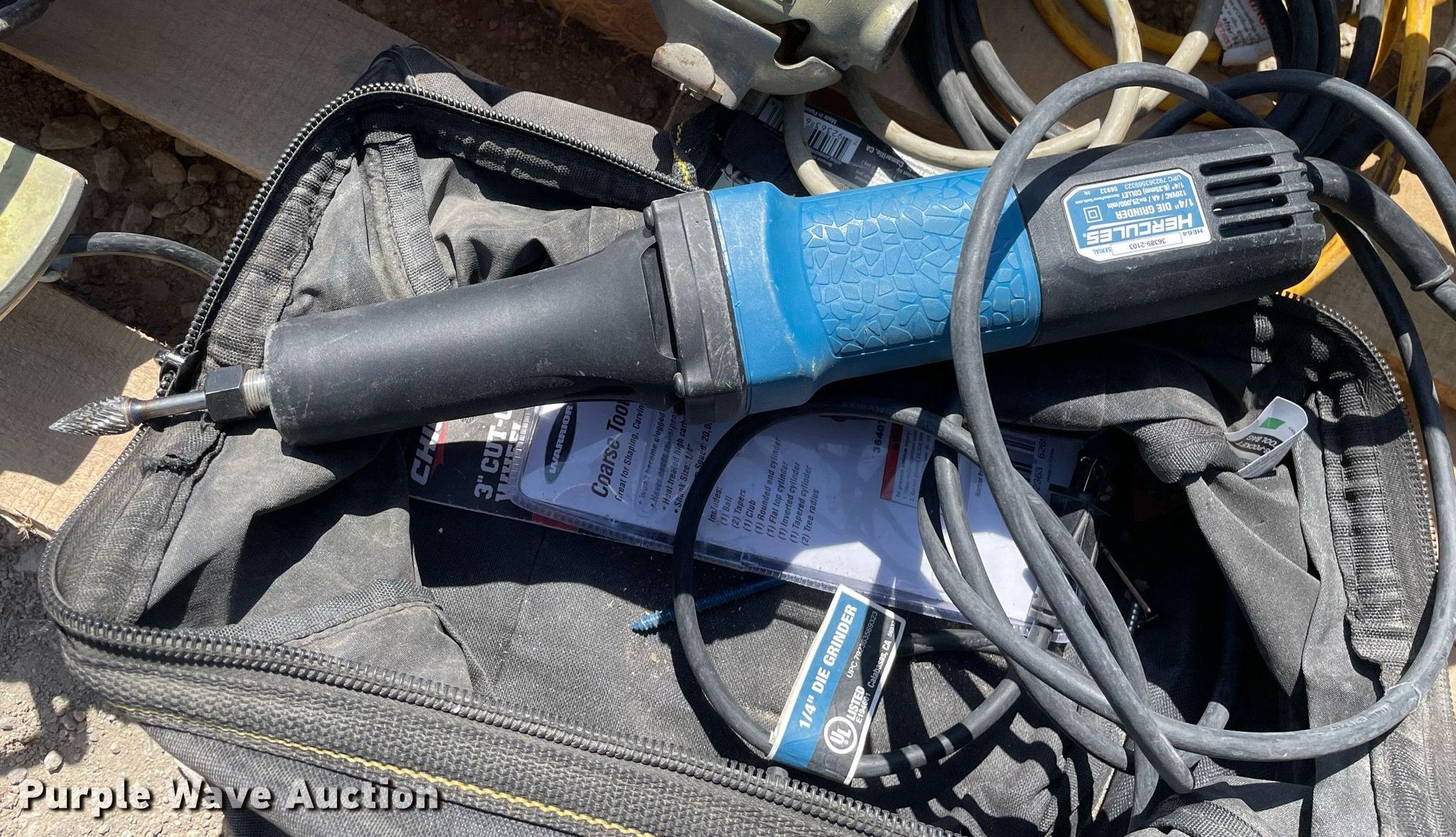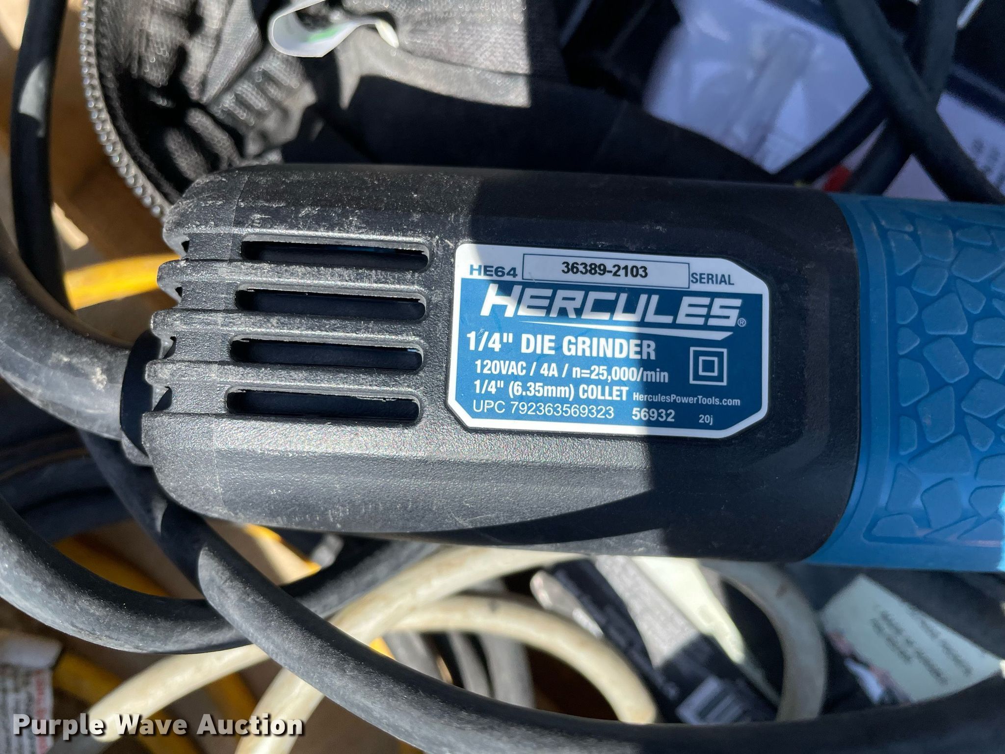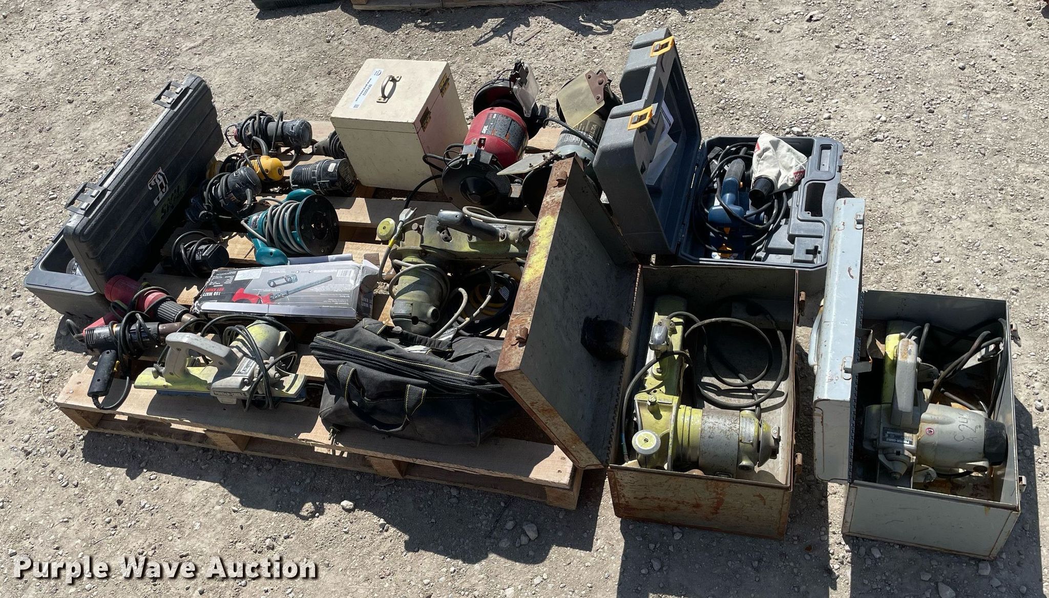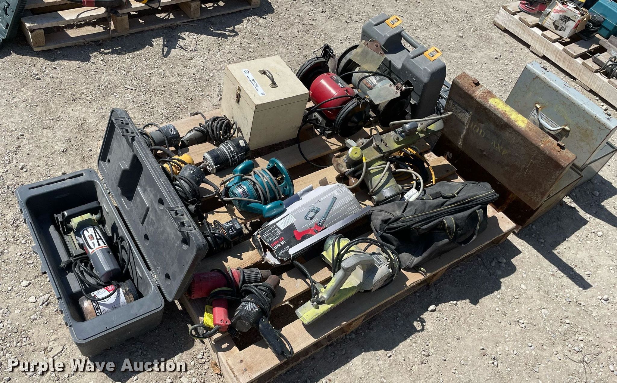 Purple Wave is selling a used Tools in Kansas. This item is a Tools with the following: Plate joiner, (3) heat guns, Hot knife, Hercules 1/4" die grinder, (4) planers, (2) bench grinders, (7) routers