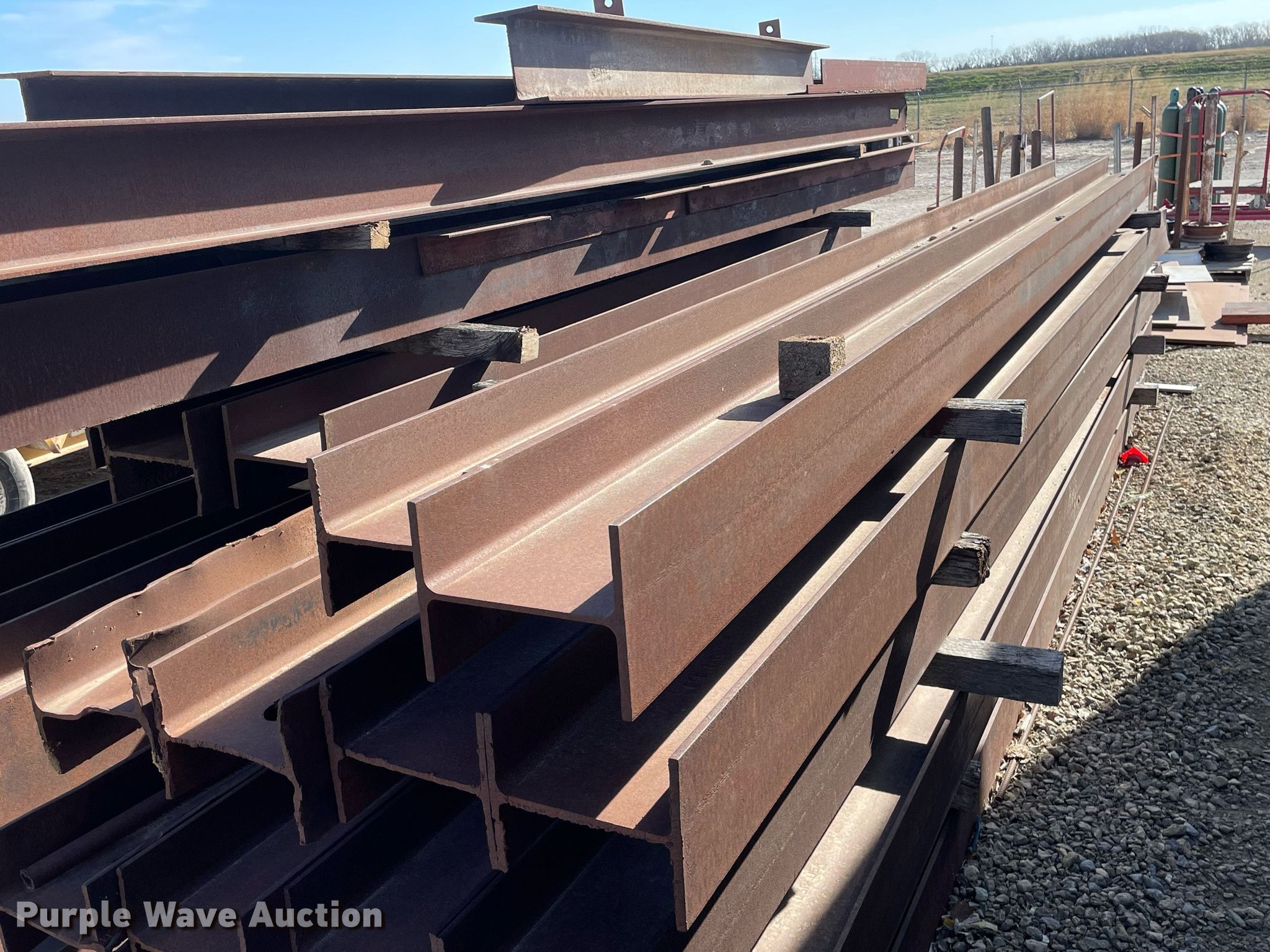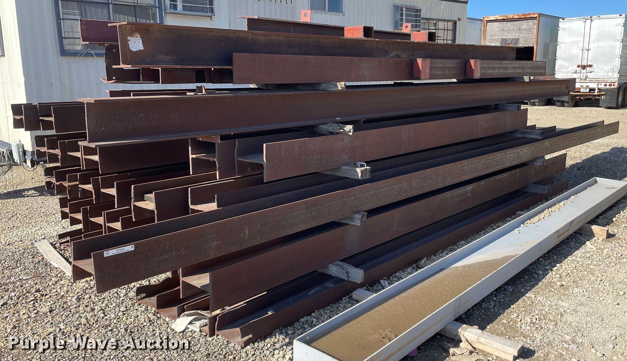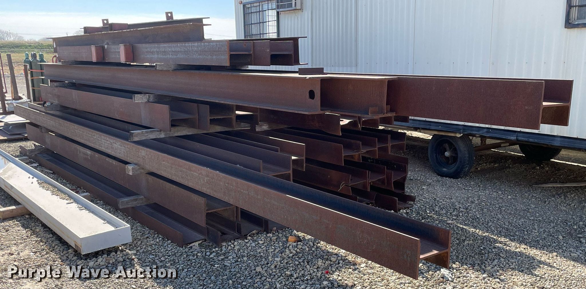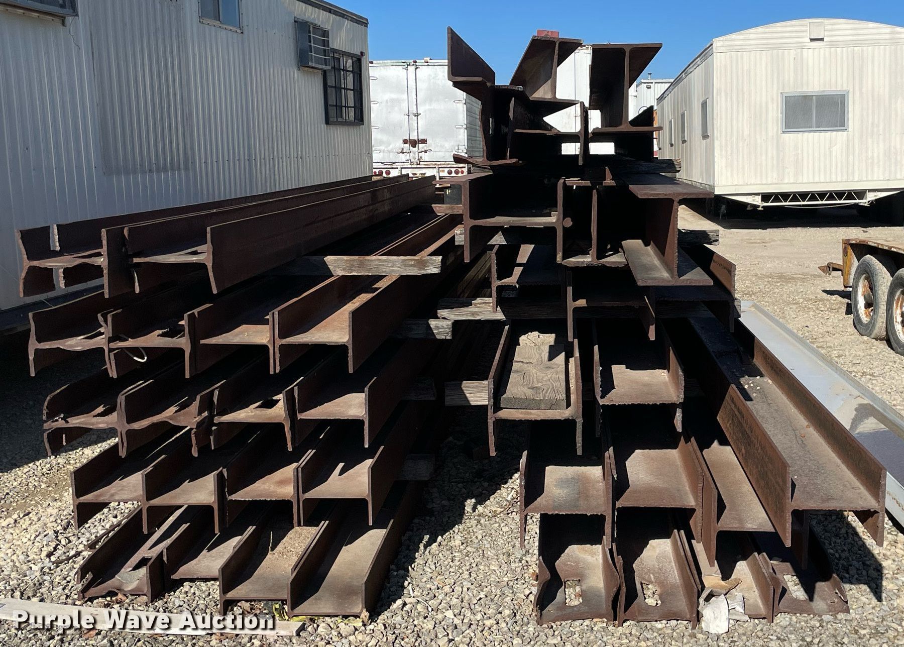 I-beams. (18) 20' X 9-5/8" X 8" Flange 3/8", Web 9/32", 30'L, (2) 25' X 9-7/8" X 8", Flange 9/16", Web 5/16", I-beam: 12-1/8" X 10" Flange 9/16", Web 11/32", (2) 15'L, 13'L, (5) 20'L, (1) 28'L. Coonrod & Associates Construction Co. Retirement. 3550 South Hoover Road. Wichita, KS 67215