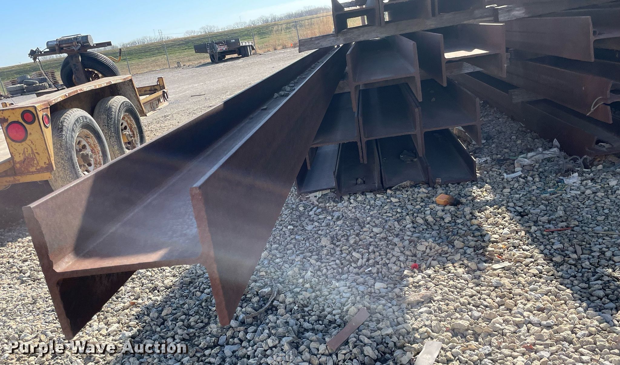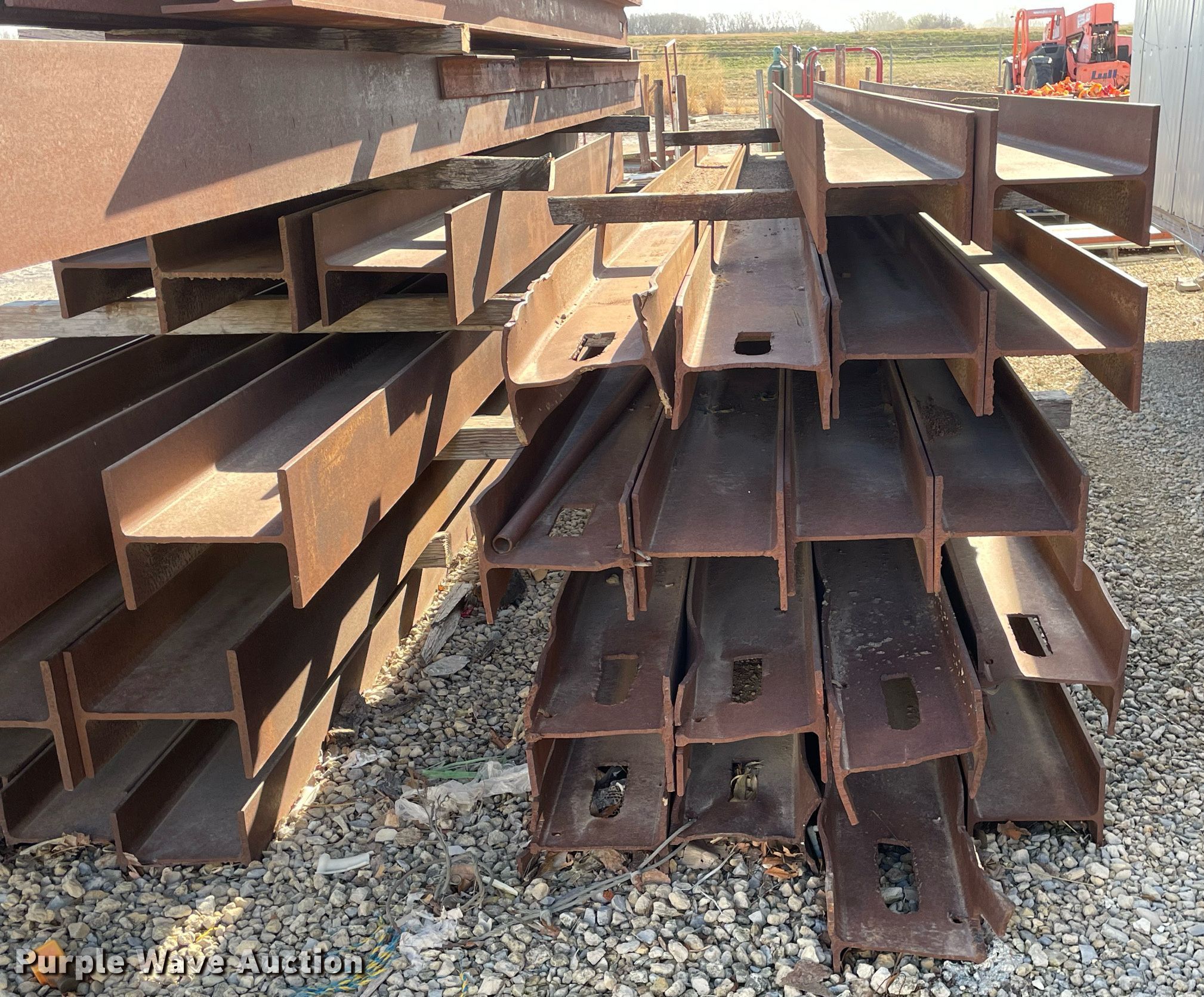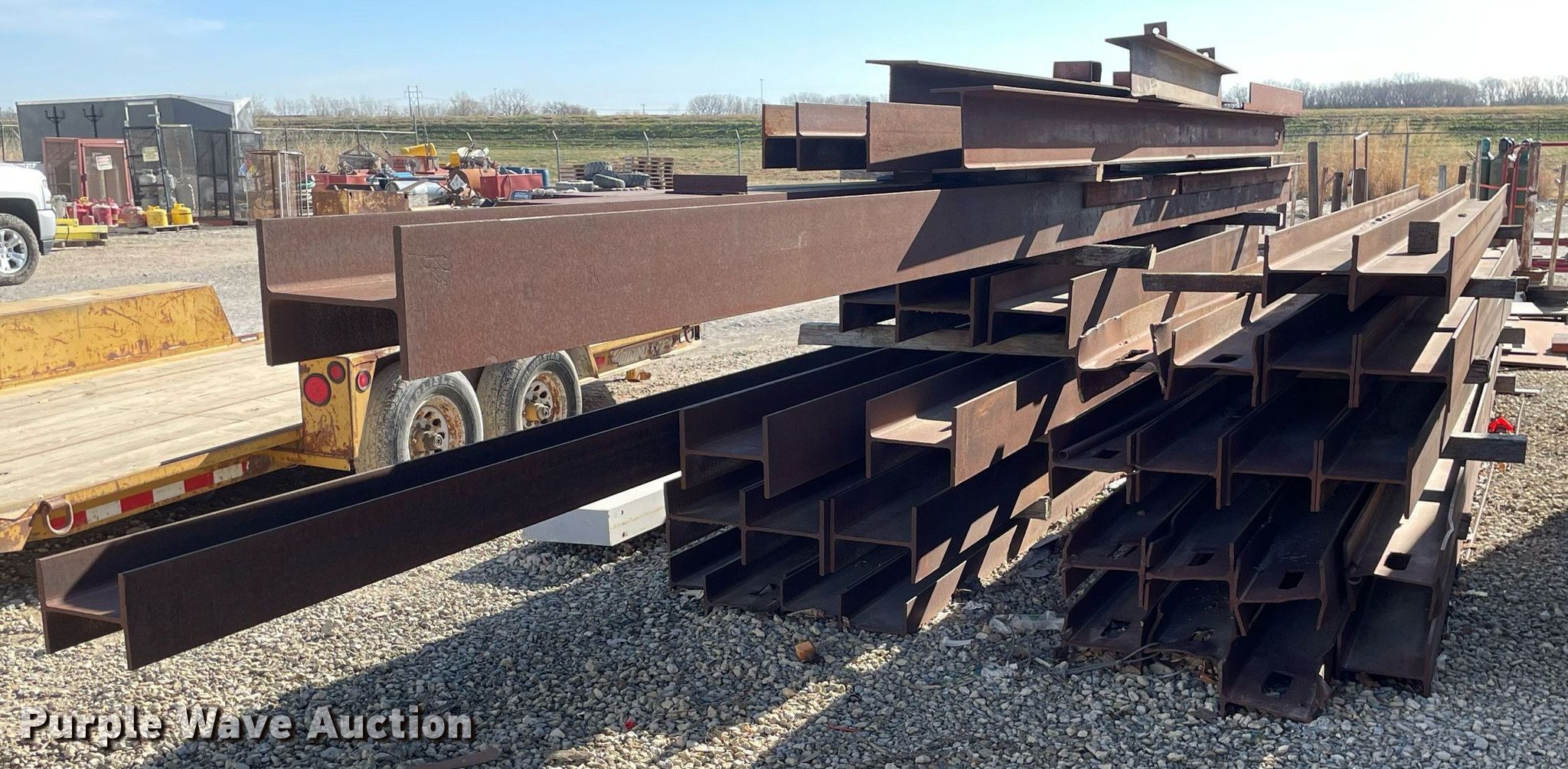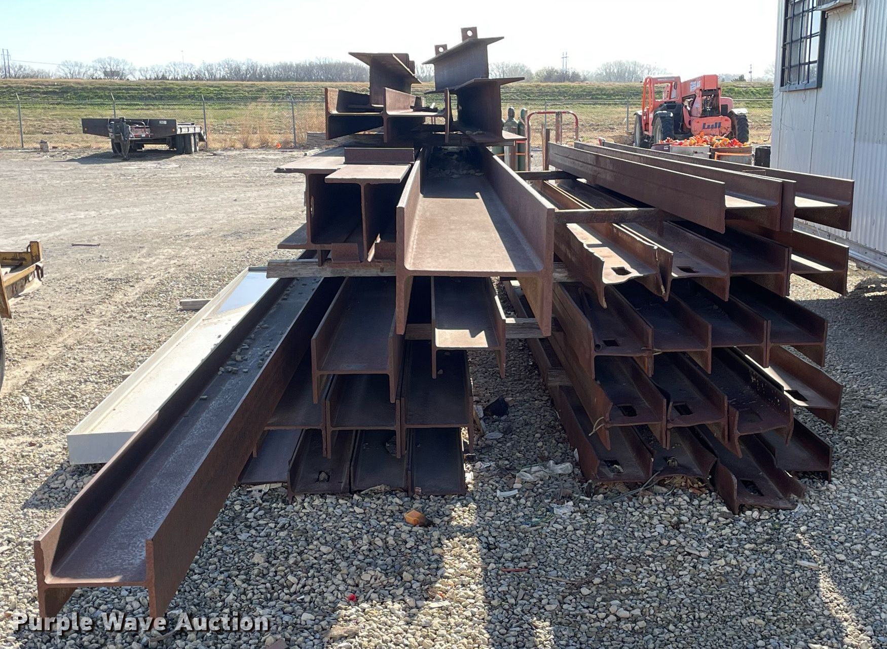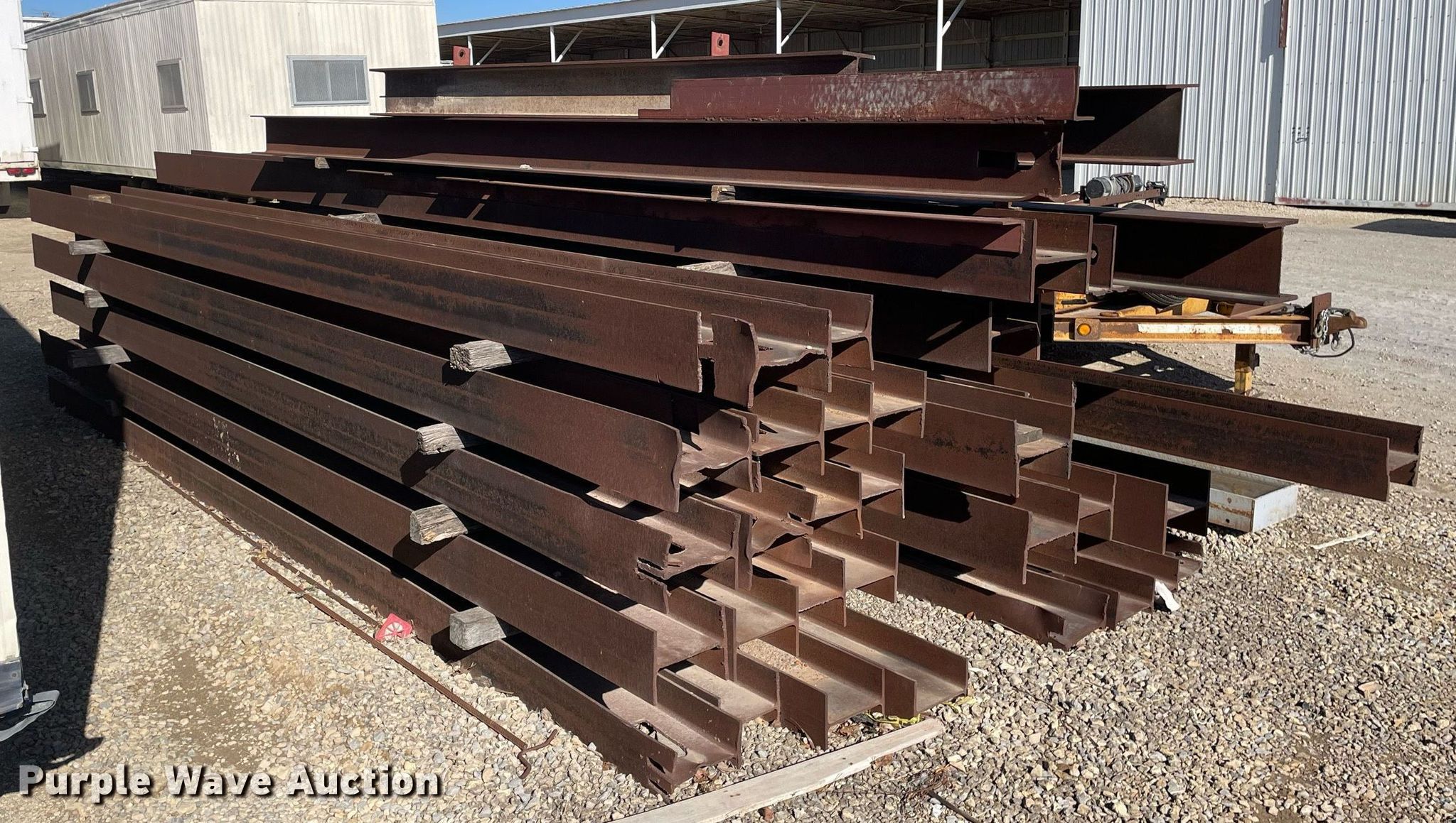 I-beams. (18) 20' X 9-5/8" X 8" Flange 3/8", Web 9/32", 30'L, (2) 25' X 9-7/8" X 8", Flange 9/16", Web 5/16", I-beam: 12-1/8" X 10" Flange 9/16", Web 11/32", (2) 15'L, 13'L, (5) 20'L, (1) 28'L. Coonrod & Associates Construction Co. Retirement. 3550 South Hoover Road. Wichita, KS 67215