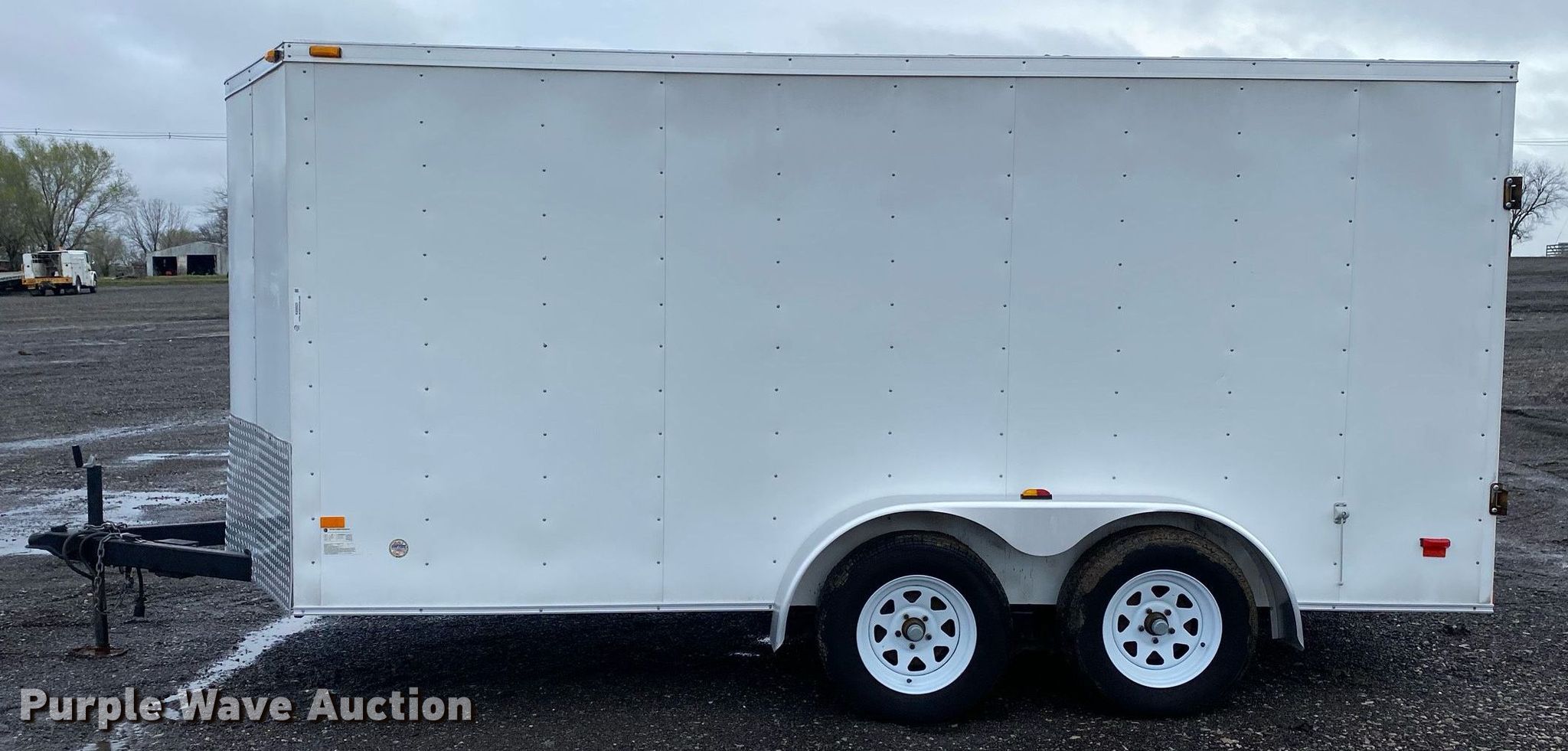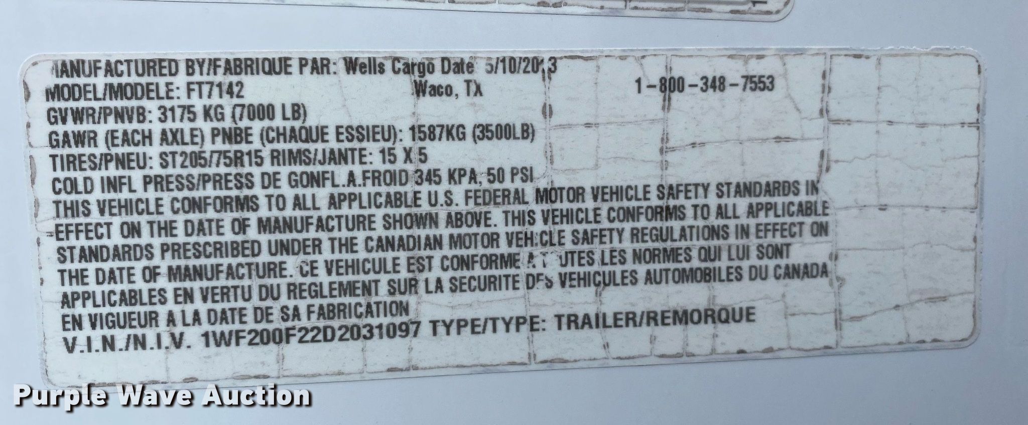 2013 Wells Cargo FT7142 enclosed cargo trailer. VIN: 1WF200F22D2031097. Dimensions Overall: 18' L x 102" W, Body: 16' L x 84" W. Features Deck type: Wood. Chassis Ball hitch: 2 5/16", Landing gear: Single, Suspension: Spring, Brakes: Electric, Axles: Tandem, GVWR: 7,000 lbs, GAWR: 3,500 lbs. Tires Steel wheels, Size: ST205/75R15. Notes Floor damaged. Oklahoma title. Title distribution may be delayed up to 14 days from verification of funds. 15107 North 137th East Avenue. Collinsville, OK 74021