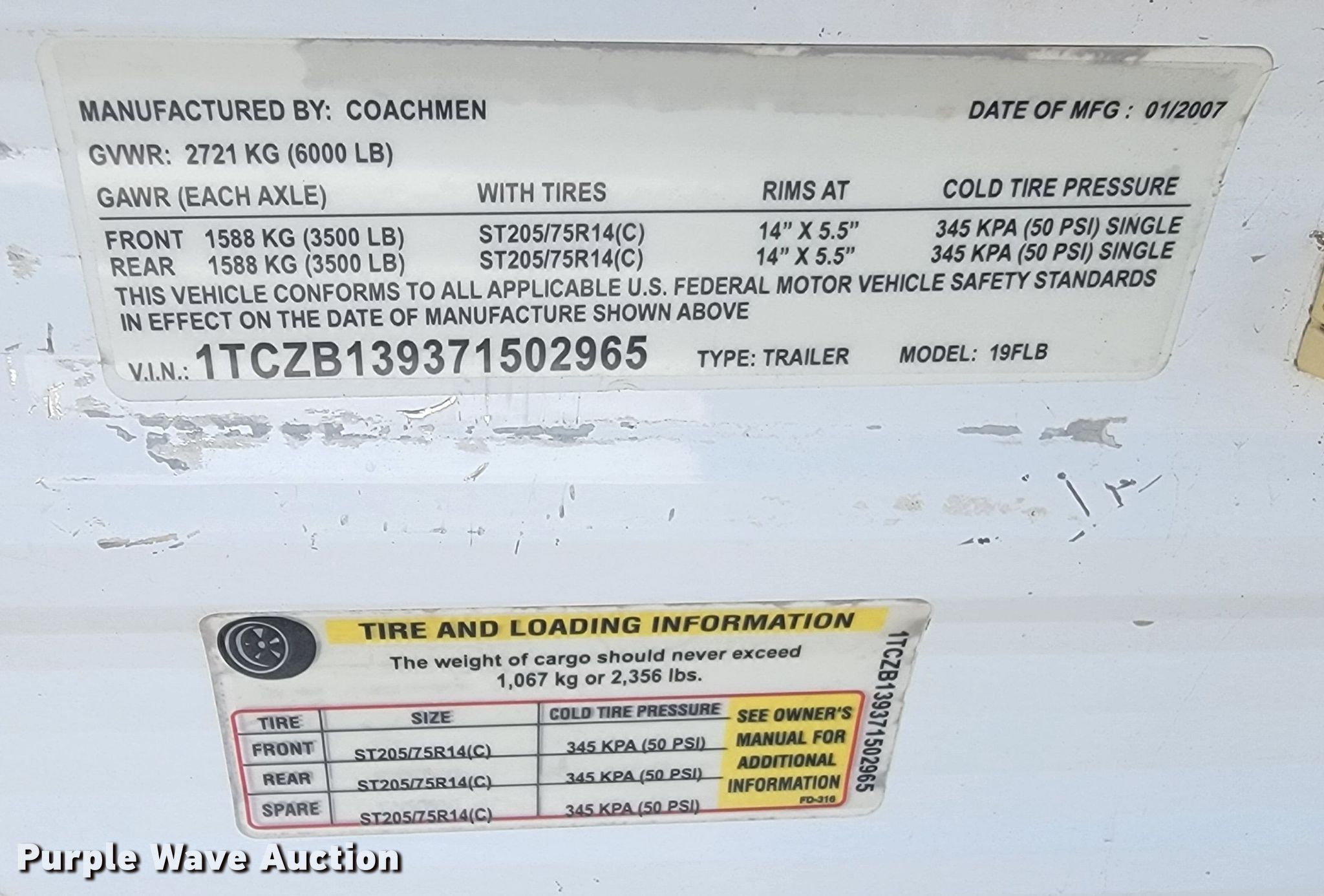 Purple Wave is selling a used RV or Camper in South Dakota. This item is a 2007 Coachman Spirit of America 19FLBSE camper with the following: Camper length: 21', VIN: 1TCZB139371502965