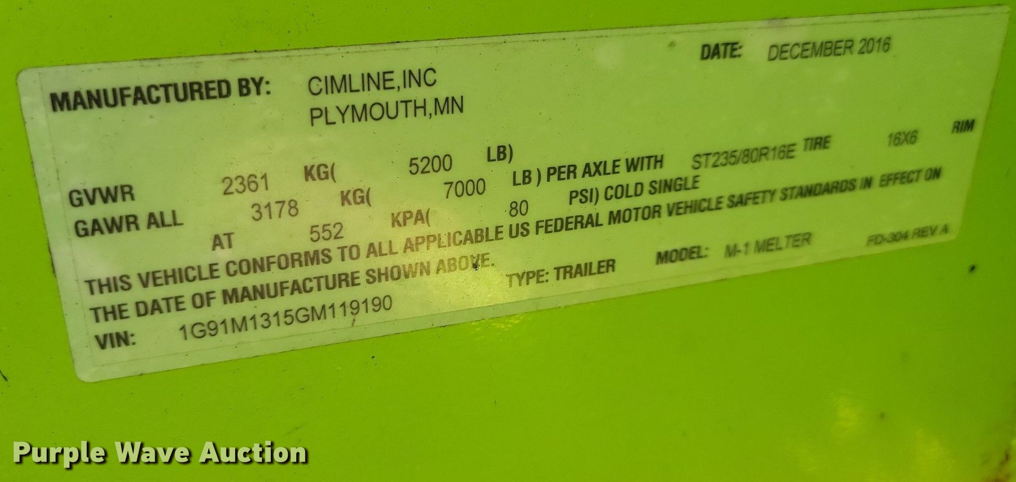 Purple Wave is selling a used Pot Hole Patcher in Iowa. This item is a 2016 Cimline M1 Magma melter applicator with the following: Hours: 22 on meter, VIN: 1G91M1315GM119190