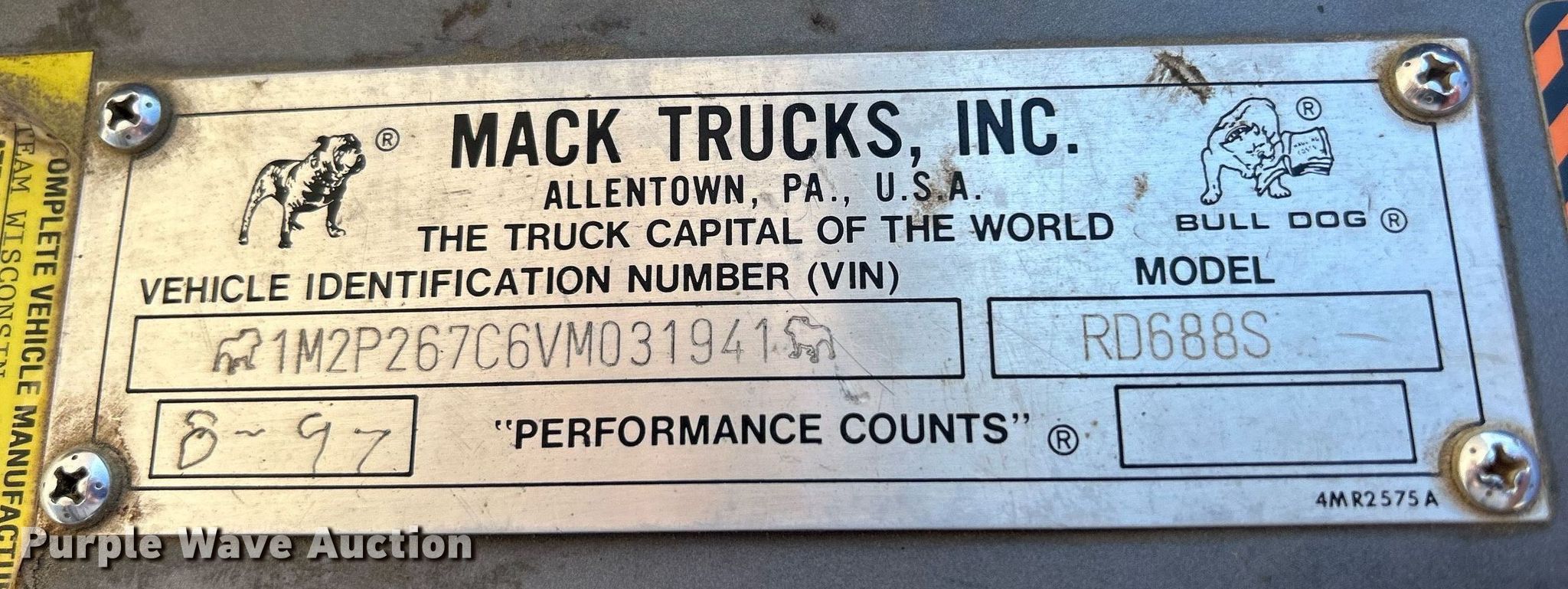 Purple Wave is selling a used Construction Dump Truck in Iowa. This item is a 1997 Mack RD688S dump truck with the following: Miles: 909,536 on odometer, Hours: 44,709 on meter, VIN: 1M2P267C6VM031941