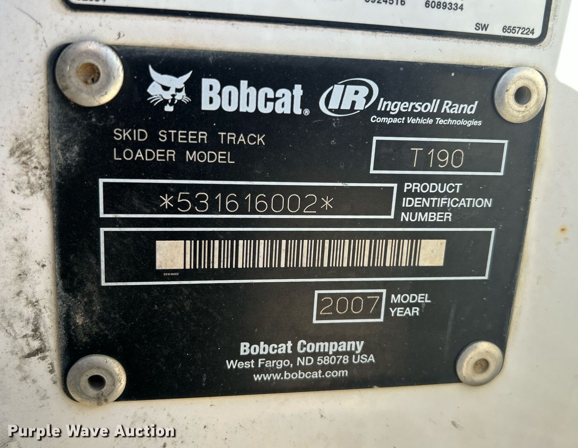 Purple Wave is selling a used Tracked Skid Steer Loader in Iowa. This item is a 2007 Bobcat T190 tracked skid steer loader with the following: Hours: 5,641 on meter, Serial: 531616002