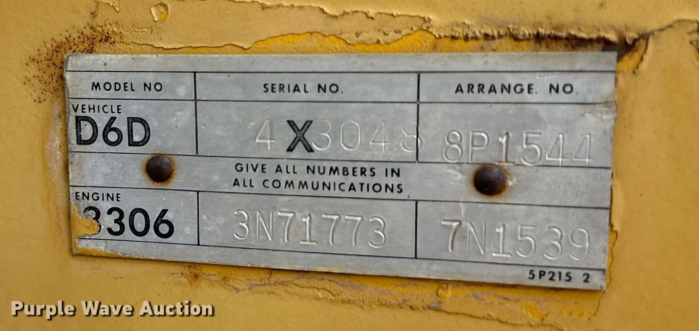 1978 Caterpillar D6D dozer. Hours: 13,146 on meter, Serial: 4X3048. Engine Caterpillar 3306, Serial: 3N71773, Cylinders: 6, Fuel type: Diesel. Transmission Powershift, 3F - 3R. Operators station Steering: Clutch brake. Features Screen guards, Sweeps, Rear drawbar, Dozer blade Type: Straight, Single-tilt, Width: 10'. Tracks Width: 24", Grouser pads: Single, Bottom rollers: 5. Notes Contents not included , Fire damage , Non-operational unit. Travis Walker Construction. 309 E Walnut St. Stewartsville, MO 64490