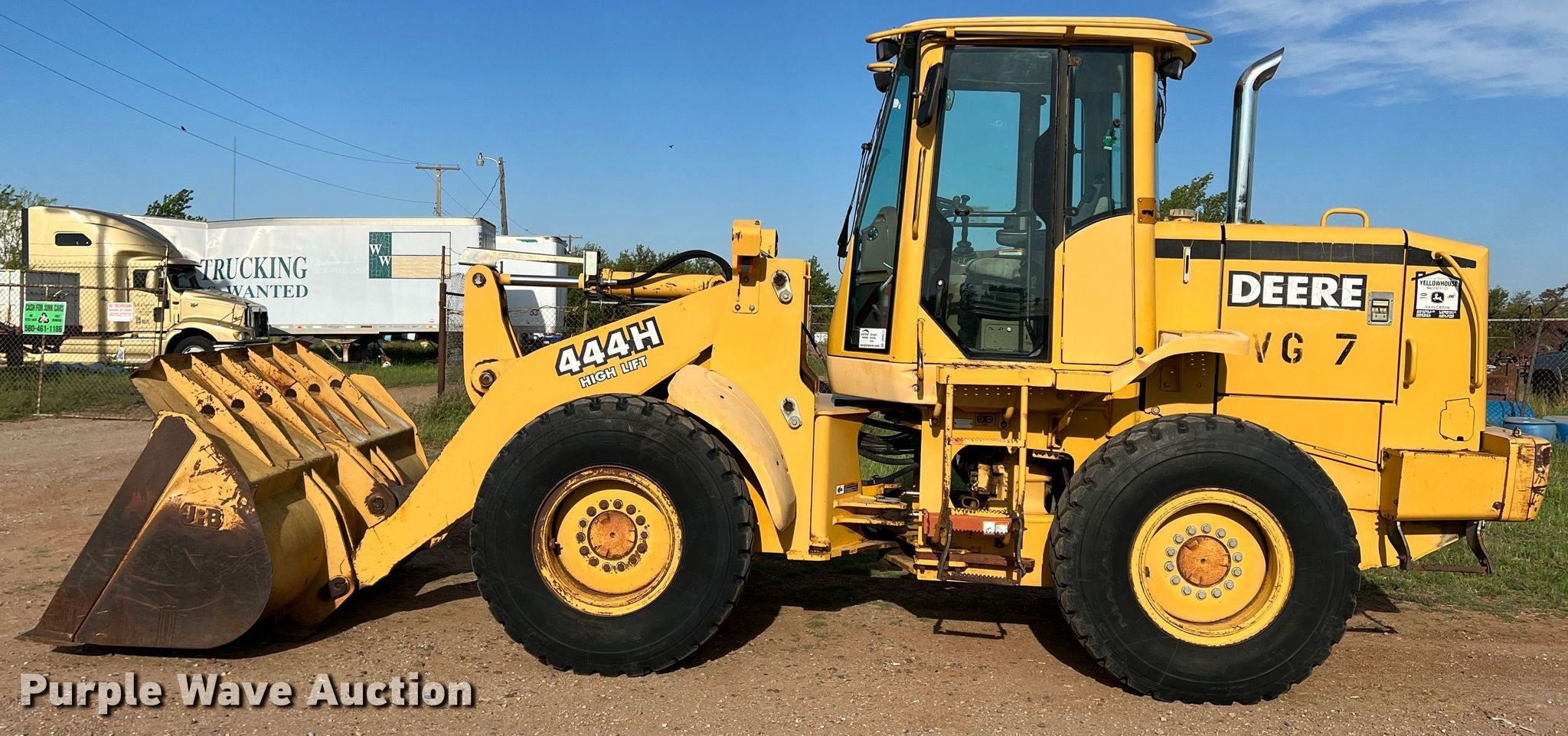Purple Wave is selling a used Wheel Loader in Oklahoma. This item is a 2001 John Deere 444H high lift wheel loader with the following: Hours: 7,155 on meter, Serial: DW444HX579348