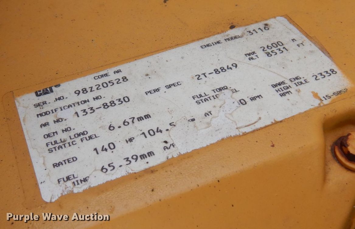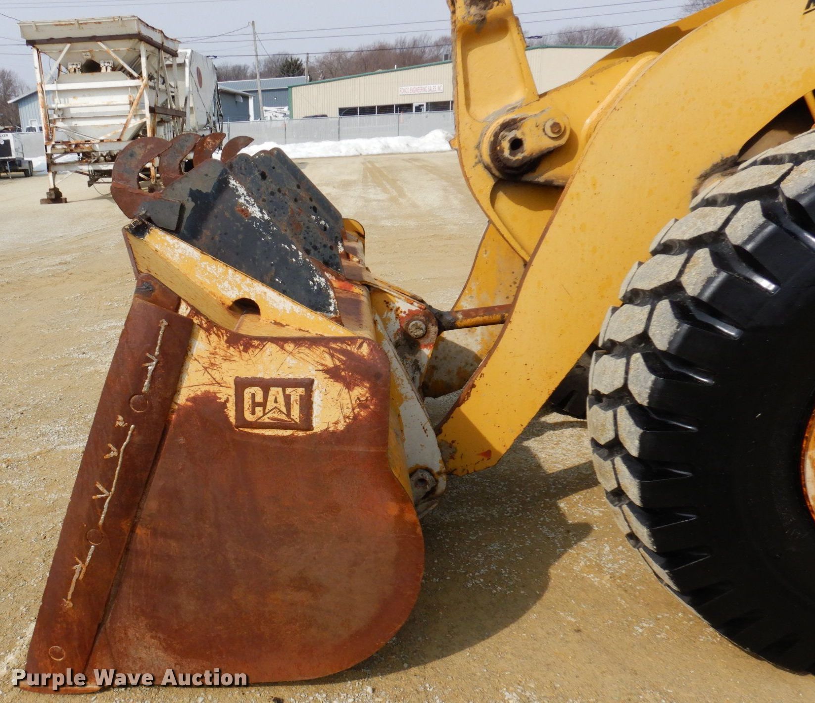 1997 Caterpillar 938F wheel loader. Hours: 730 on meter, Actual hours unknown, Serial: 1KM02205. Engine Caterpillar 3116, Cylinders: 6, Fuel type: Diesel, HP: 104. Transmission Powershift, 4F - 4R. Operators station EROPS, Heat, Bucket controls: Joystick. Features Bucket Width: 106", Cutting edge: Bolt-on. Tires Size: 20.5-25. Notes Glass cracked, Non-operational dash cluster. Rochester Asphalt Partial Retirement Sale. 1832 3rd Avenue Southeast. Rochester, MN 55904