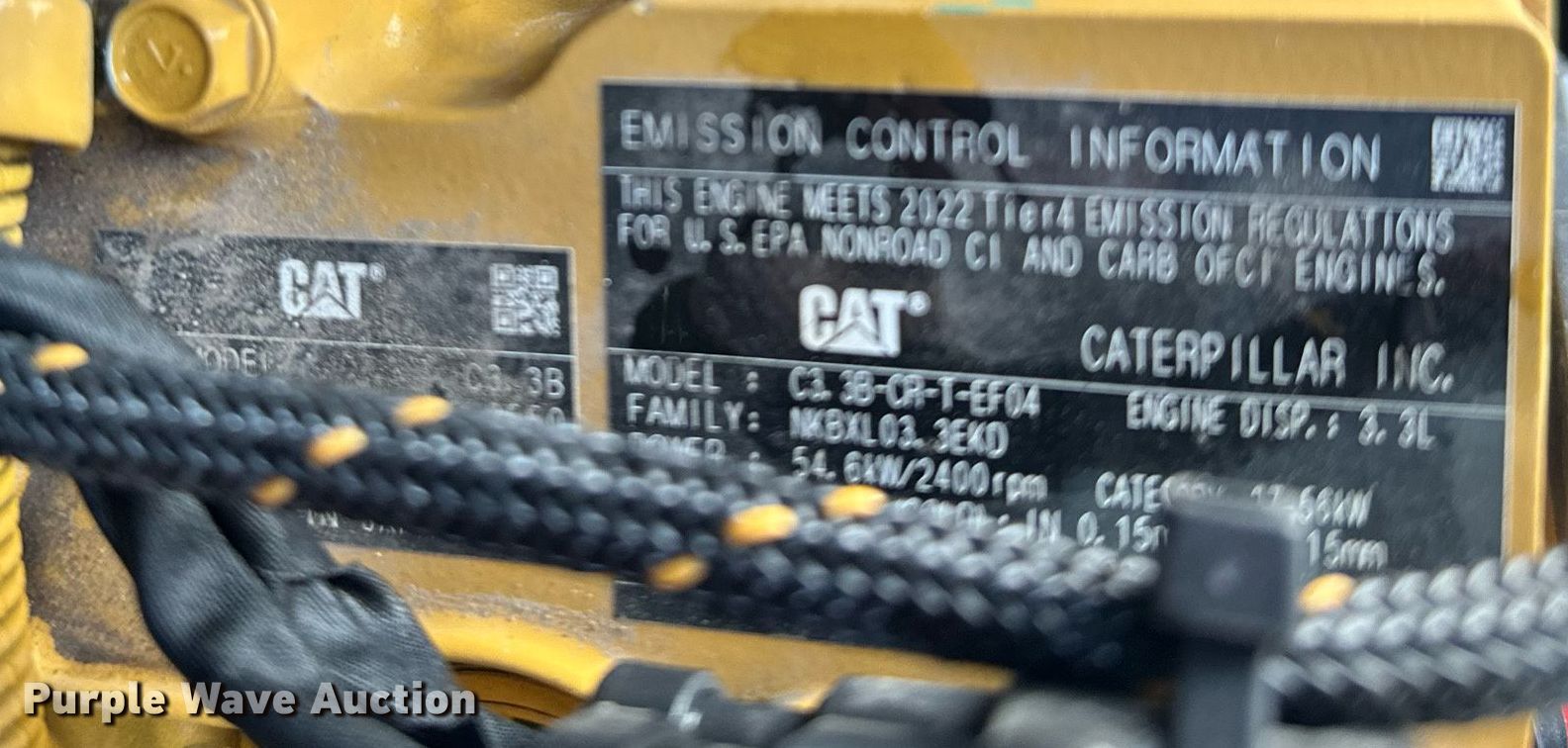 2022 Caterpillar 259D3 tracked skid steer loader. Hours: 29 on meter, Serial: CAT0259DCCW920155. Engine Caterpillar C3.3B, Displacement: 3.3L, Cylinders: 4, Fuel type: Diesel, kW: 54.6. Transmission Hydrostatic, Two speed travel. Operators station EROPS, AC, Heat, Bucket control: Hand, Electronic Monitoring System panel. Features Auxiliary hydraulics, Auxiliary electrical outlet, Quick coupler: Hydraulic, Bucket Caterpillar 279-5372, Capacity: 0.57 cu.yd., Width: 73", Cutting edge: Bolt-on. Tracks Brand: Caterpillar, Width: 15.5". Notes Transferable limited warranty valid through August 2024 or 2,000 hours on meter, Transferable limited emissions warranty valid through August 2027 or 3,000 hours on meter. 39402 151st Avenue. Montgomery, MN 56069