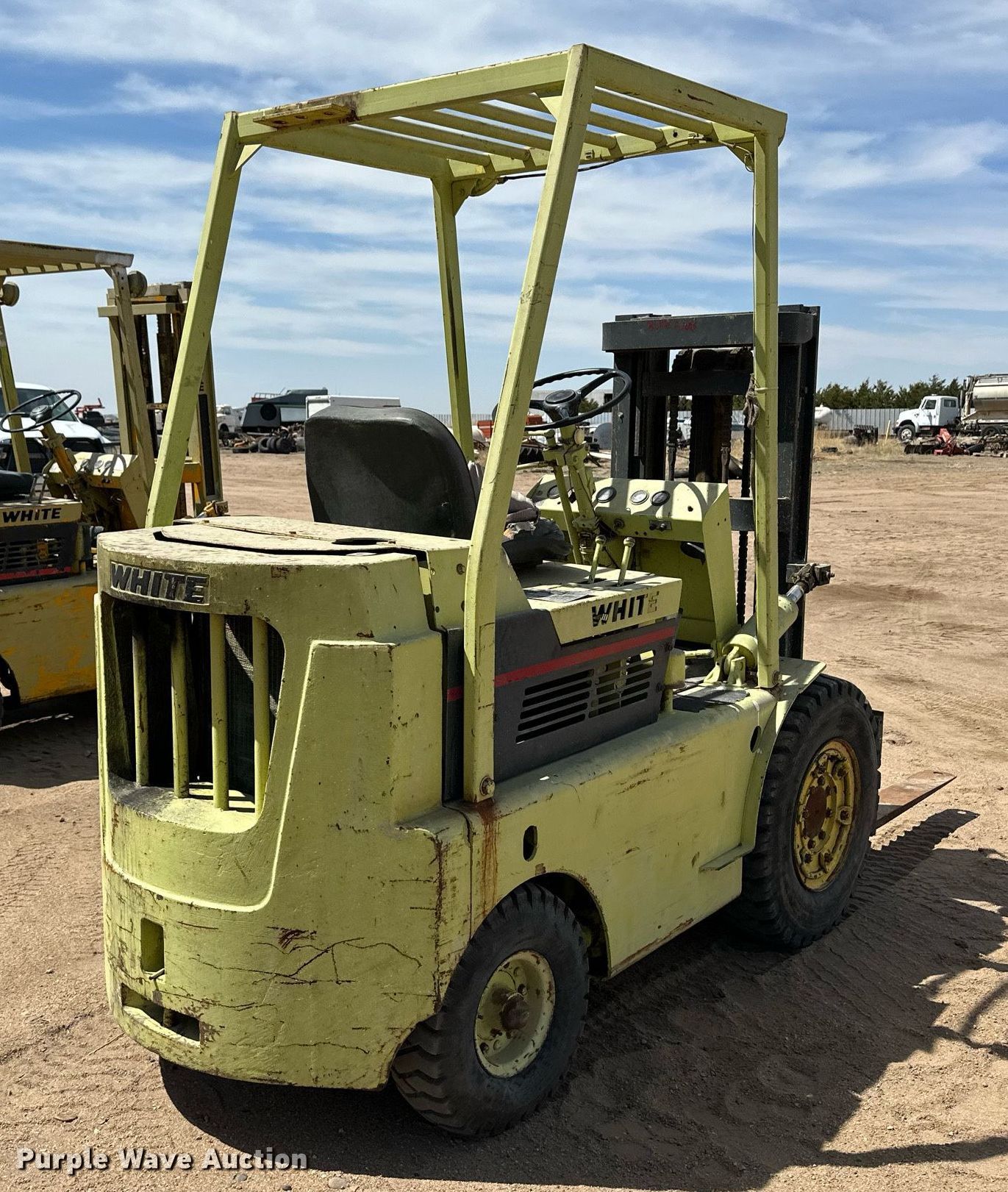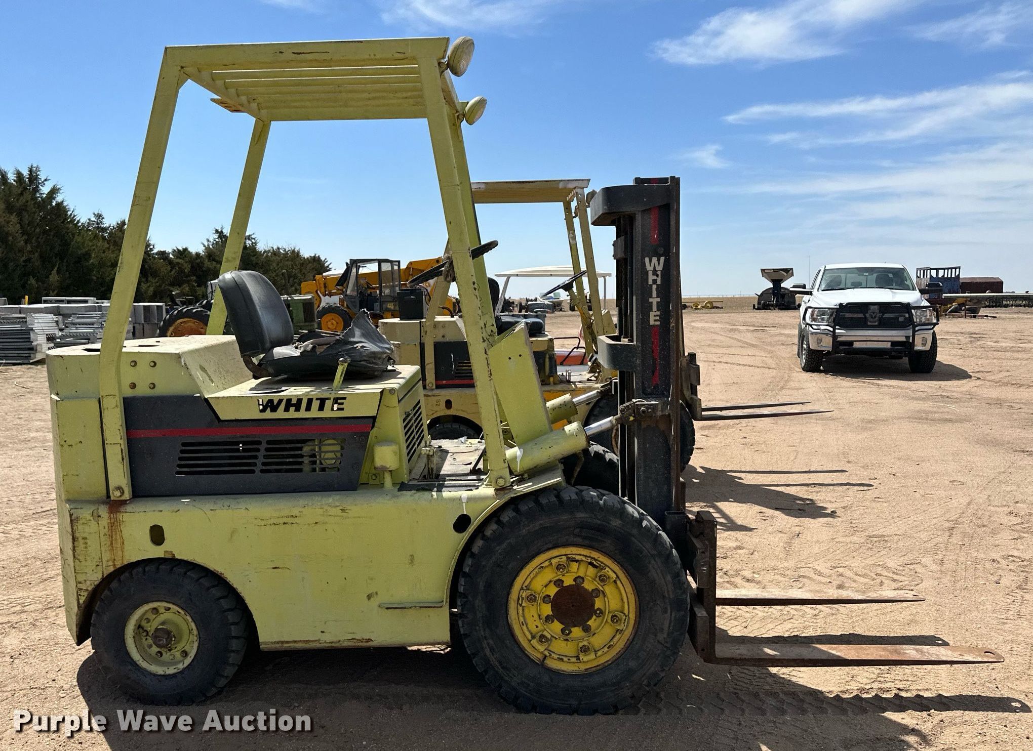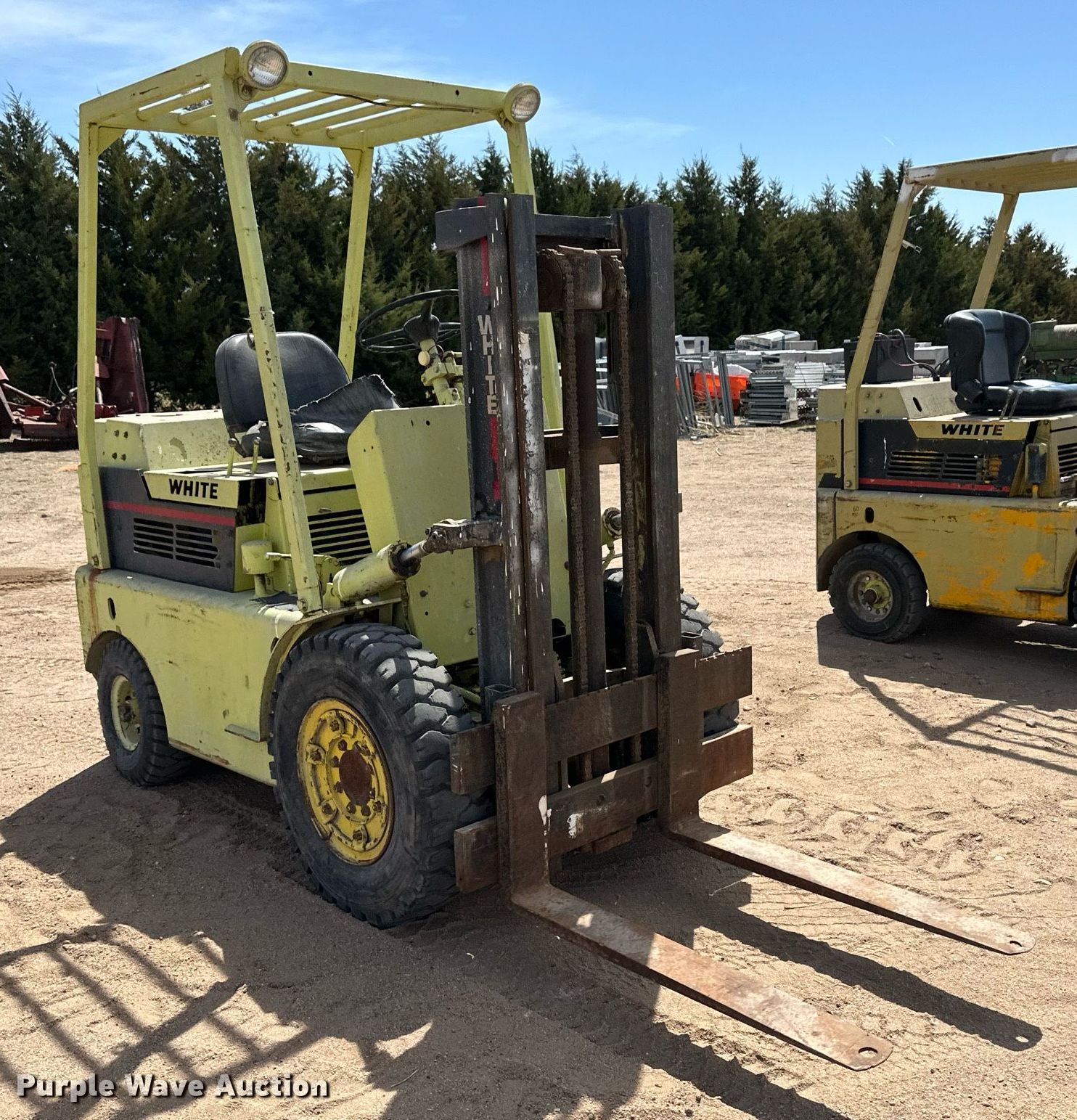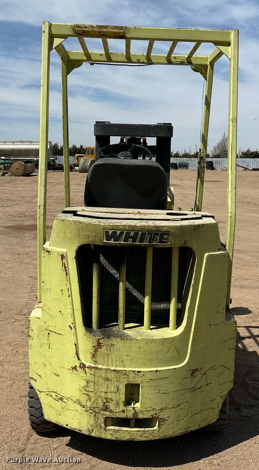 White MY9408 forklift. Hours: 3,167 on meter, Serial: 6400287. Engine Chrysler, Cylinders: 6, Fuel type: Gas. Transmission Powershift. Operators station Canopy. Features Mast stages: 2, Mast tilt, Fork length: 40". Tires Front: 7.50-15, Rear: 6.90/6.00-6. 1587 Cottonwood. Sublette, KS 67877