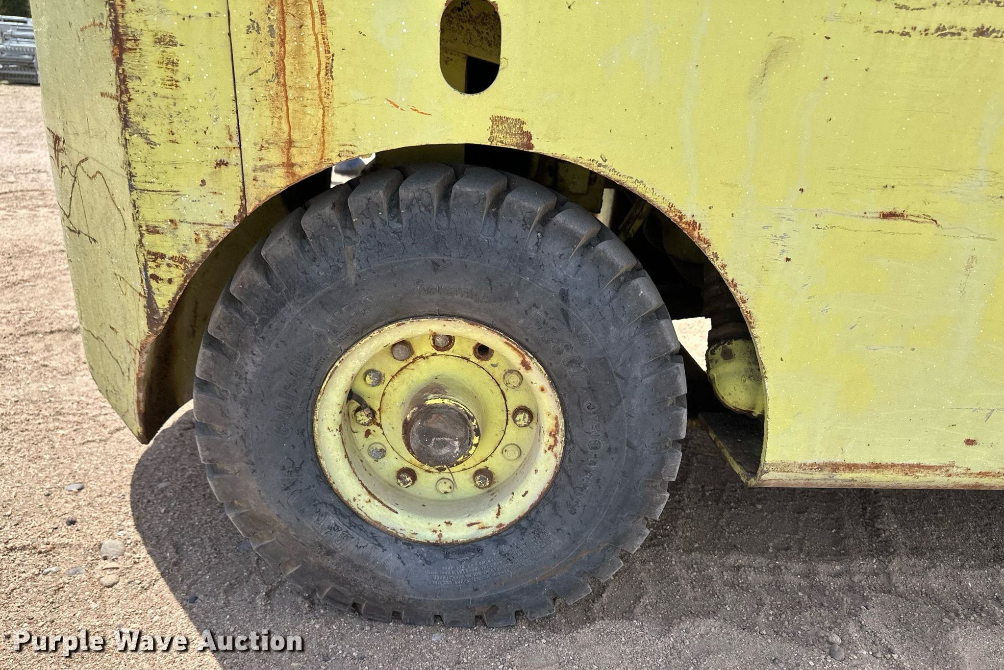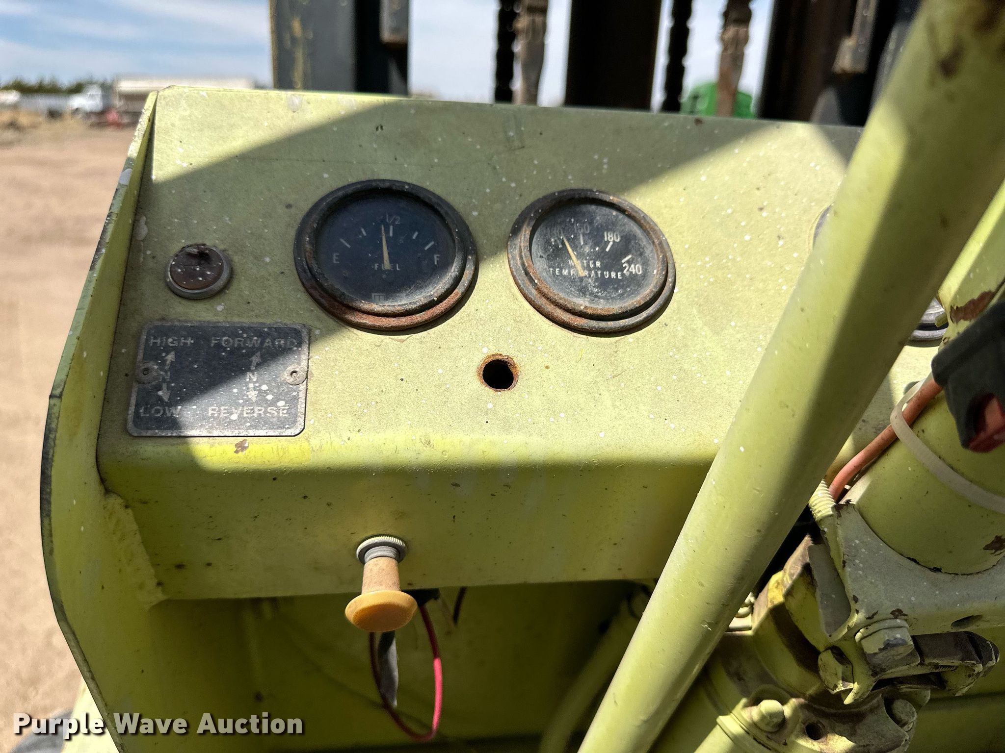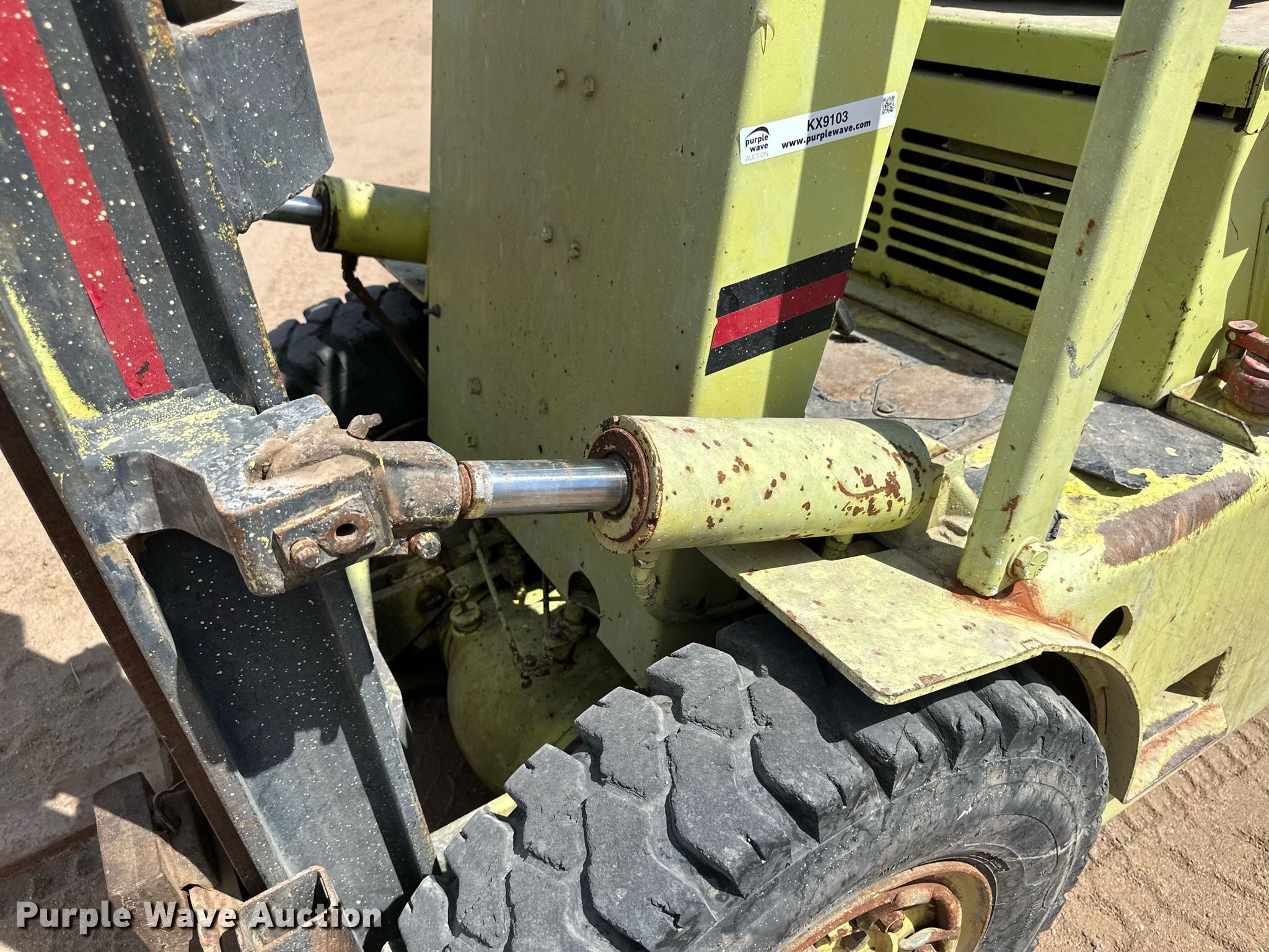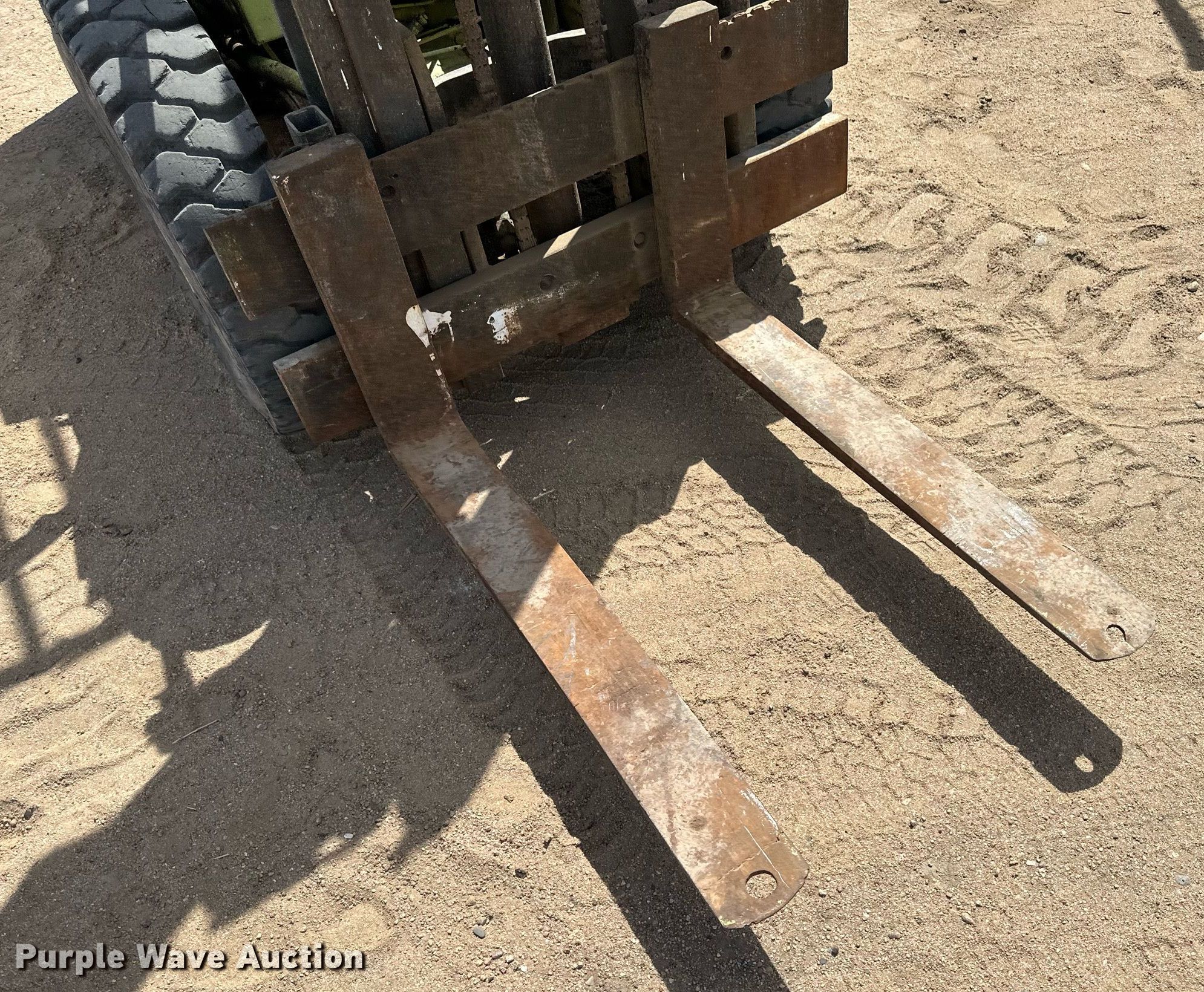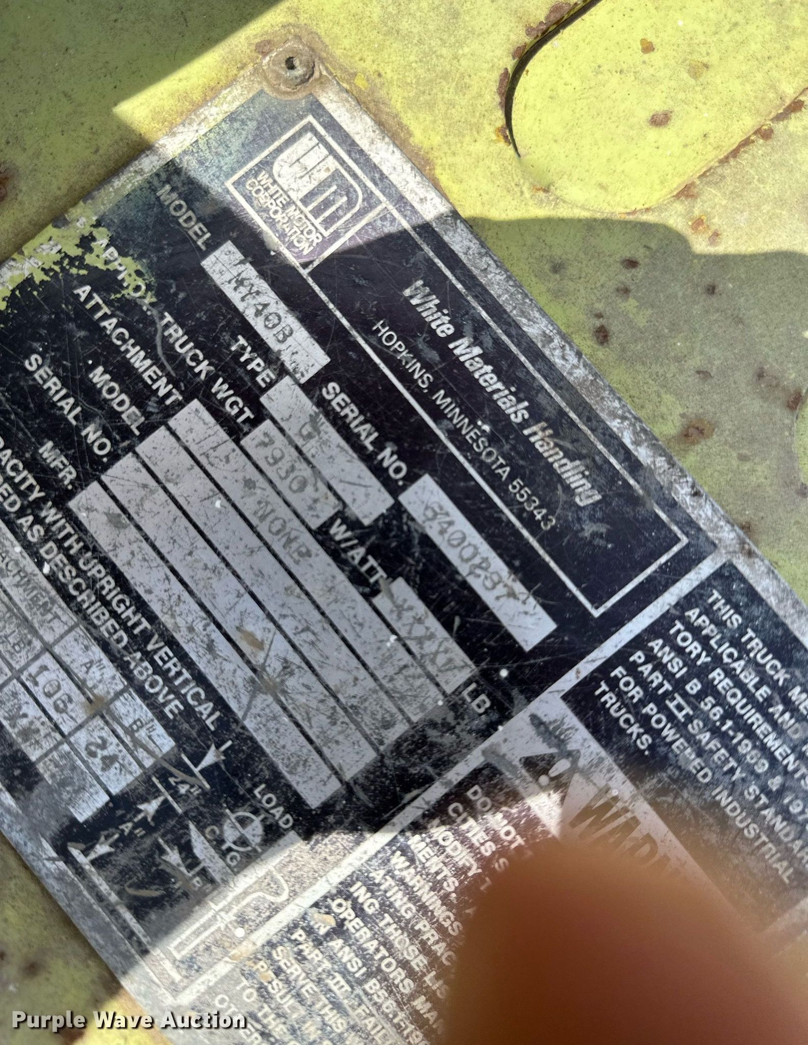 White MY9408 forklift. Hours: 3,167 on meter, Serial: 6400287. Engine Chrysler, Cylinders: 6, Fuel type: Gas. Transmission Powershift. Operators station Canopy. Features Mast stages: 2, Mast tilt, Fork length: 40". Tires Front: 7.50-15, Rear: 6.90/6.00-6. 1587 Cottonwood. Sublette, KS 67877