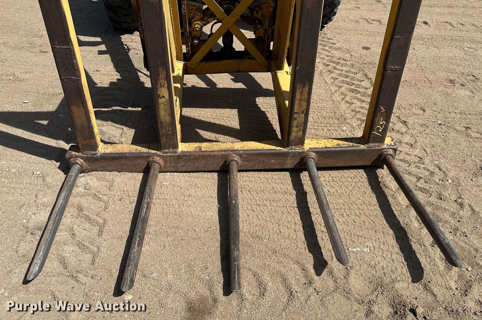 1981 Caterpillar 920 wheel loader. Hours: 11,754 on meter, Serial: 62K11754. Engine Cylinders: 4, Fuel type: Diesel. Transmission Two speed travel, 4F - 3R. Operators station Enclosed cab, Bucket controls: Two-lever. Features Quick coupler: Hydraulic, Bale forks Length: 36". Tires Front: 15.5R25. 1587 Cottonwood. Sublette, KS 67877