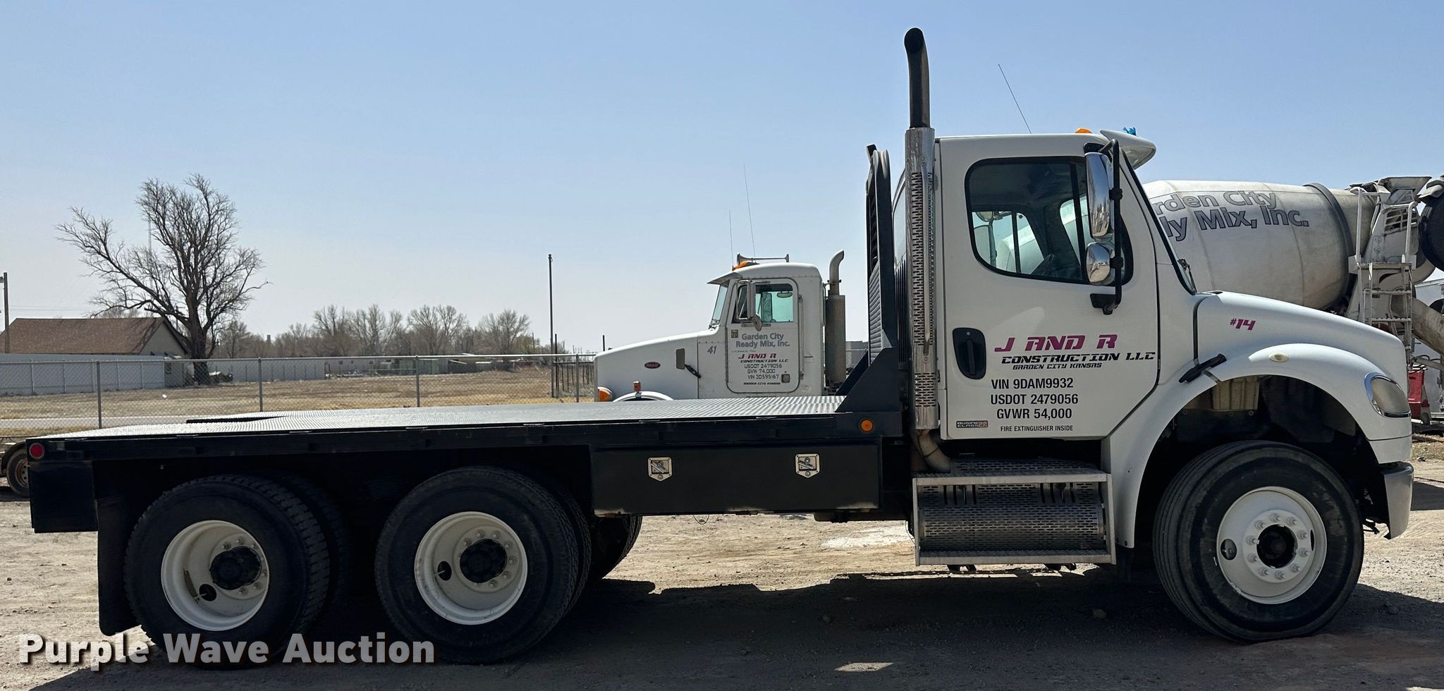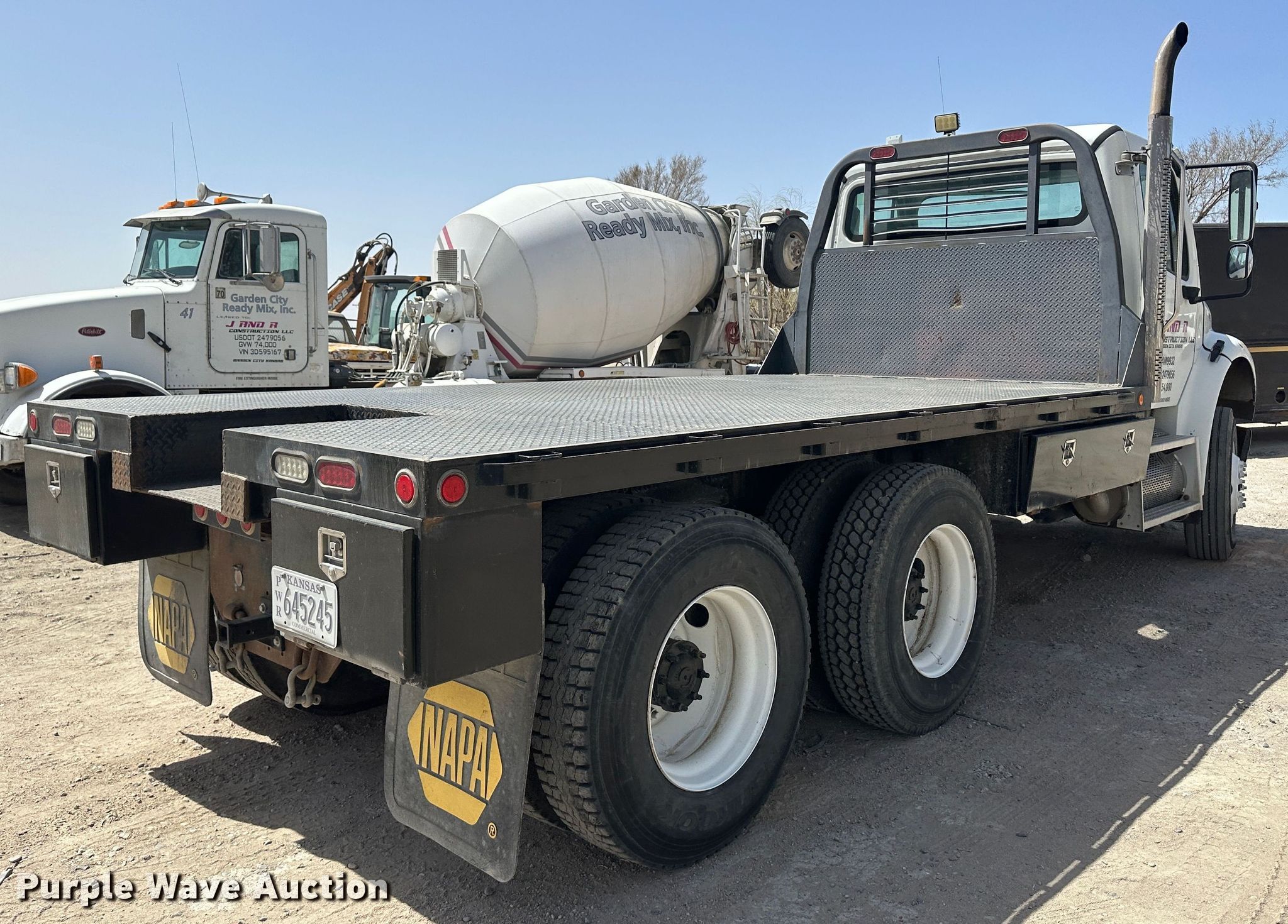 2009 Freightliner M106 flatbed truck. Miles: 166,820 on odometer, Hours: 4,799 on meter, VIN: 1FVHCYBS09DAM9932. Engine Cummins, Cylinders: 6, Fuel type: Diesel. Transmission Automatic. Chassis Axles: Tandem, Suspension: Spring, Brakes: Air. Interior AC, Heat, Heated mirrors, Cruise control, Brake controller. Features Flatbed 15' L x 96" W, Gooseneck hitch. Tires Size: 11R22.5. Kansas title. Title distribution may be delayed up to 14 days from verification of funds. J&R Construction LLC. Garden City, KS 67846