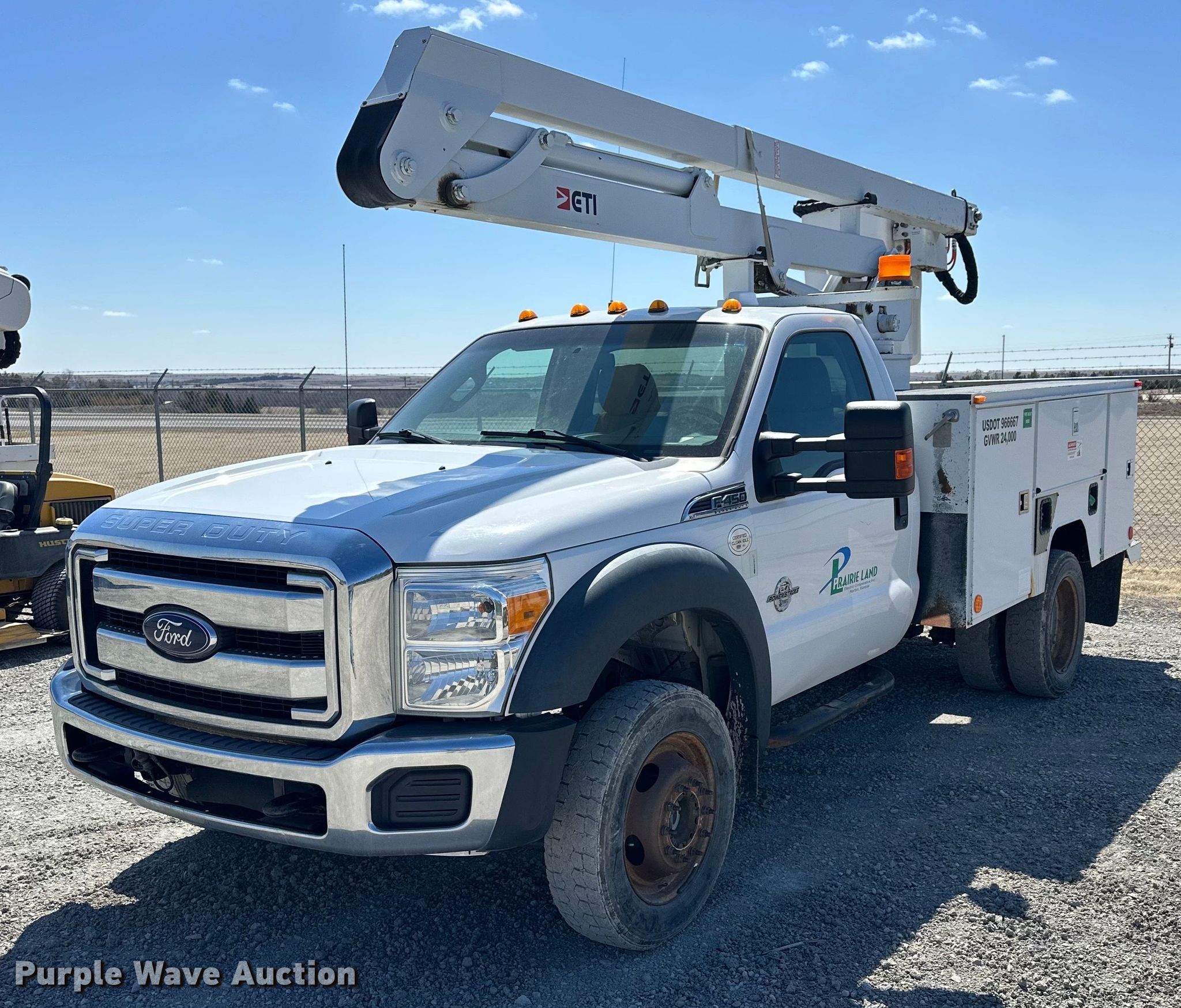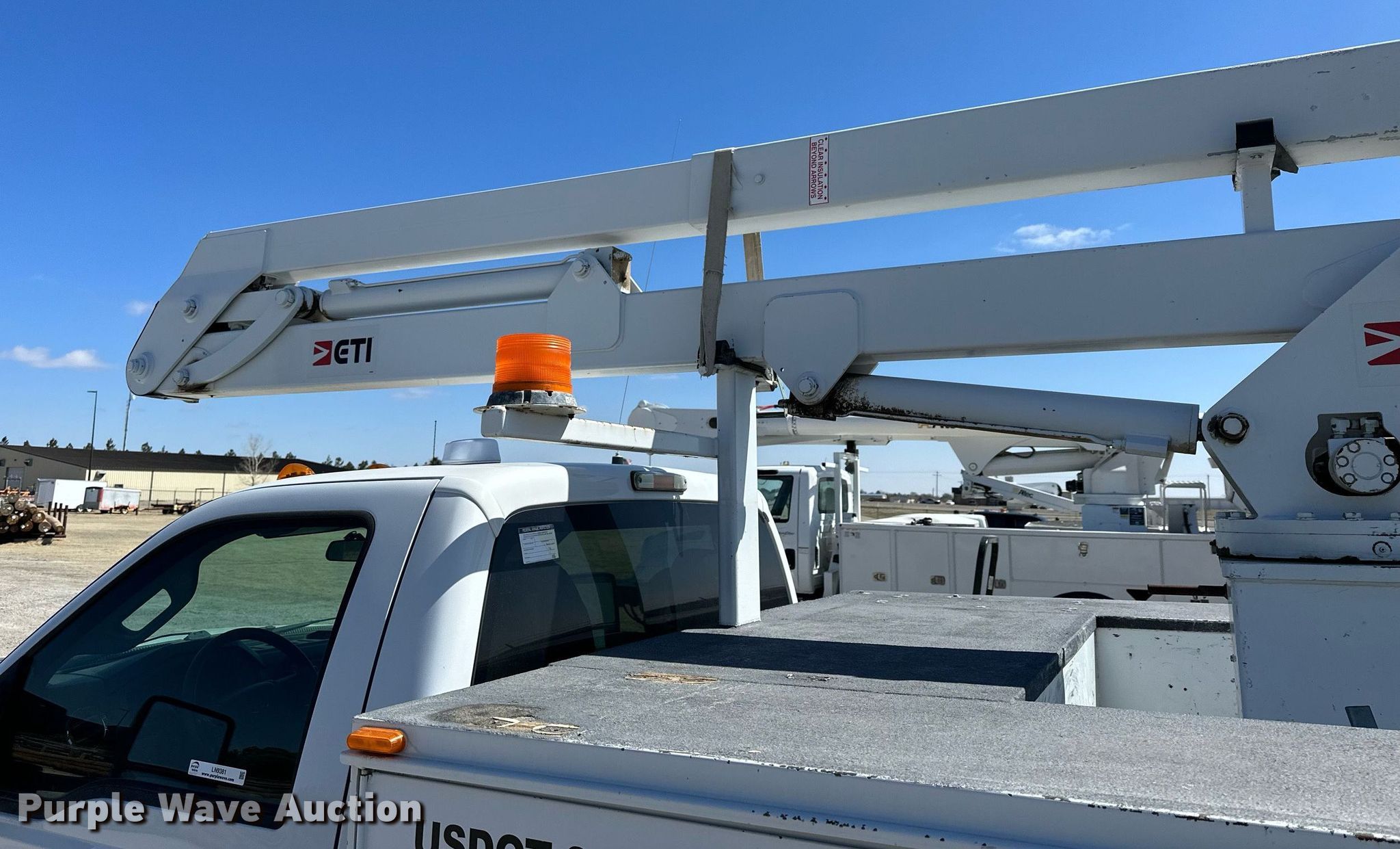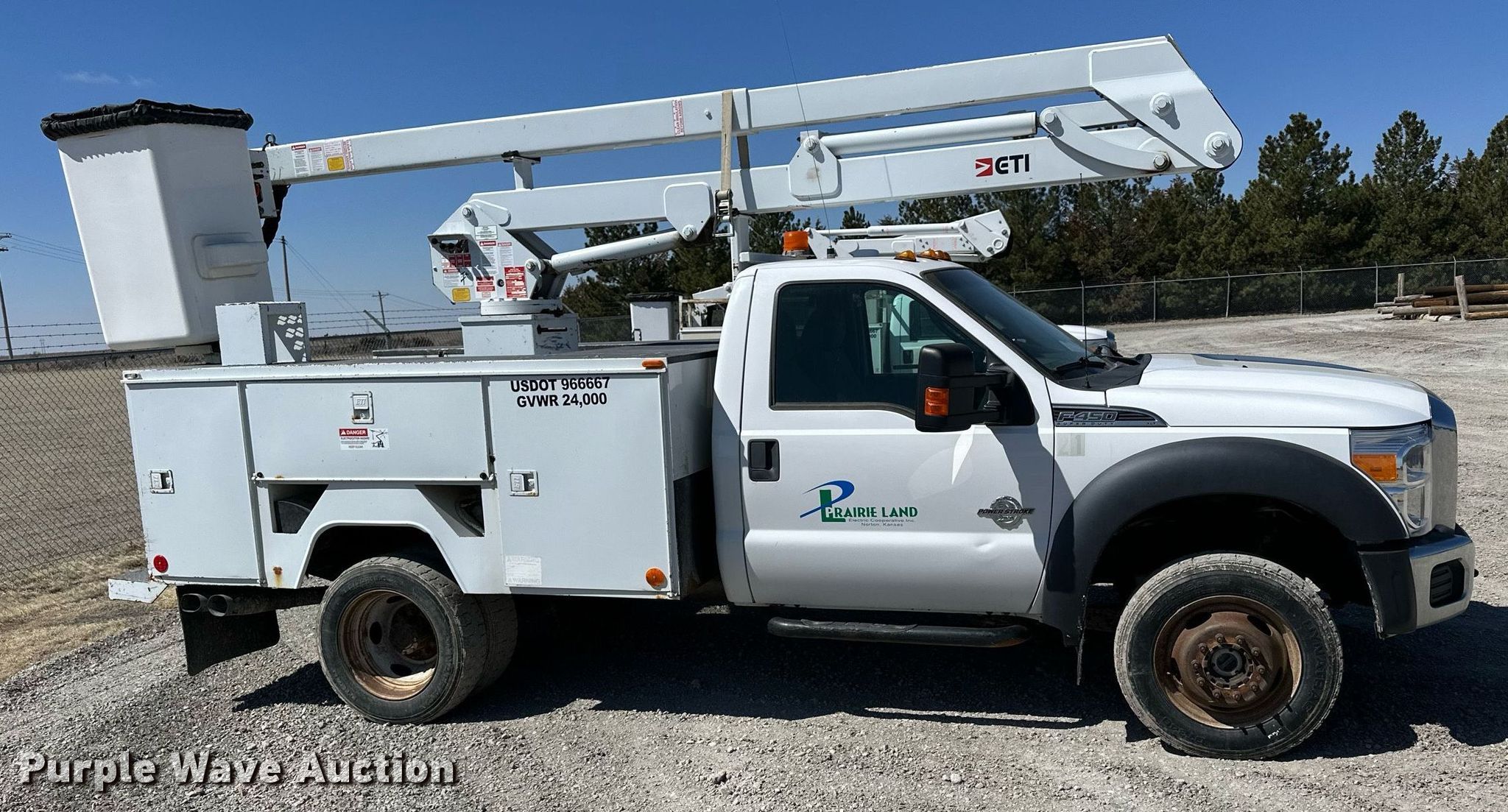 2014 Ford F450 Super Duty bucket truck. Miles: Unknown, VIN: 1FDUF4HT9EEB66979. Engine Displacement: 6.7L, Cylinders: 8, Fuel type: Diesel. Transmission Automatic. Chassis Four wheel drive, Axles: Single, Suspension: Spring, Brakes: Hydraulic, PTO, GVWR: 16,500 lbs, Wheelbase: 141". Interior AC, Heat, Heated mirrors, Power windows, Power locks, Cruise control, Auxiliary controls, Brake controller. Features Bed ETI SB10805355, Serial: 10288, 9' L x 94" W, Boom 2006 ETI ETA33IH, Serial: 0906A34653, Maximum lift capacity: 300 lbs, Maximum lift height: 33', Boom type: Articulating, Man basket, Boom controls Ground, Platform/ basket.. Tires Size: 225/70R19.5. Notes Battery missing, Non-operational engine, Non-operational unit. Kansas title. Mileage has not been verified. Odometer discrepancy will be marked on the title. Title distribution may be delayed up to 14 days from verification of funds. Prairie Land Electric Coop Inc.. 14935 US-36. Norton, KS 67654