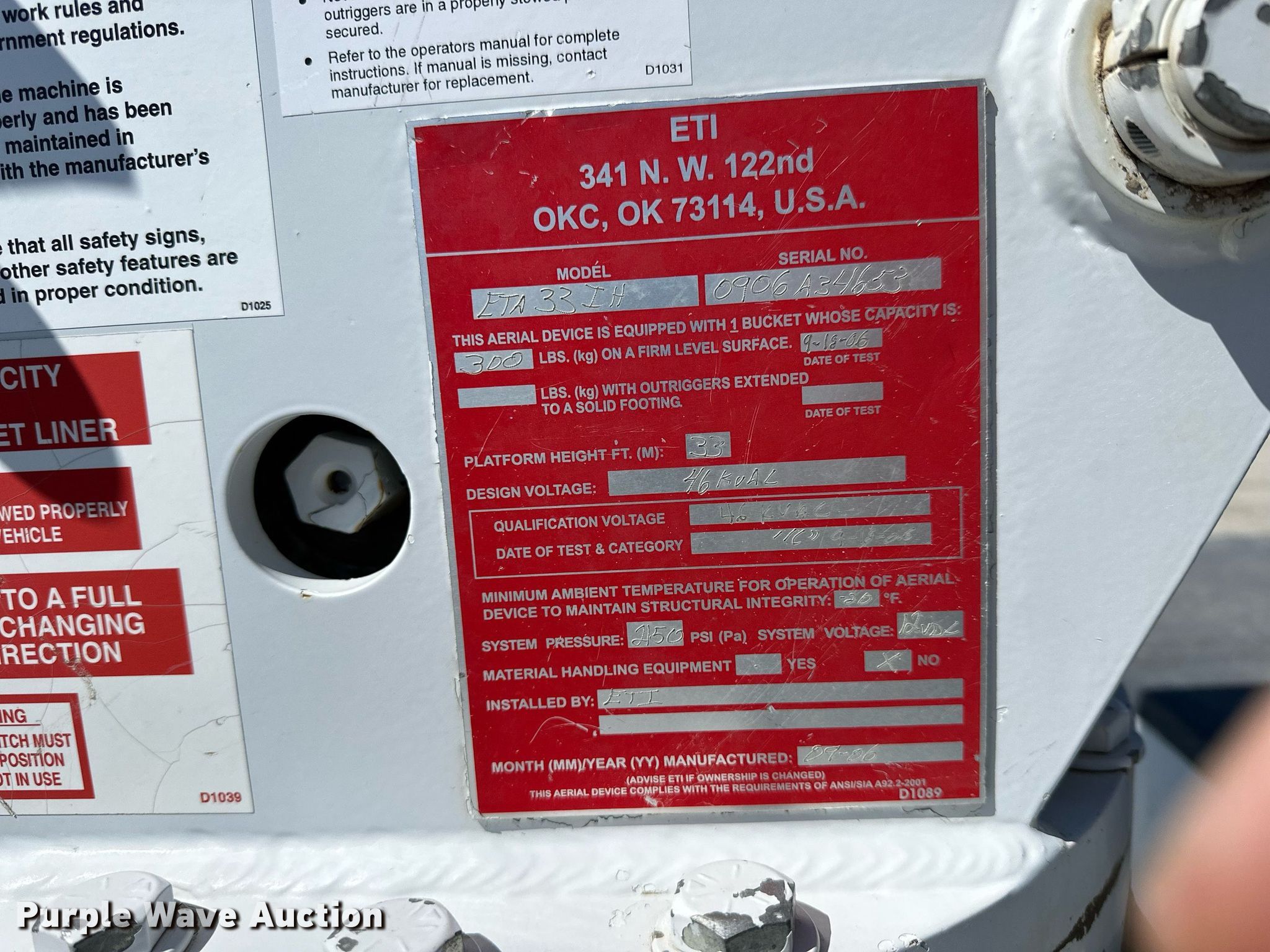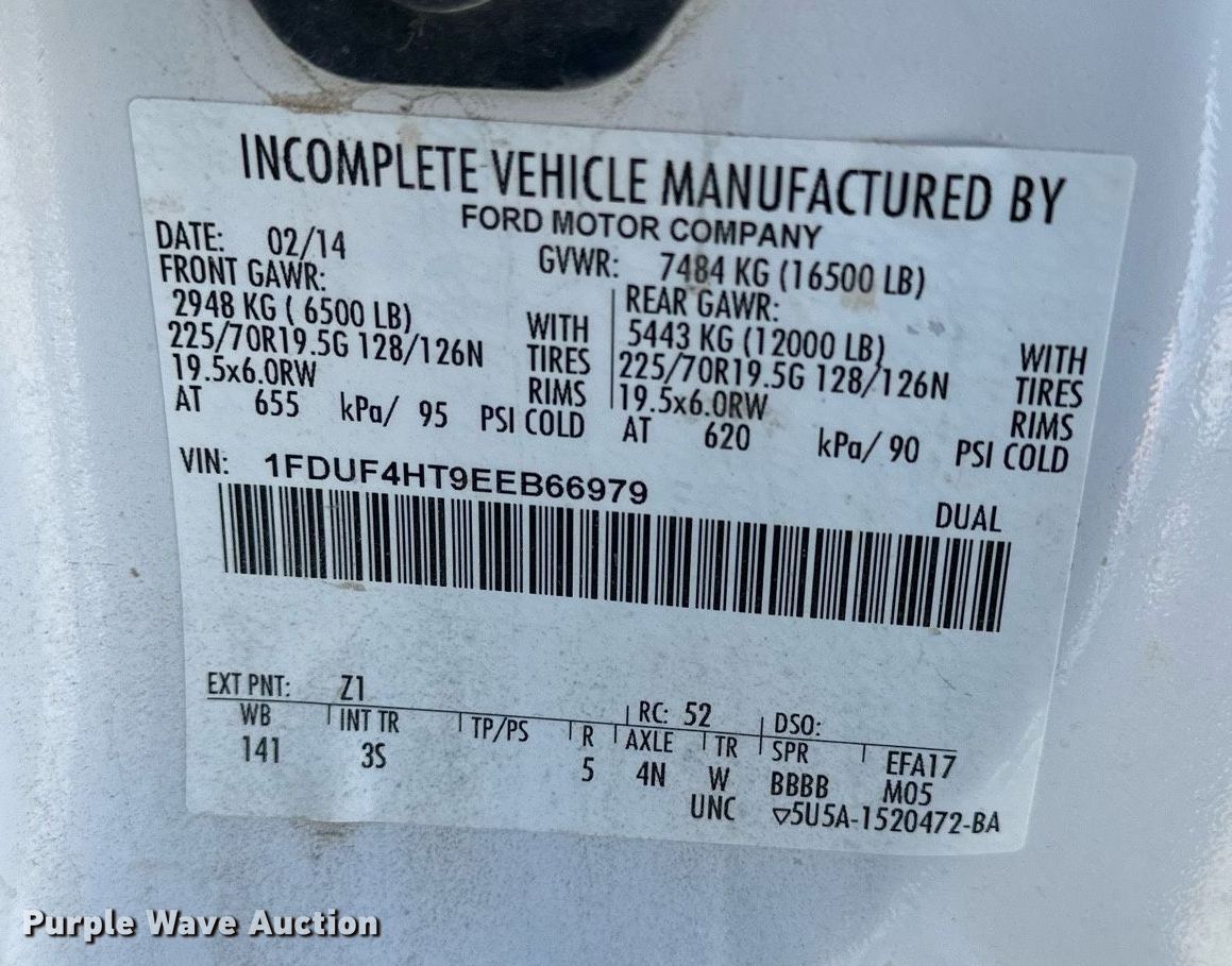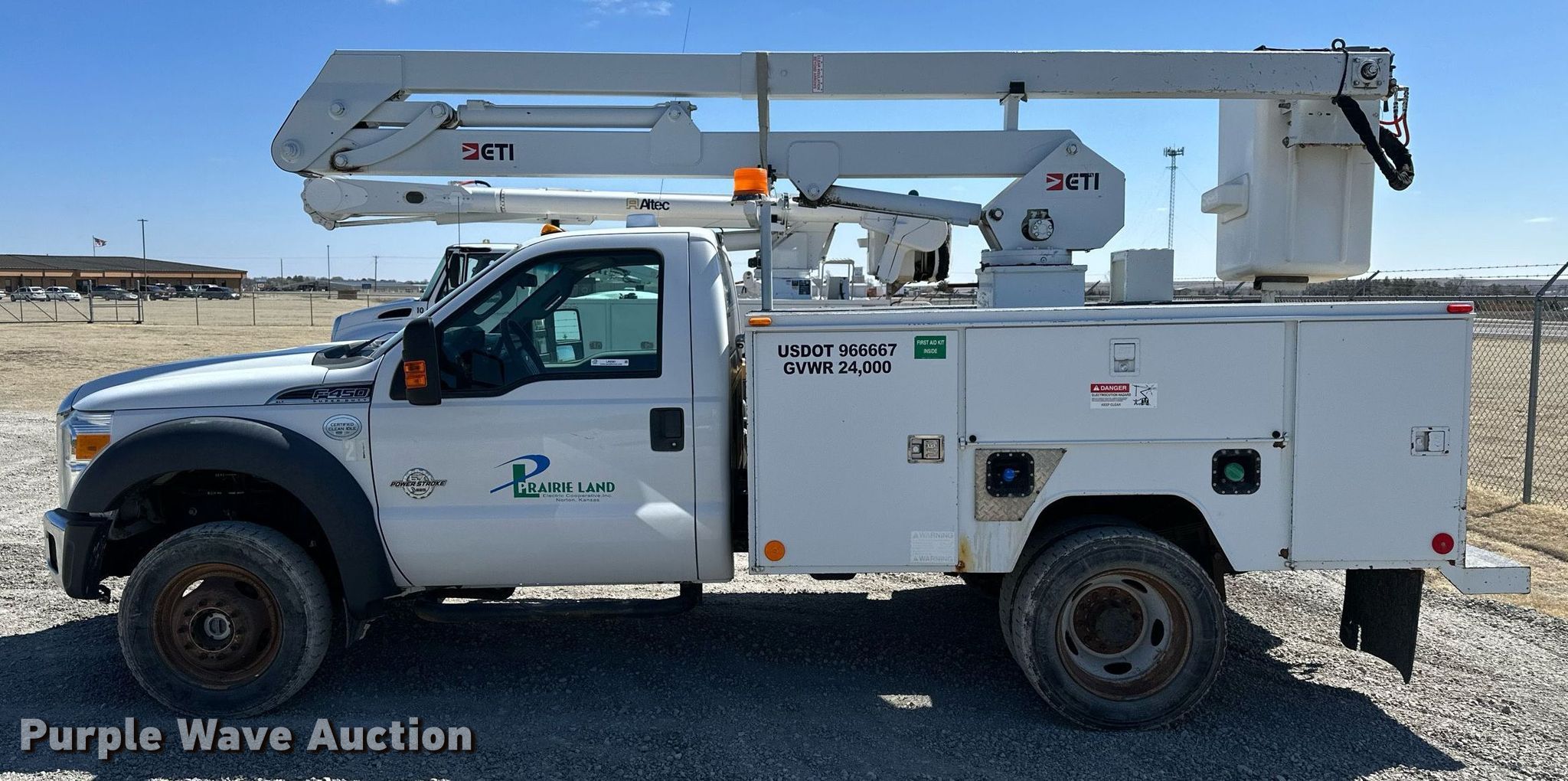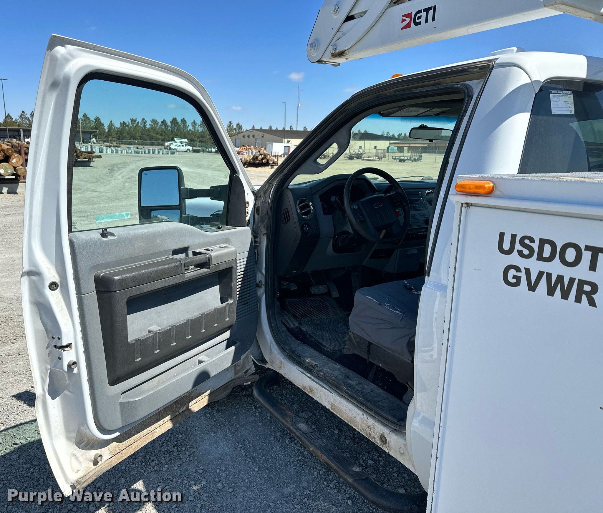 2014 Ford F450 Super Duty bucket truck. Miles: Unknown, VIN: 1FDUF4HT9EEB66979. Engine Displacement: 6.7L, Cylinders: 8, Fuel type: Diesel. Transmission Automatic. Chassis Four wheel drive, Axles: Single, Suspension: Spring, Brakes: Hydraulic, PTO, GVWR: 16,500 lbs, Wheelbase: 141". Interior AC, Heat, Heated mirrors, Power windows, Power locks, Cruise control, Auxiliary controls, Brake controller. Features Bed ETI SB10805355, Serial: 10288, 9' L x 94" W, Boom 2006 ETI ETA33IH, Serial: 0906A34653, Maximum lift capacity: 300 lbs, Maximum lift height: 33', Boom type: Articulating, Man basket, Boom controls Ground, Platform/ basket.. Tires Size: 225/70R19.5. Notes Battery missing, Non-operational engine, Non-operational unit. Kansas title. Mileage has not been verified. Odometer discrepancy will be marked on the title. Title distribution may be delayed up to 14 days from verification of funds. Prairie Land Electric Coop Inc.. 14935 US-36. Norton, KS 67654