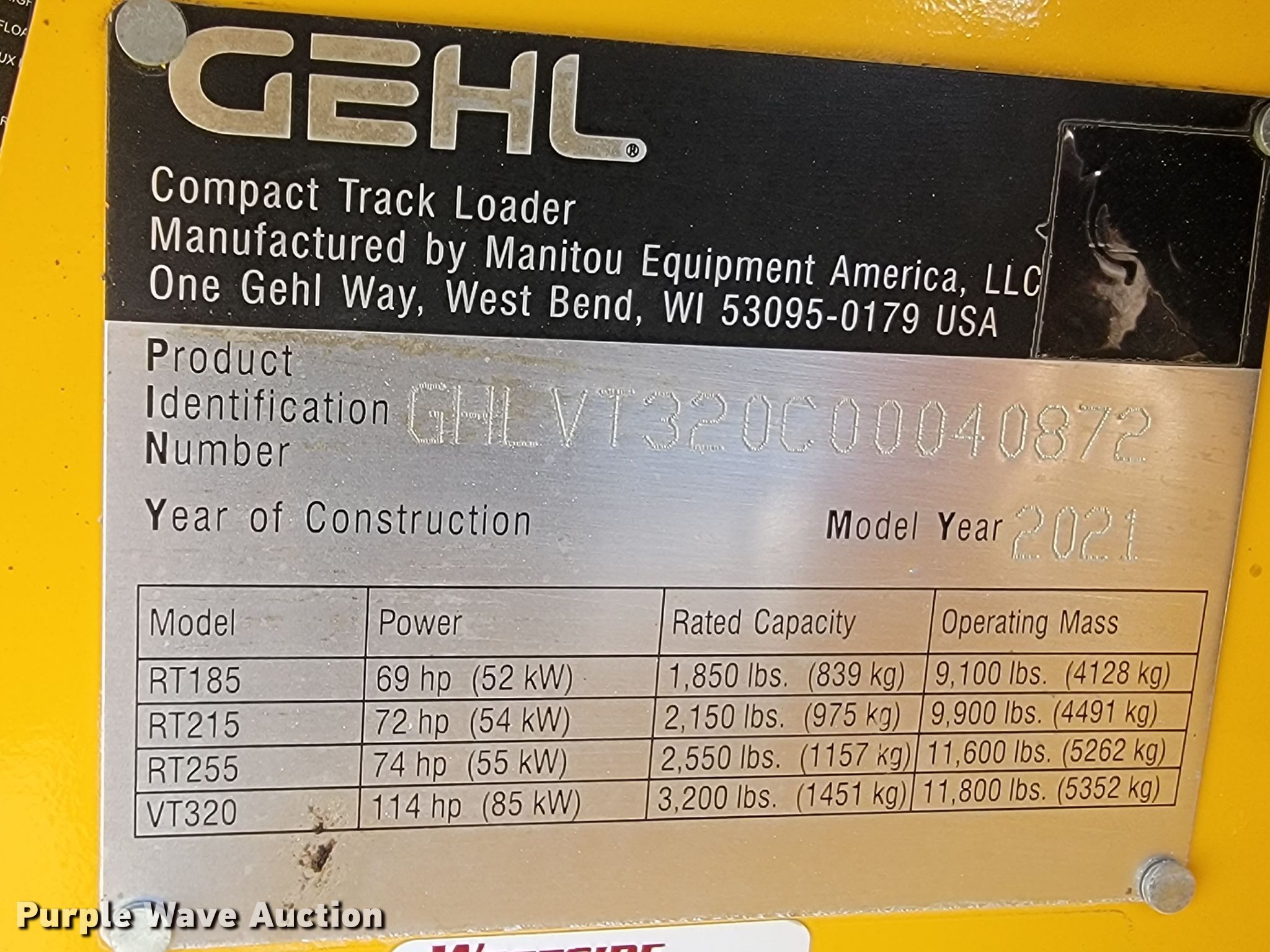 Purple Wave is selling a used Tracked Skid Steer Loader in South Dakota. This item is a 2021 Gehl VT320 tracked skid steer loader with the following: Hours: 953 on meter, Serial: GHLVT320C00040872