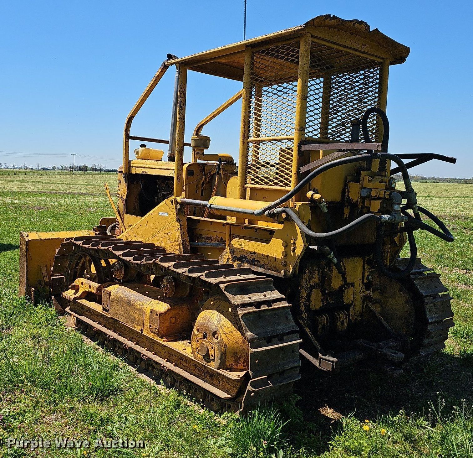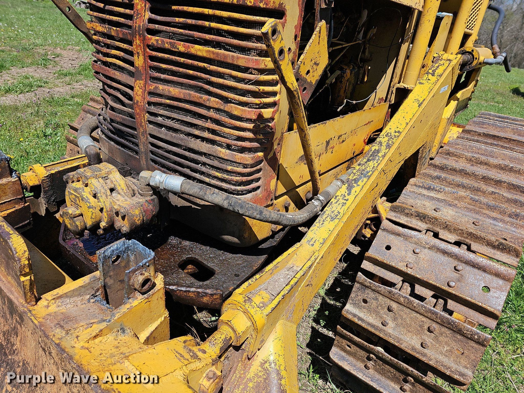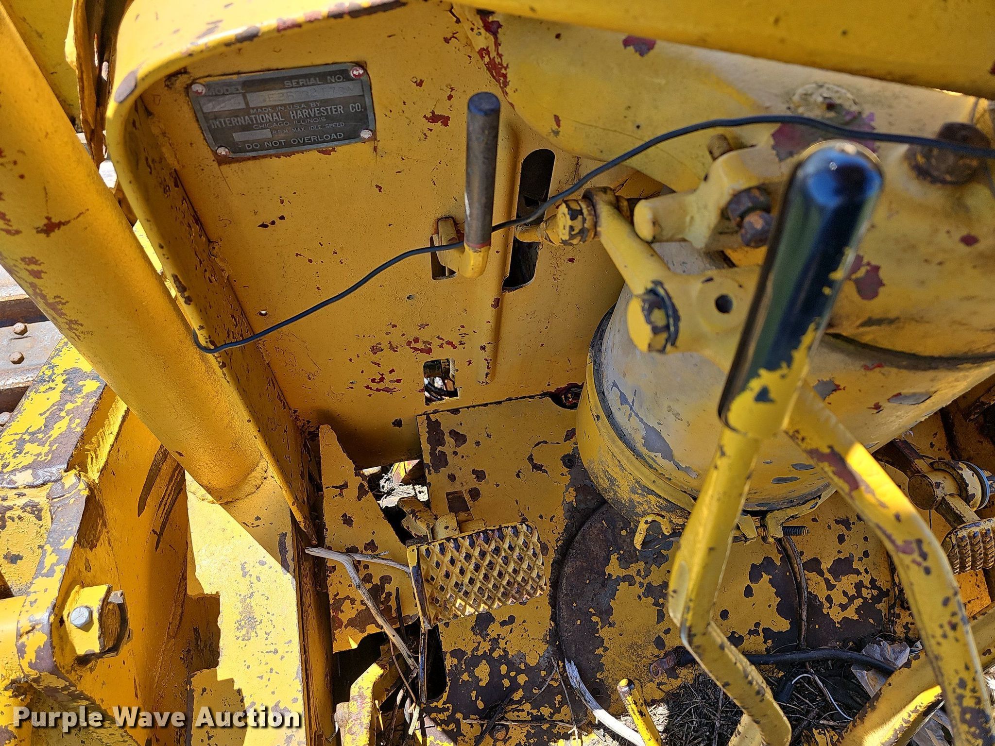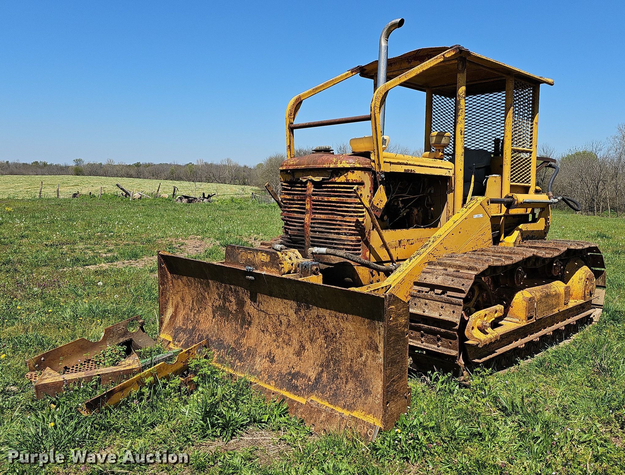 International Harvester TD14 dozer. Serial: TDF26032T7CM. Engine Cylinders: 4, Fuel type: Diesel. Transmission Direct-drive. Operators station Canopy. Features Dozer blade Type: Straight, Single-tilt, Width: 96" W. Tracks Width: 16", Bottom rollers: 4. Notes Unknown operating condition. Mareth Dairy. 7125 Farm Road 2057. Purdy, MO 65734