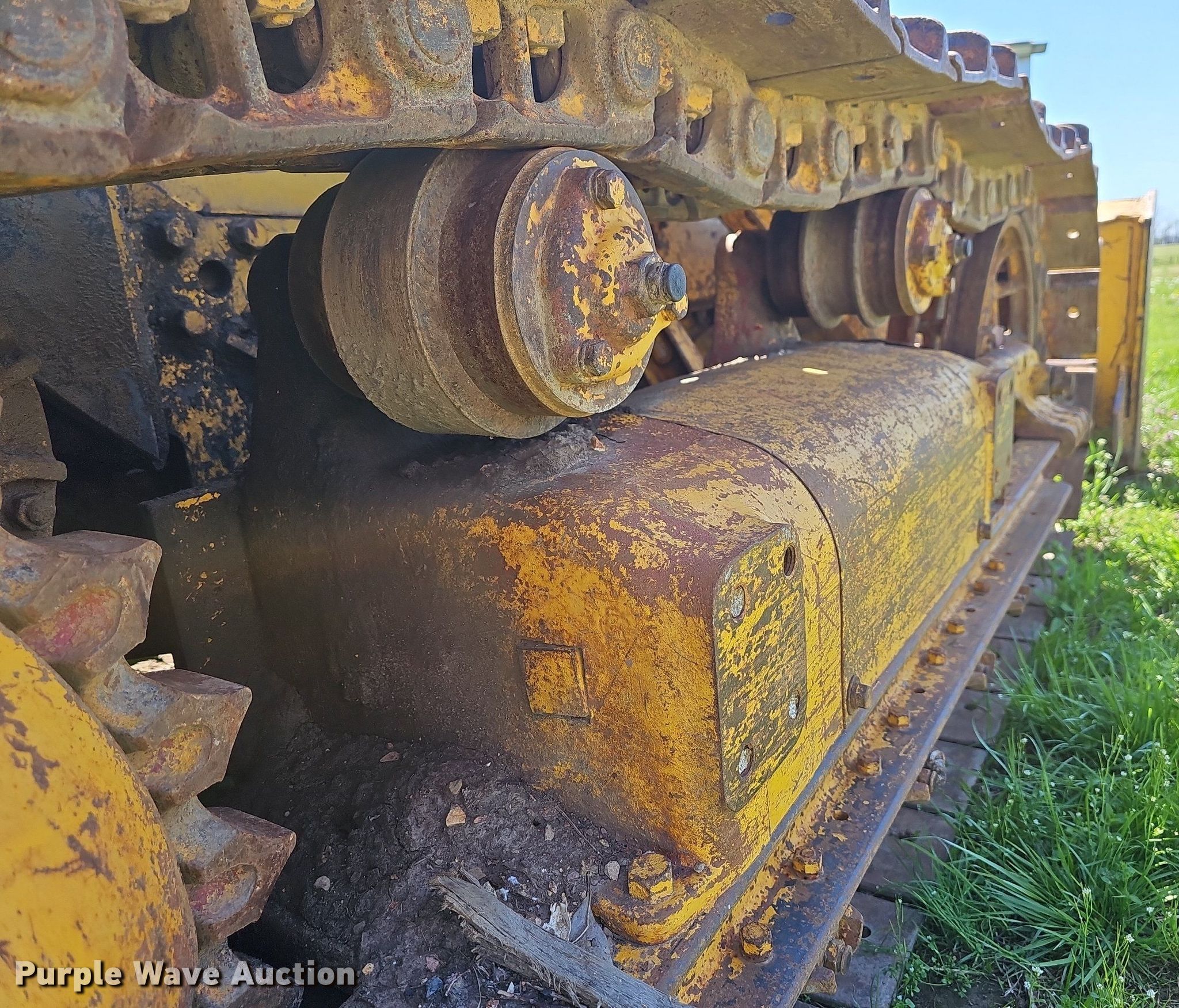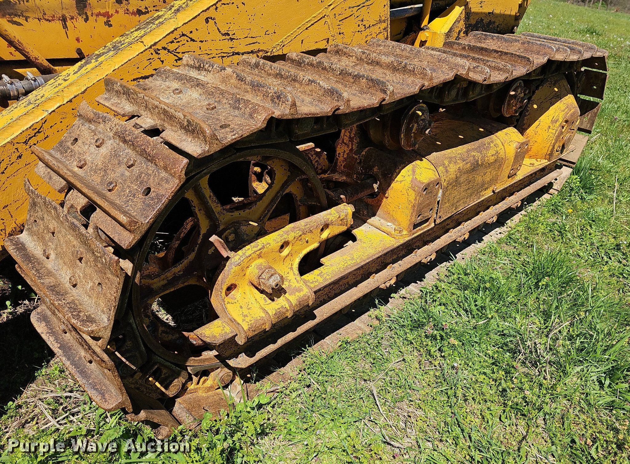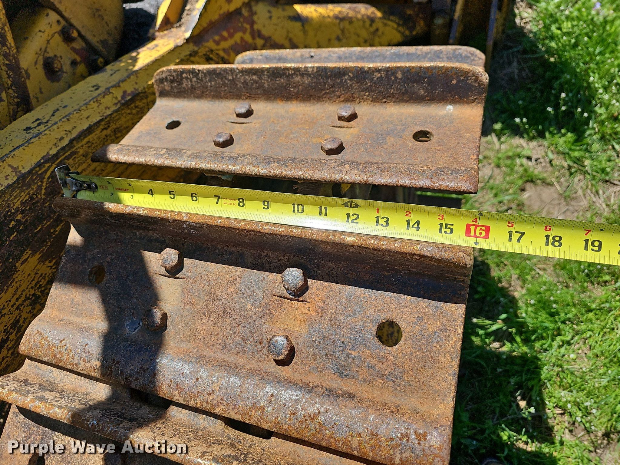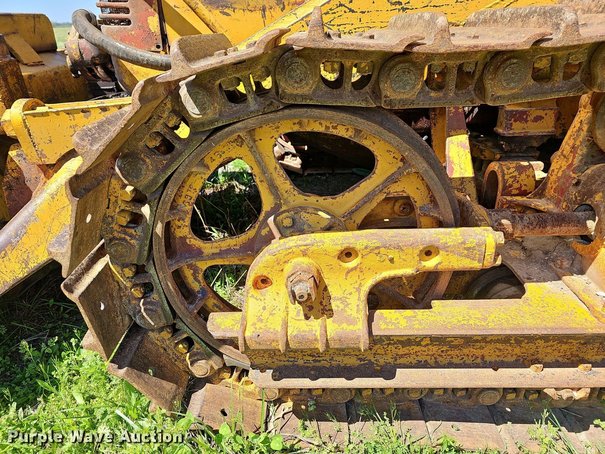 International Harvester TD14 dozer. Serial: TDF26032T7CM. Engine Cylinders: 4, Fuel type: Diesel. Transmission Direct-drive. Operators station Canopy. Features Dozer blade Type: Straight, Single-tilt, Width: 96" W. Tracks Width: 16", Bottom rollers: 4. Notes Unknown operating condition. Mareth Dairy. 7125 Farm Road 2057. Purdy, MO 65734