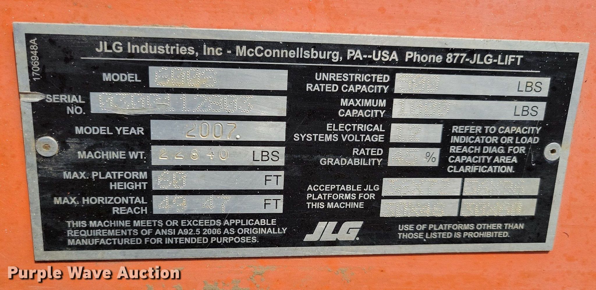Purple Wave is selling a used Boom Lift in Iowa. This item is a 2007 JLG 600S boom lift with the following: Hours: Unknown, Serial: 0300112803