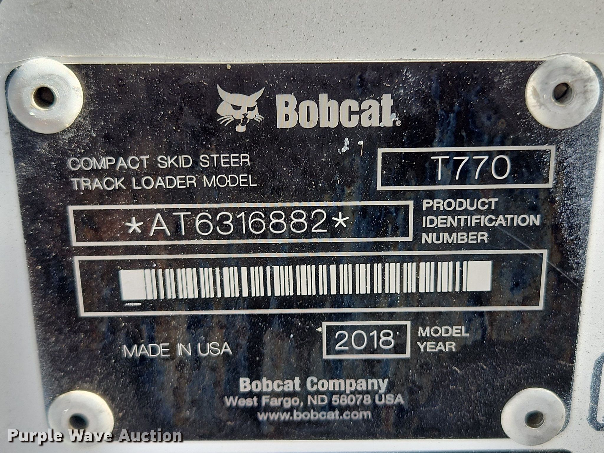 Purple Wave is selling a used Skid Steer Loader in Missouri. This item is a 2018 Bobcat T770 tracked skid steer loader with the following: Hours: 3,741 on meter, Serial: AT6316882