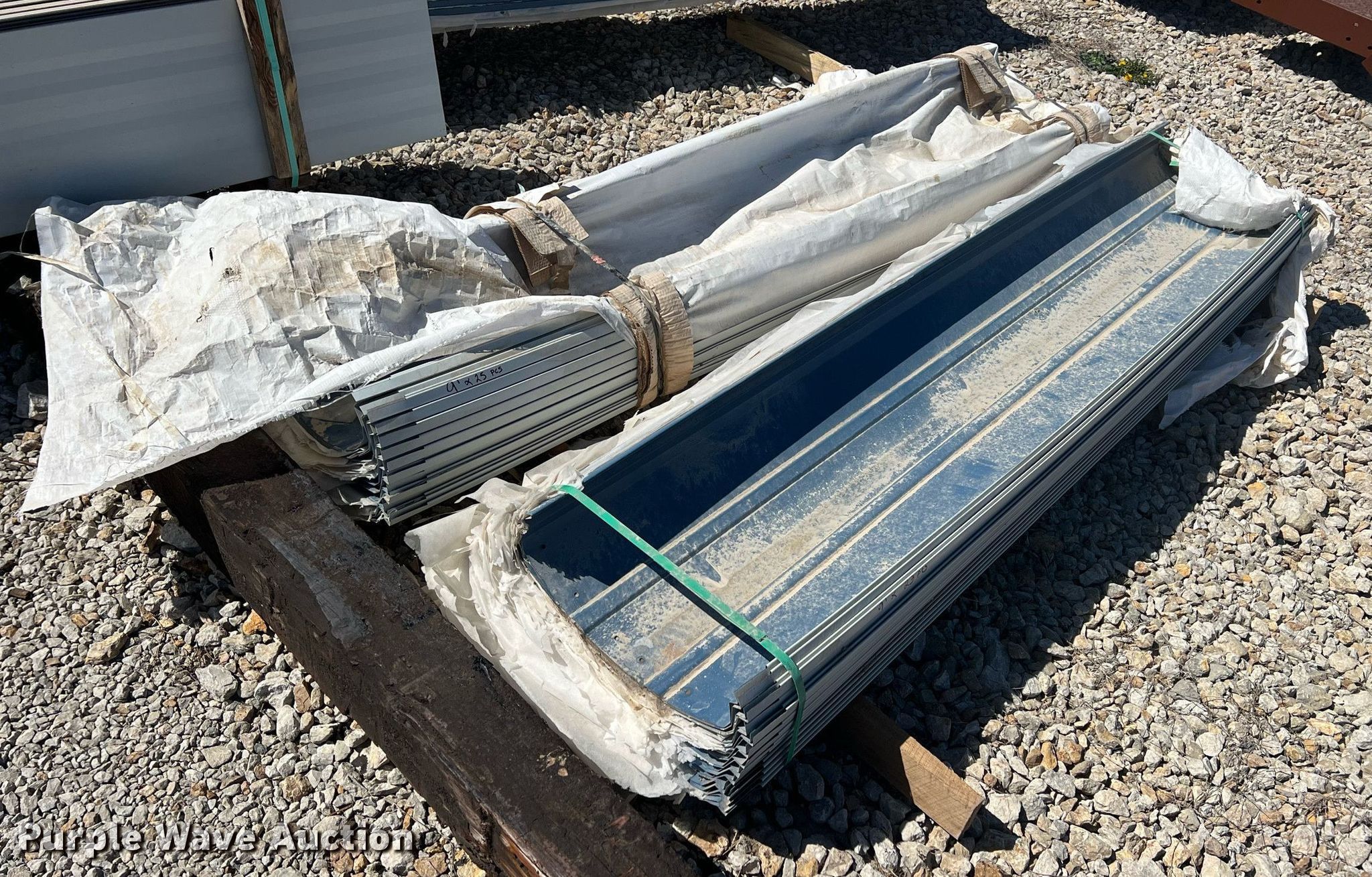 Purple Wave is selling a used Building Materials in Oklahoma. This item is a Building materials with the following: (26) pieces of 14' L sheet metal, Ridge caps, Standing seams and more