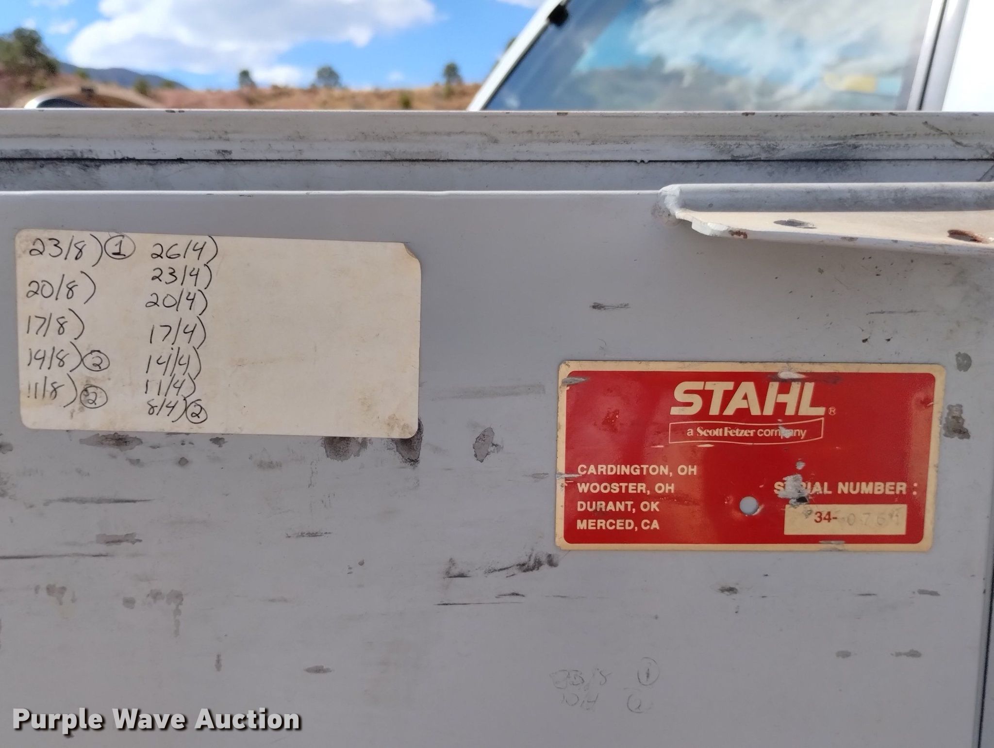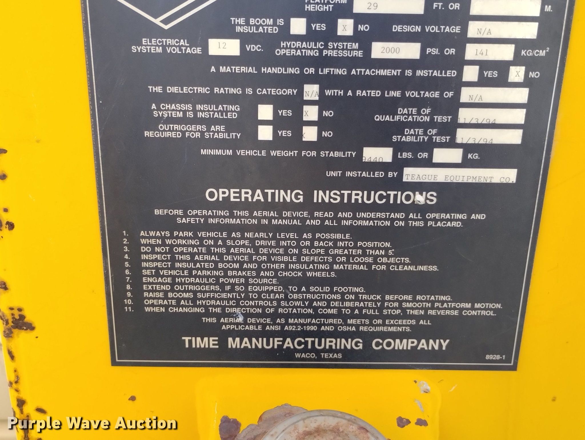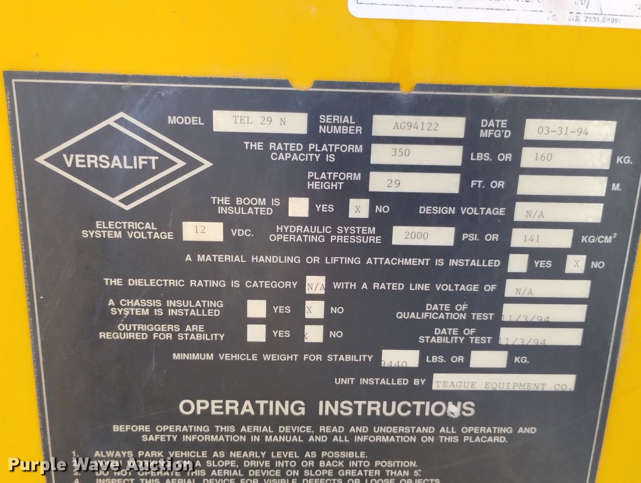 1994 GMC C3500 bucket truck. Miles: 152,750 on odometer, VIN: 1GDKC34N3RJ523393. Engine Displacement: 7.4L, Cylinders: 8, Fuel type: Gas. Transmission Automatic. Chassis Axles: Single, Suspension: Spring, Brakes: Hydraulic. Interior AC, Heat. Features Bed Stahl , 9' 6" L x 91" W, Engine Onan, Cylinders: 2, Fuel: Gas, Boom Versalift Tel 29N, Serial: AG94122, Mast height: 29', Maximum lift capacity: 350 lbs, Boom type: Articulating, Telescopic, Man basket, Boom controls Platform/ basket.. Tires Size: 225/70R19.5. Notes Unknown operating condition of AC. Colorado title. Title distribution may be delayed up to 14 days from verification of funds. City of Manitou Springs. 199 Banks Place. Manitou Springs, CO 80829