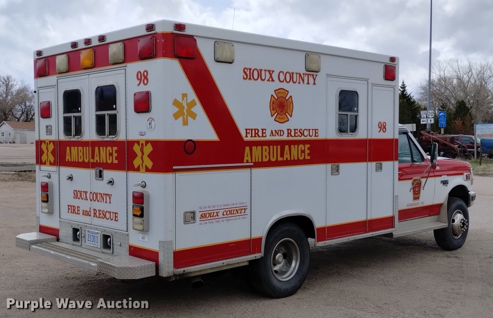 1996 Ford F350 XLT ambulance. Miles: 184,392 on odometer, VIN: 1FDKF38F2TEB33573. Engine Displacement: 7.3L V8 OHV, Cylinders: 8, Fuel type: Diesel. Transmission Automatic. Chassis Four wheel drive, Axles: Single, Suspension: Spring, Brakes: Hydraulic. Interior AC, Heat, Cruise control. Features Ambulance body PA/ siren controls. Tires Size: 235/85R16. Notes Dead battery. Nebraska title. Title distribution may be delayed up to 14 days from verification of funds. Village of Harrison. 560 U.S. 20. Harrison, NE 69346