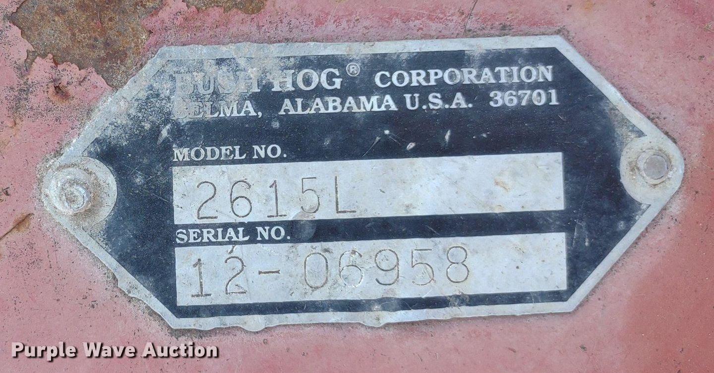 Purple Wave is selling a used Mower, Cutter, Shredder in Kansas. This item is a Bush Hog 2615 Legend batwing rotary mower with the following: Serial: 12-06958