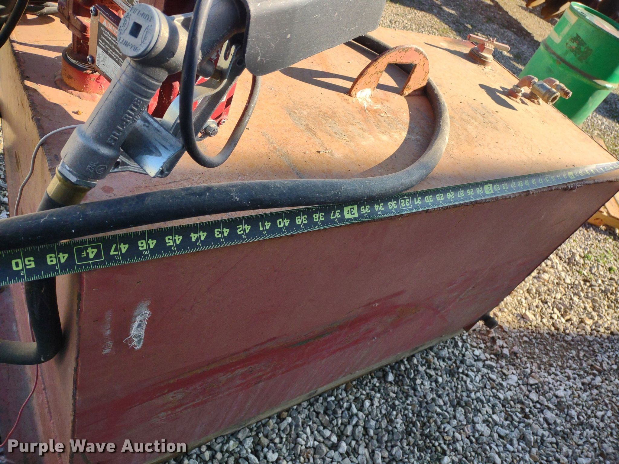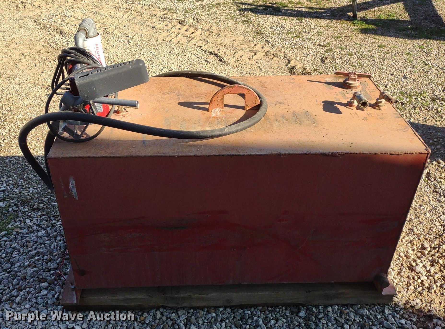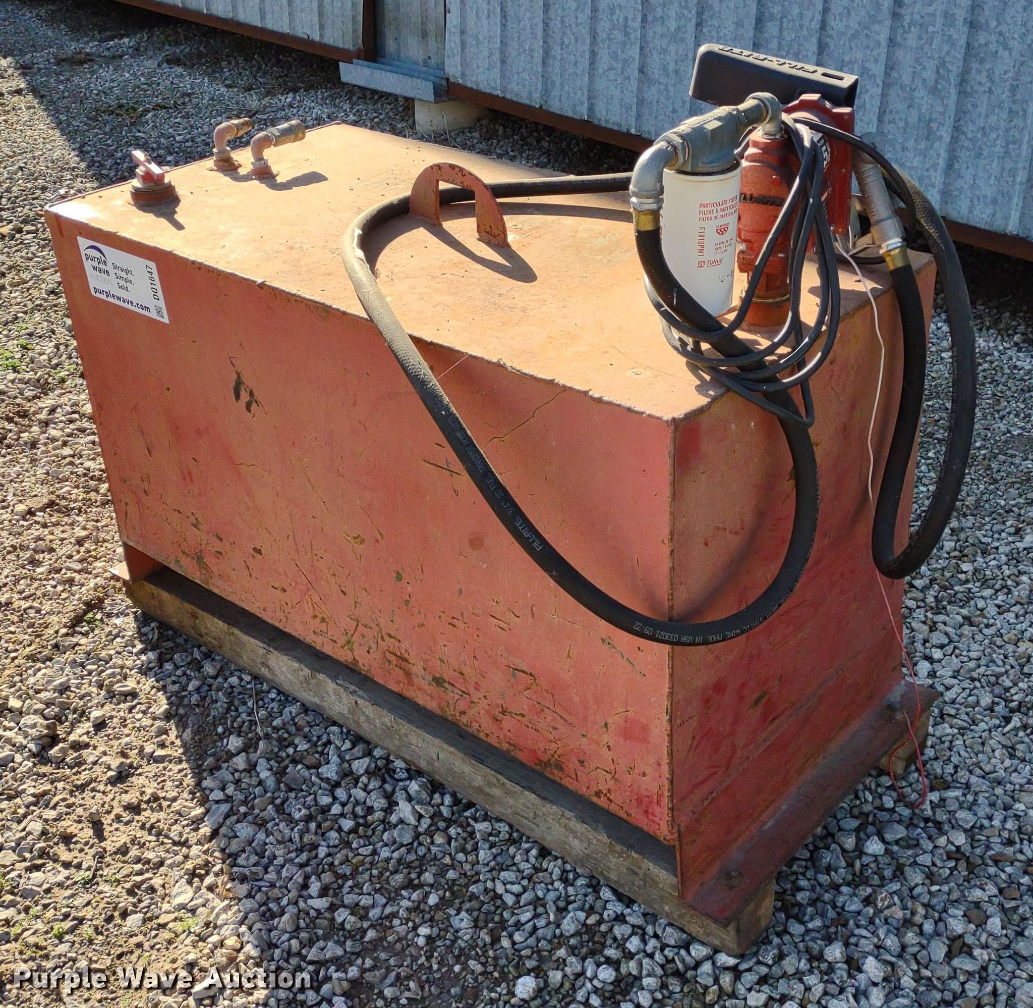 Purple Wave is selling a used Tanks in Kansas. This item is a Fuel tank with the following: Dimensions: 4' x 2' x 2', Fill-Rite pump, GPM: 15, Volt: 12, Previously used for off road diesel