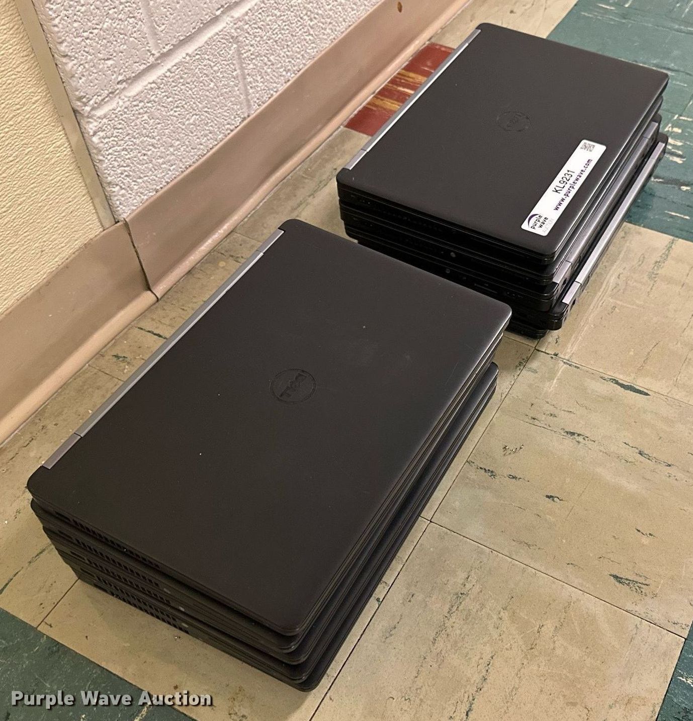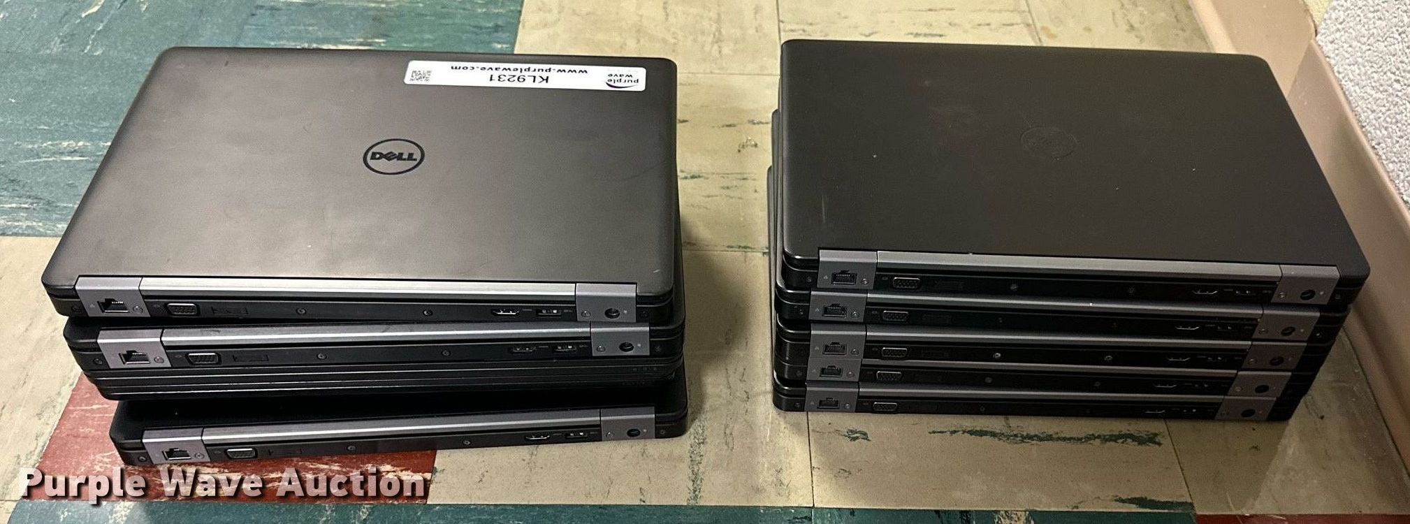 Purple Wave is selling a used Computers in Kansas. This item is a (10) Dell laptops with the following: RAM: 8GB, Intel 2.3GHZ processors, 500 GB HDD, 14" displays