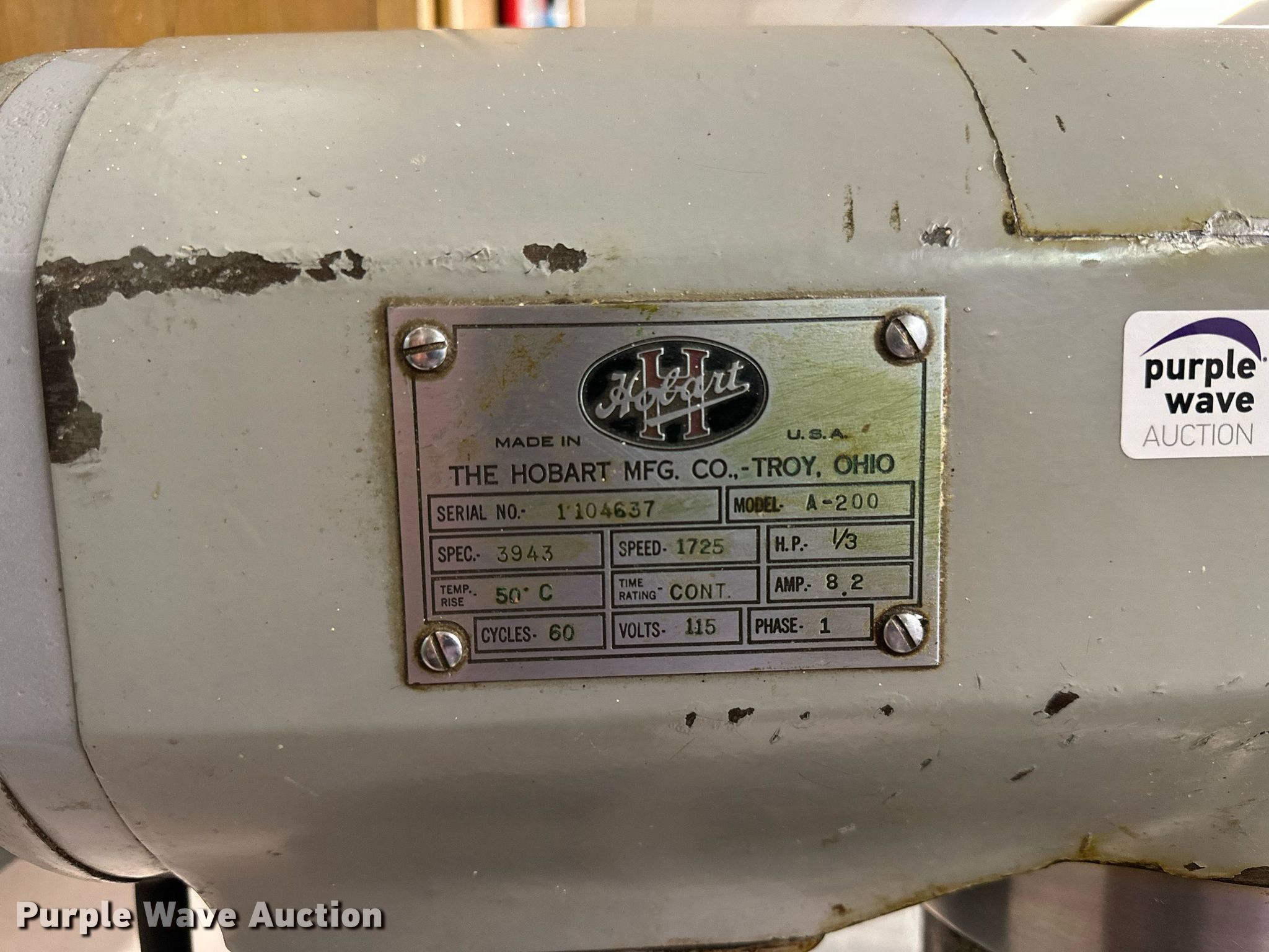 Purple Wave is selling a used Restaurant Equip. in Kansas. This item is a Hobart A-200 mixer with the following: Serial: 1104637, Amp: 8.2, Volts: 115, Phase: Single, Attachments included