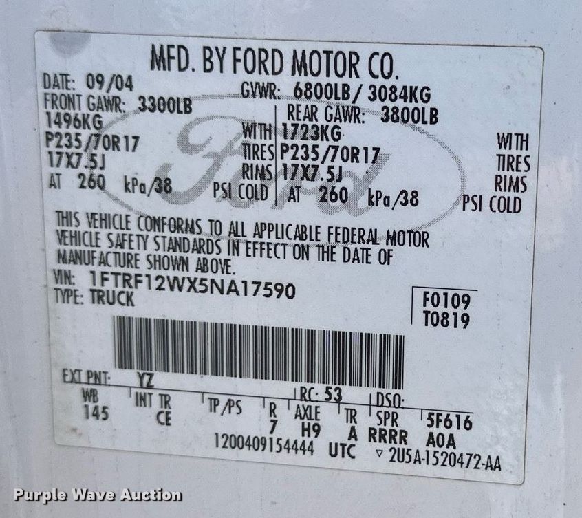 Purple Wave is selling a used 1/2 Ton Pickup or Van in Kansas. This item is a 2005 Ford F150 pickup truck with the following: Miles: 201,566 on odometer, VIN: 1FTRF12WX5NA17590
