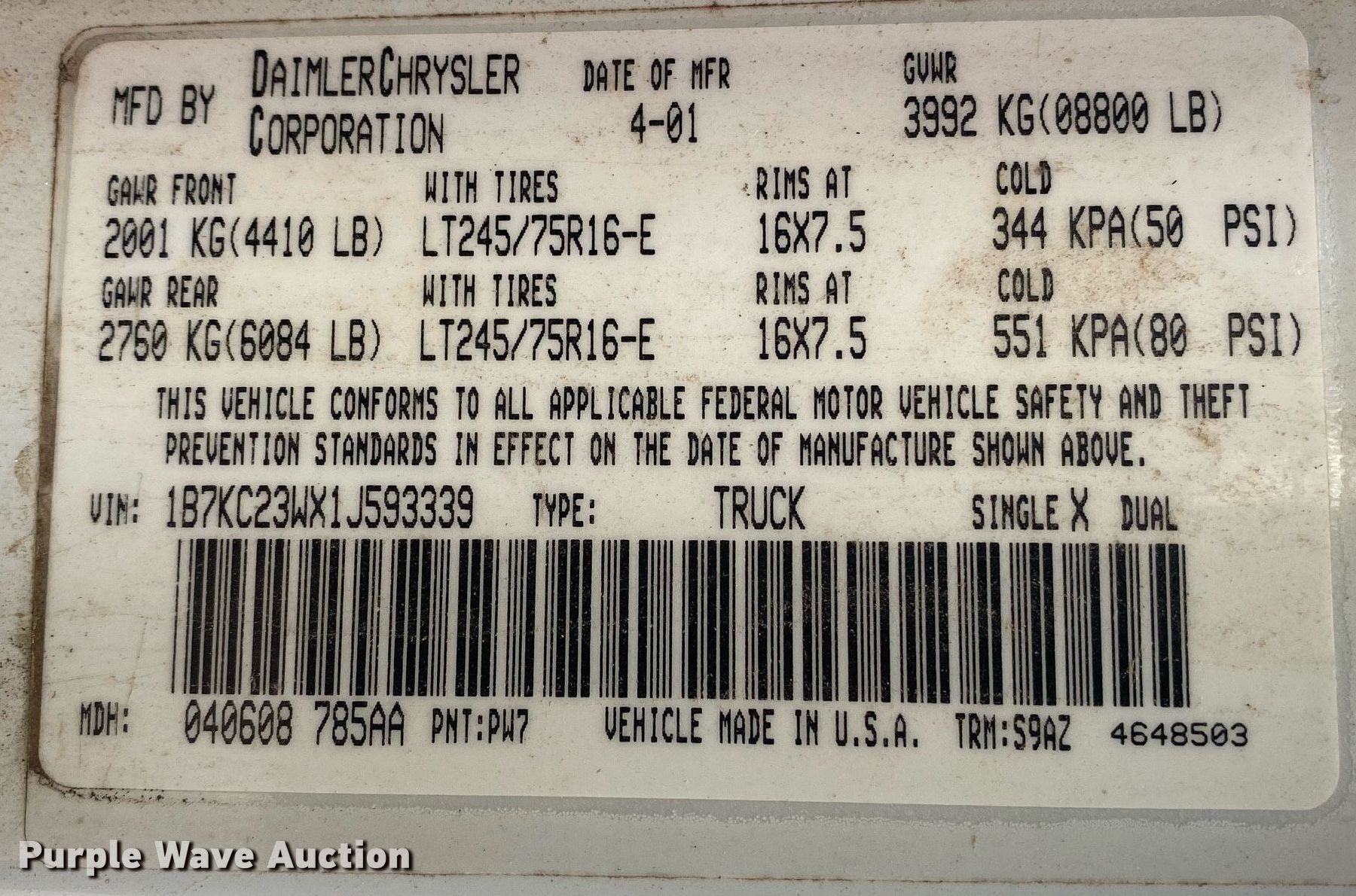 - VIN: 1B7KC23WX1J593339