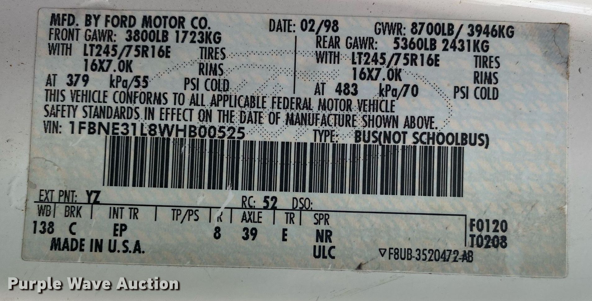Purple Wave is selling a used 1/2 Ton Pickup or Van in Oklahoma. This item is a 1998 Ford Club Wagon XLT van with the following: Miles: 163,248 on odometer, VIN: 1FBNE31L8WHB00525, Unit #: 830, Sale# 2340-KP