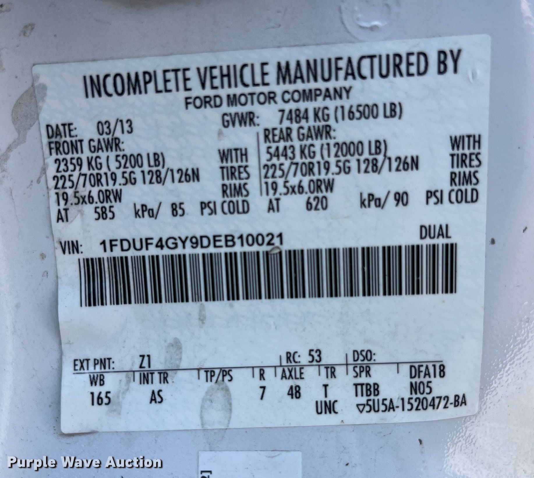 2013 Ford F450 Super Duty XL truck cab and chassis. Miles: 217,986 on odometer, VIN: 1FDUF4GY9DEB10021, Unit #: 8893. Engine Displacement: 6.8L V10 SOHC, Cylinders: 10, Fuel type: Gas. Transmission Automatic. Chassis Axles: Single, Suspension: Spring, Brakes: Hydraulic, Truck chassis: 131.5", GVWR: 16,500 lbs FAWR: 5,200 lbs, RAWR: 12,000 lbs, Wheelbase: 165". Interior AC, Heat, Cruise control. Features Fuel tank: Single. Tires Size: 225/70R19.5. Notes Dash warning indicator: Check engine, Transmission issues. Missouri title. Title distribution may be delayed up to 14 days from verification of funds. Missouri Department of Transportation (MODOT). 1711 S US-61. Hannibal, MO 63401