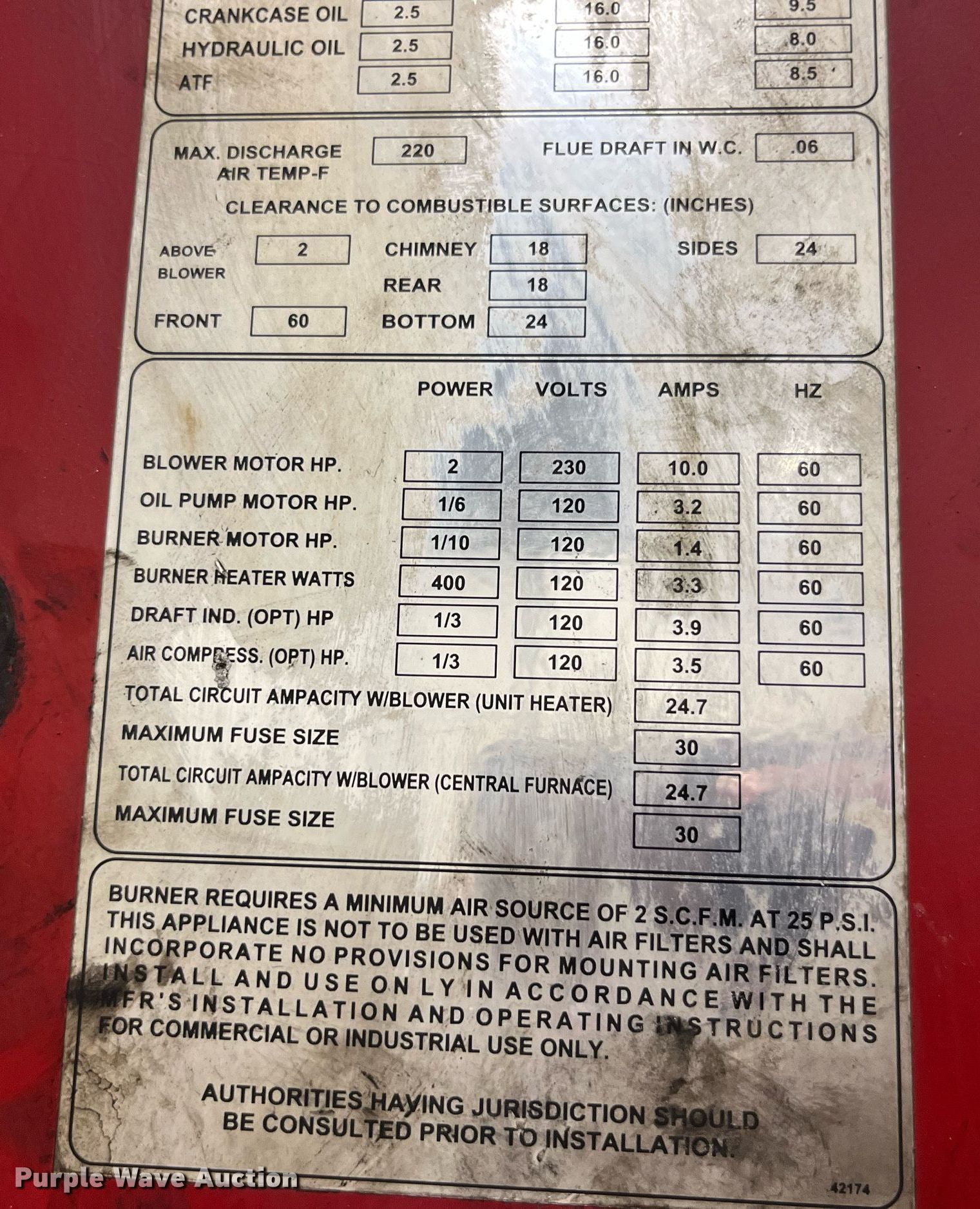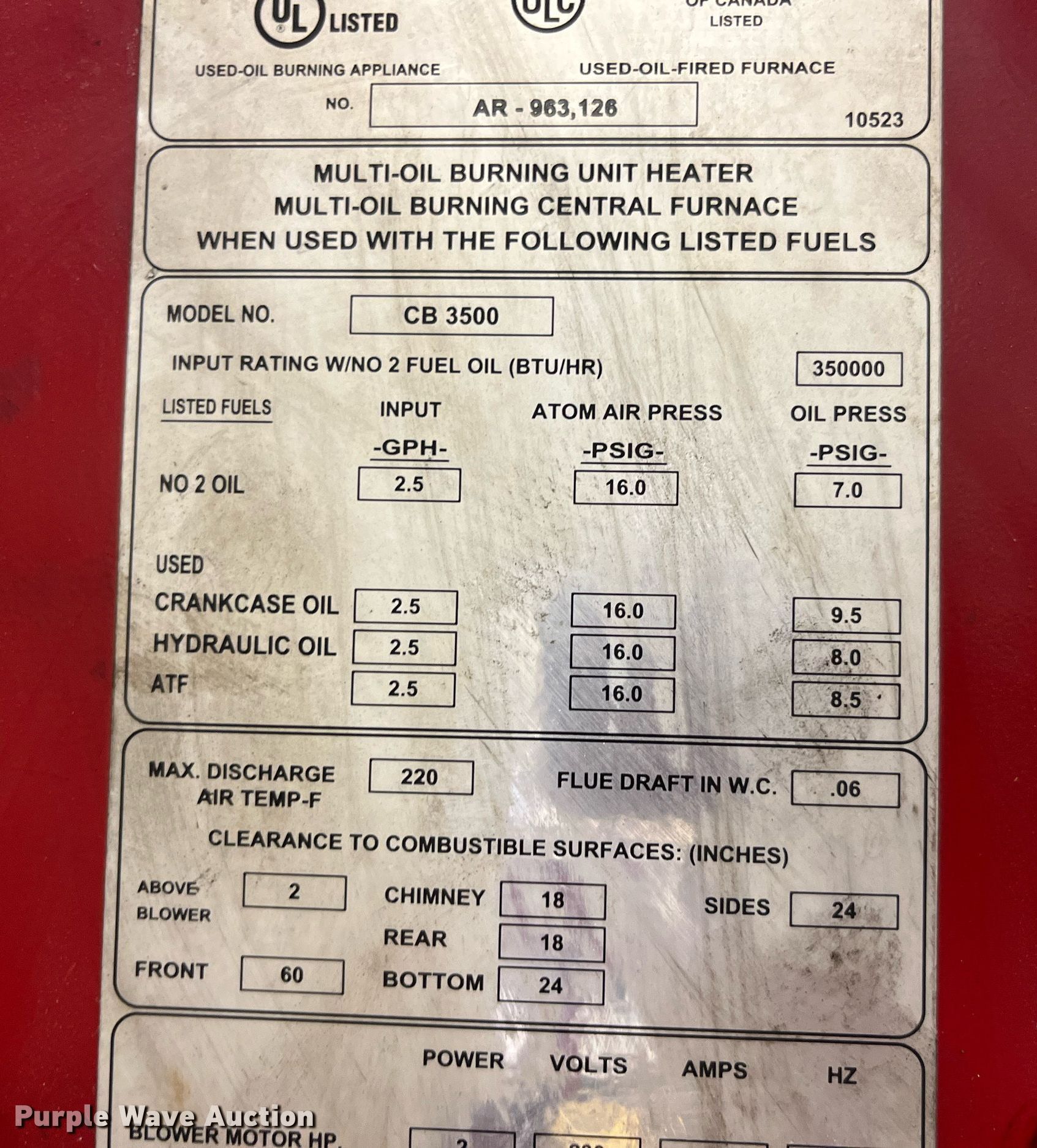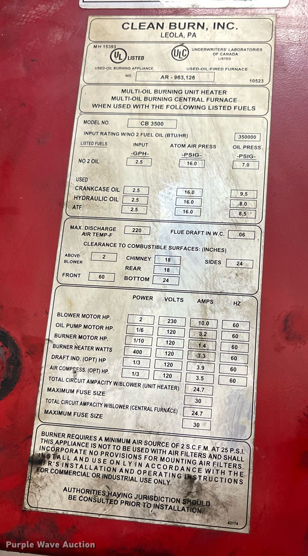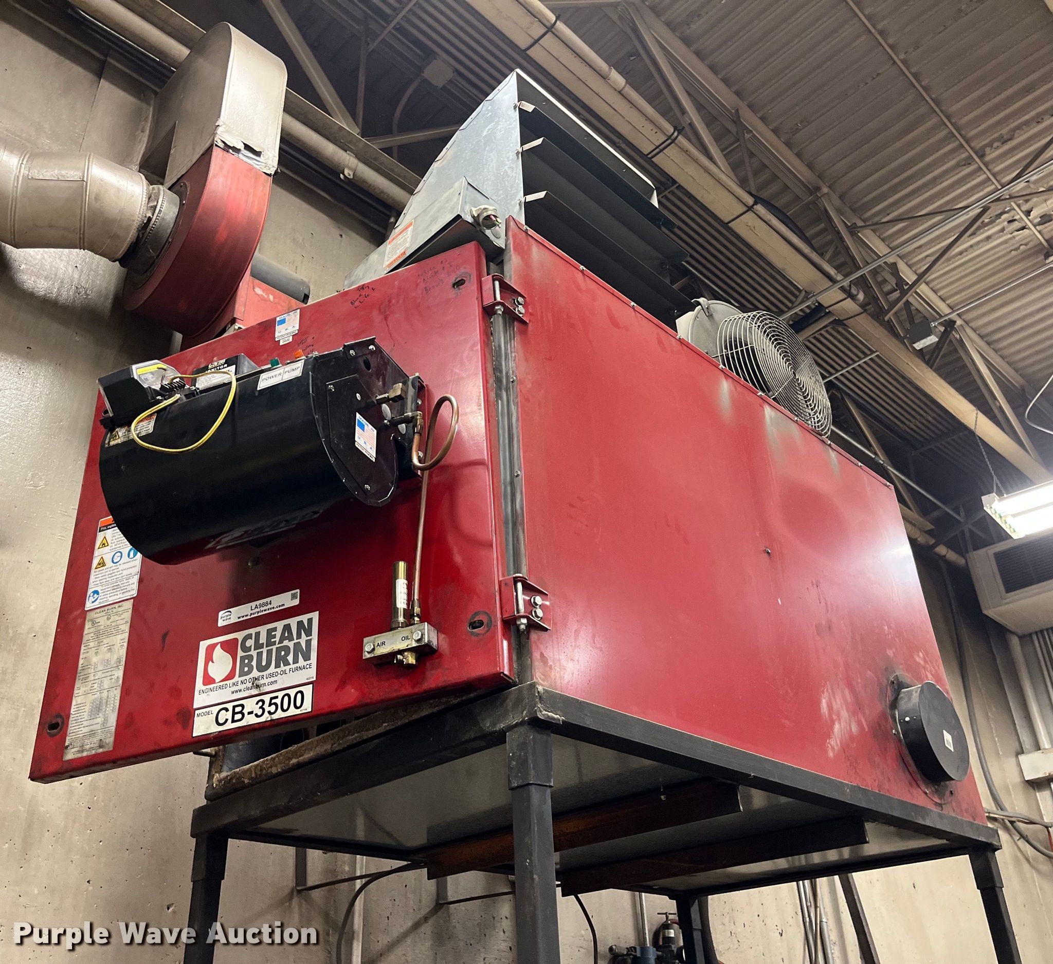 Purple Wave is selling a used Tools in Missouri. This item is a Clean Burn CB-3500 oil burner with the following: BTU: 35,000, Volts: 120, Heat exchange issues, Stand not included