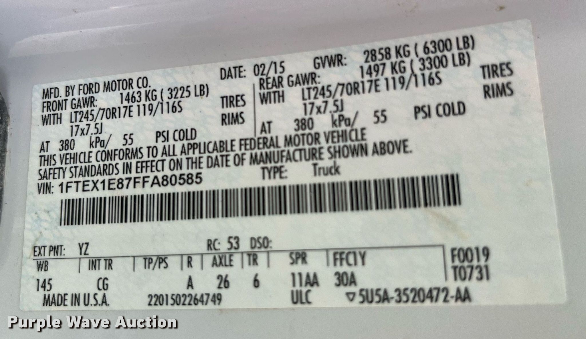 2015 Ford F150 XL SuperCab pickup truck. Miles: 238,931 on odometer, VIN: 1FTEX1E87FFA80585, Unit #: B7269. Engine Displacement: 3.5L V6 DOHC, Cylinders: 6, Fuel type: Gas. Transmission Automatic, Four wheel drive. Interior AC, Heat, Power windows, Power locks, Cruise control. Tires Size: 245/75R17. Notes Dash warning indicator: TPMS, Non-operational bed cover. Missouri title. Title distribution may be delayed up to 14 days from verification of funds. Missouri Department of Transportation (MODOT). 26826 US Hwy 63. Macon, MO 63552