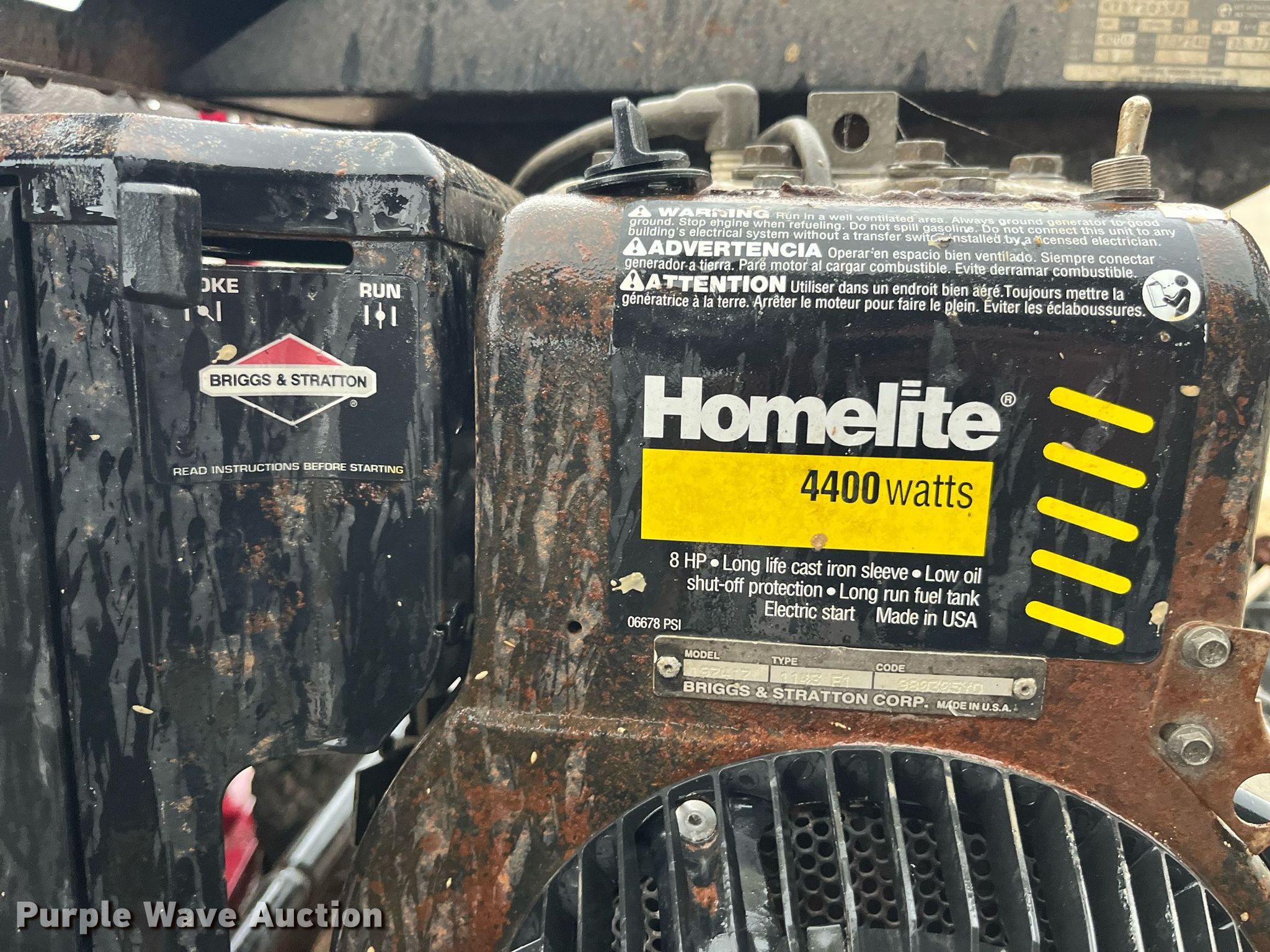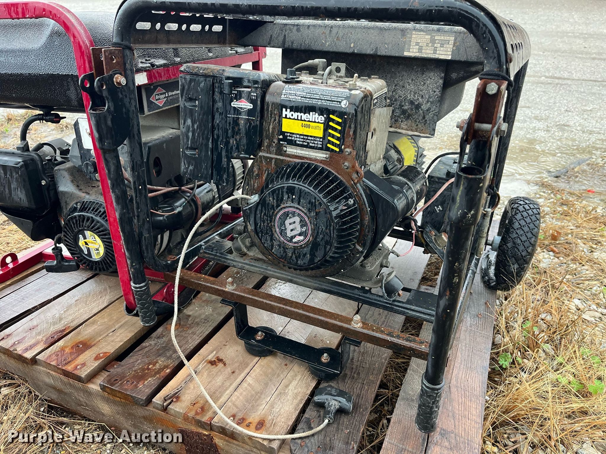 Purple Wave is selling a used Generator Set in Missouri. This item is a (2) generators with the following: Homelite LRE4400, 120/240 volt, Single phase, Briggs & Stratton single cylinder gas engine, Briggs & Stratton 01893, 120/240 volt, Briggs & Stratton single cylinder gas engine