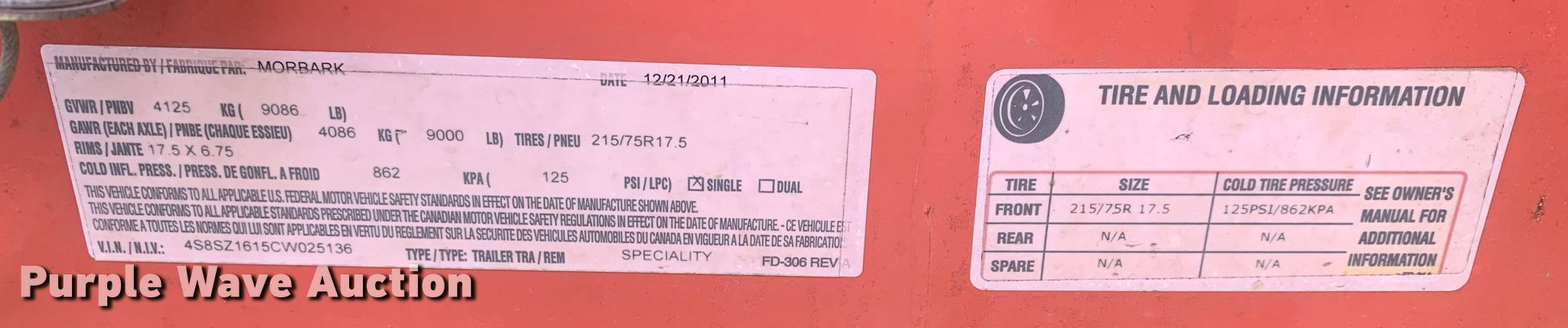 2012 Morbark Beever M15R wood chipper. Hours: 383 on meter, VIN: 4S8SZ1615CW025136. Engine Caterpillar C4.4 Acert, Cylinders: 4, Fuel type: Diesel. Features Capacity: 19", Throat opening: 20" x 20", Auto feed. Tires Size: 215/75R17.5. Trailer 2012 Morbark, 19' L x 94" W, Suspension: Spring, Brakes: Electric, Axles: Single, Tire size: 215/75R17.5, GVWR: 9,086 lbs, GAWR: 9,000 lbs. Transfer of ownership documentation will be a bill of sale. Shelby County Precinct Barn 4. 13321 State Highway 87 North. Timpson, TX 75975