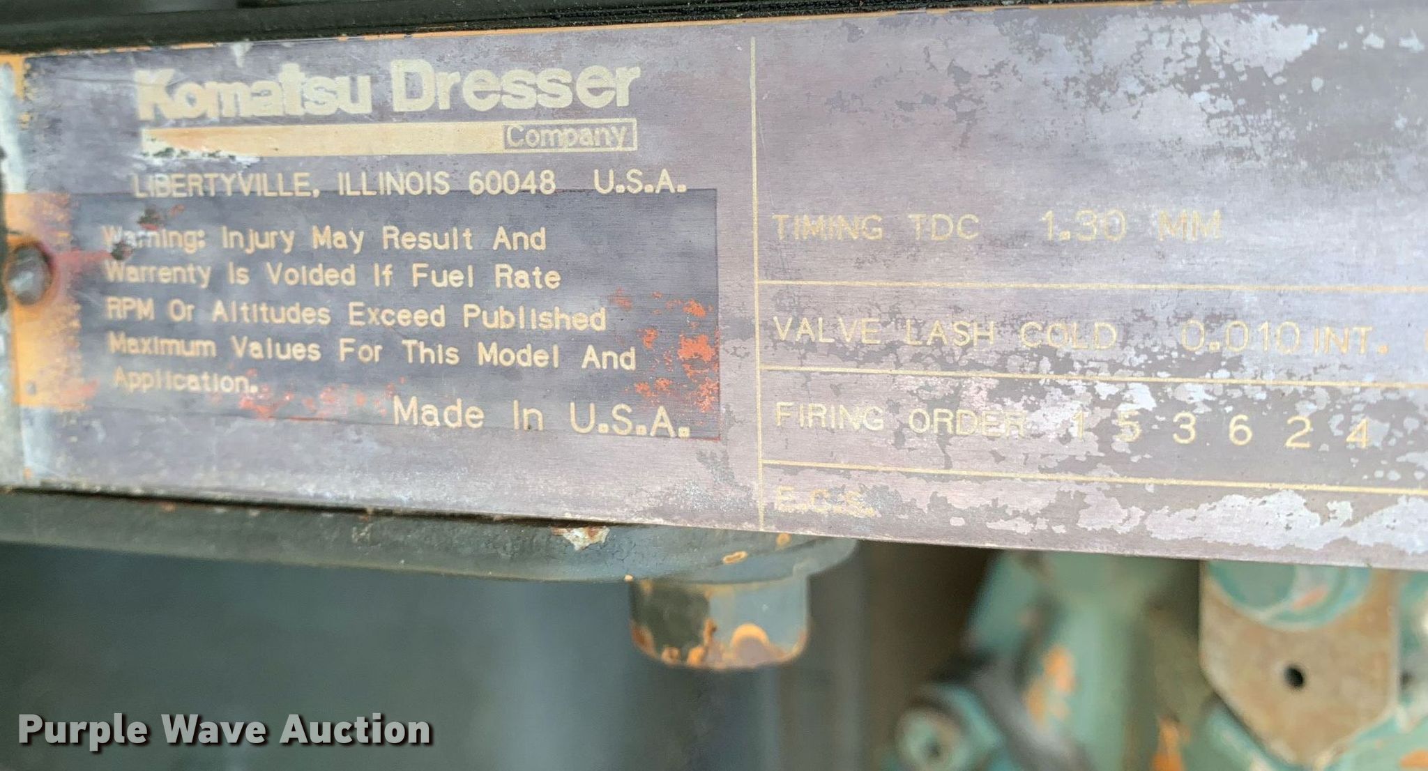 1991 Dresser 520C wheel loader. Hours: 1,689 on meter, Serial: 3600013C008231. Engine Komatsu Dresser, Serial: 44557339, Cylinders: 6, Fuel type: Diesel, HP: 152. Transmission Powershift, 3F - 3R. Chassis Differential lock: Front. Operators station Enclosed cab, Heat, Bucket controls: Two-lever. Features Counter weights, Bucket Width: 96", Four-in-one, Cutting edge: Bolt-on. Tires Size: 17.5-25. Notes Glass cracked, Possible transmission issues Non-operational third gear. Delta County Precinct 3. 12198 Farm to Market 64. Pecan Gap, TX 75469