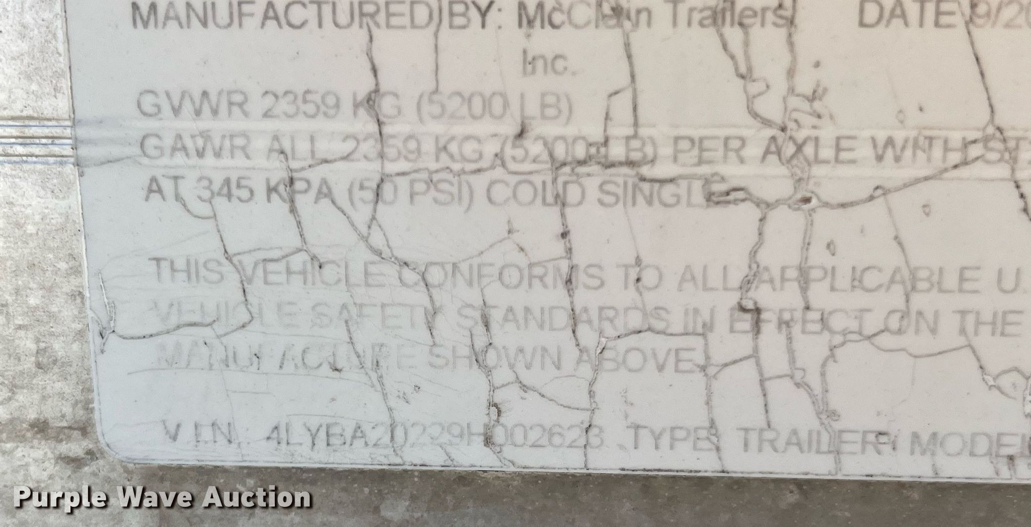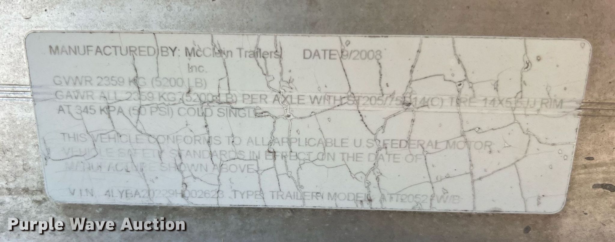 2008 McClain Trailers ATT2052 boat trailer. VIN: 4LYBA20229H002623. Dimensions Overall: 24' 6" L x 104" W. Features Deck type: Aluminum. Chassis Ball hitch: 2", Landing gear: Single, Brakes: Electric, Axles: Tandem, GVWR: 5,200 lbs. Tires Steel wheels, Size: ST205/75R15. Missouri title. Title distribution may be delayed up to 14 days from verification of funds. Osage County, MO. 106 East Main Street. Linn, MO 65051