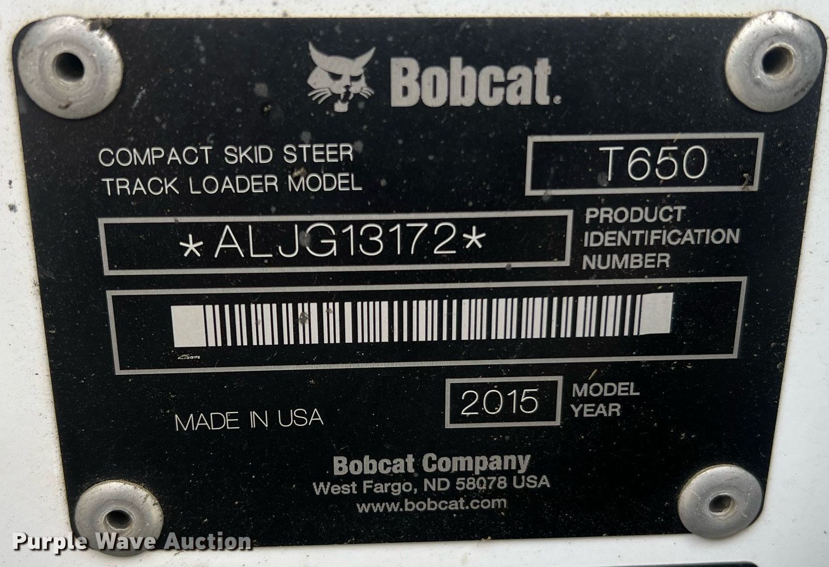 Purple Wave is selling a used Tracked Skid Steer Loader in Missouri. This item is a 2015 Bobcat T650 tracked skid steer loader with the following: Hours: 3,047 on meter, Serial: ALJG13172